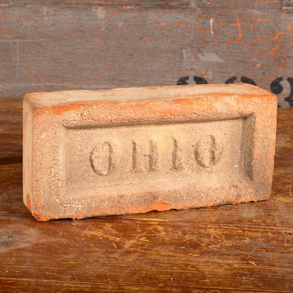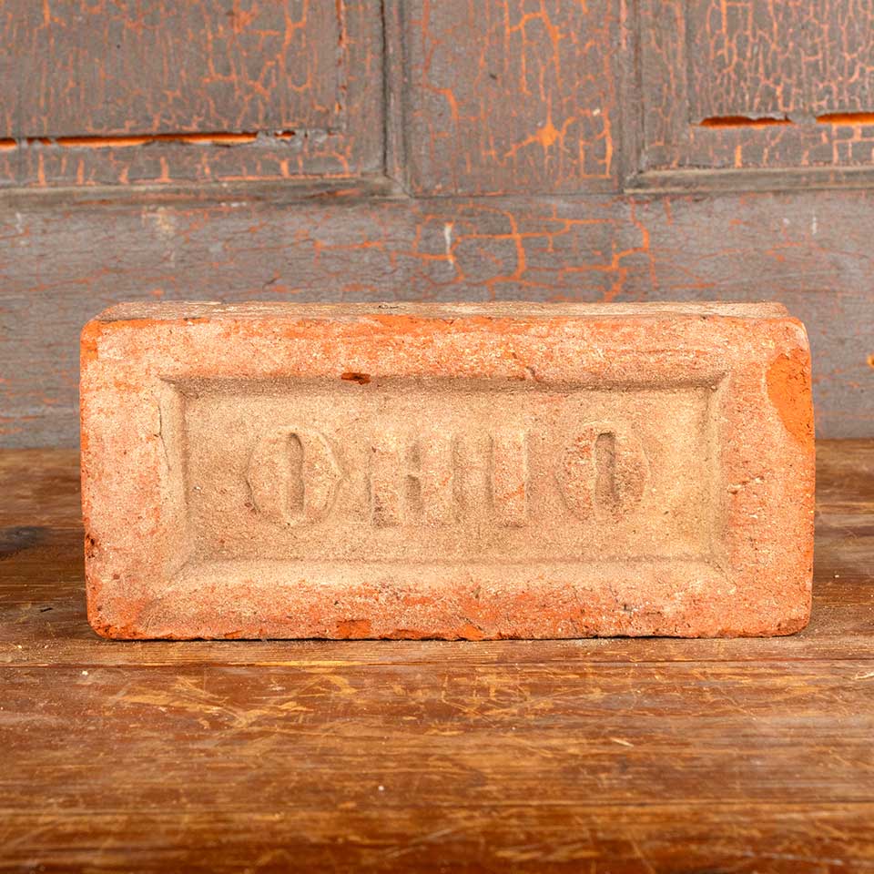Architectural salvage vintage paver brick with OHIO pattern measuring approx. 8" wide x 3 3/4" tall x 2 1/4" thick. Color and condition varies.