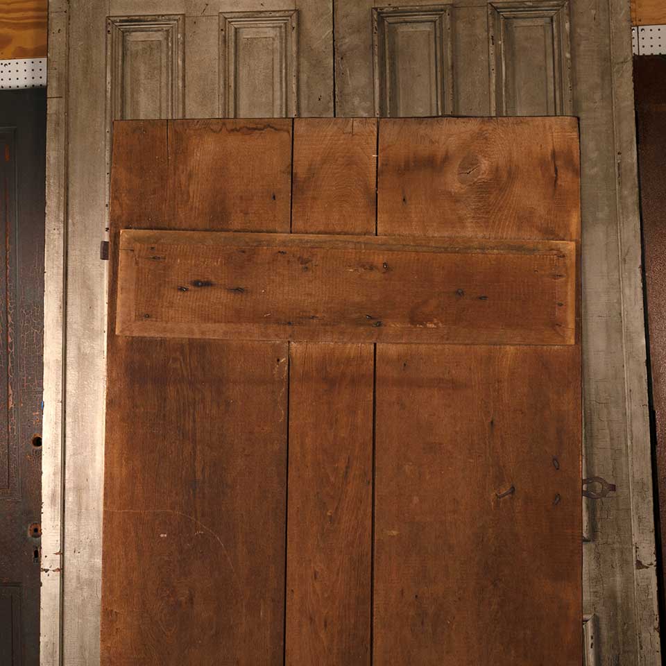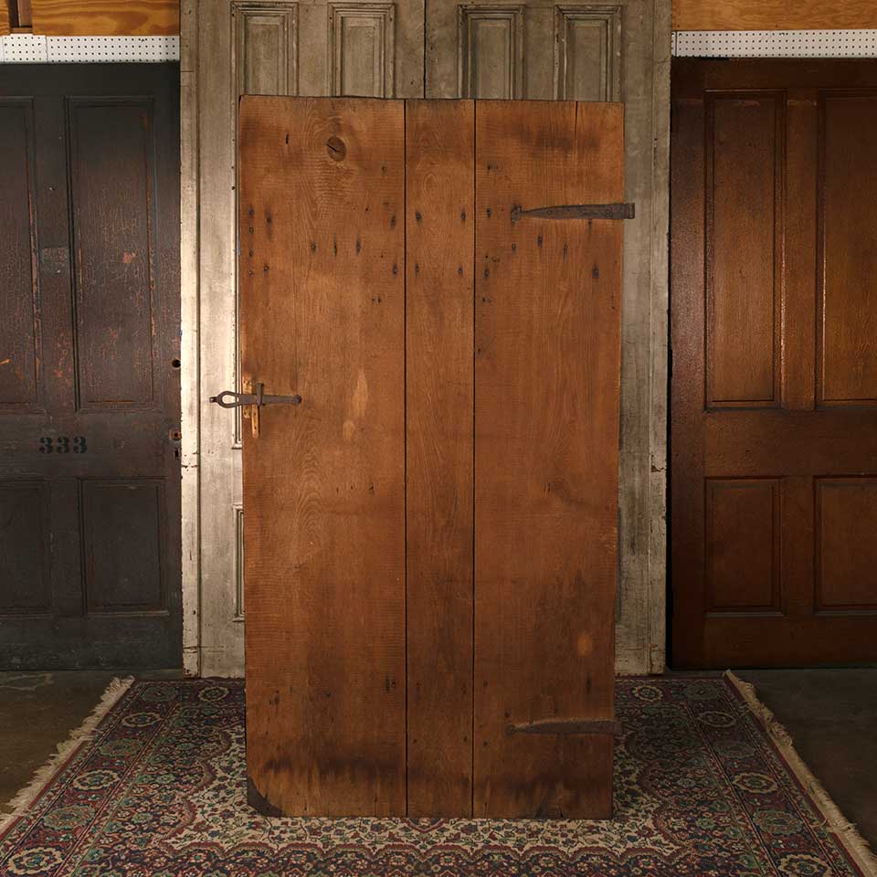 Architectural salvage antique rough sawn wood board barn door with wrought iron hardware measuring approx. 40 3/8" wide x 77 3/4" tall x 1" thick (plus 1" thick horizontal wood supports on back). See photos to evaluate condition.