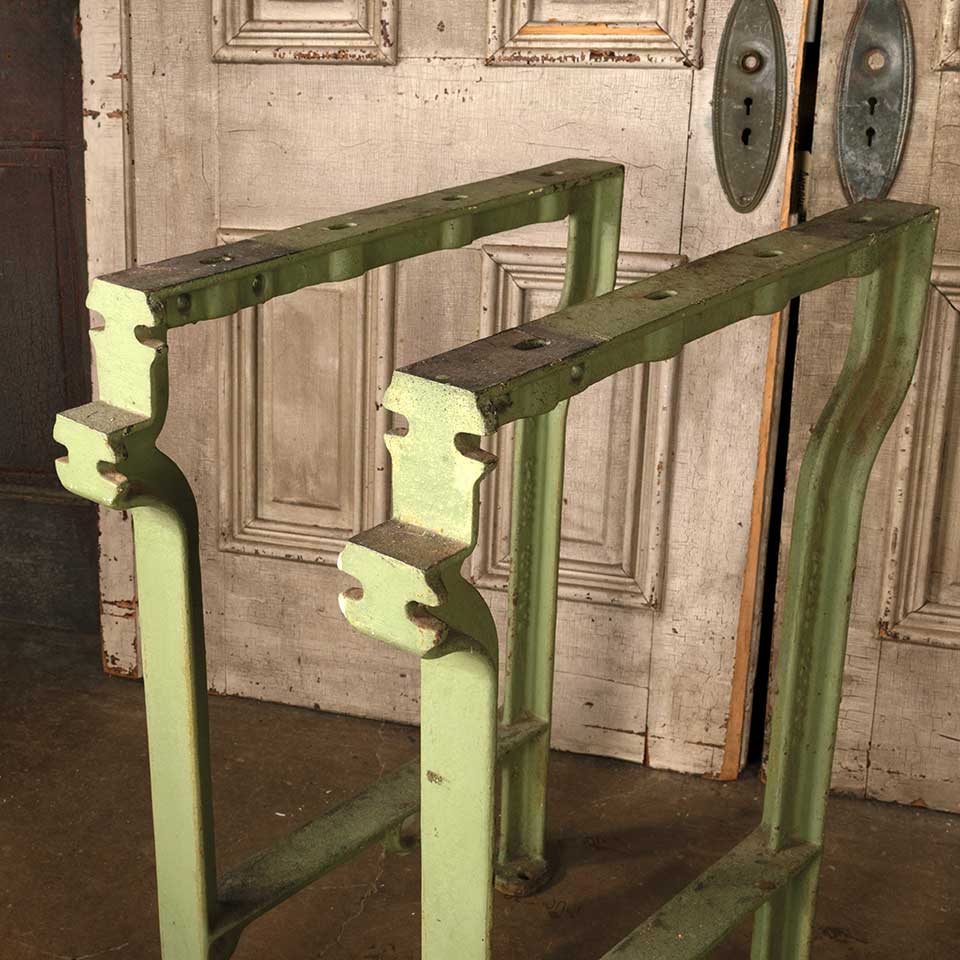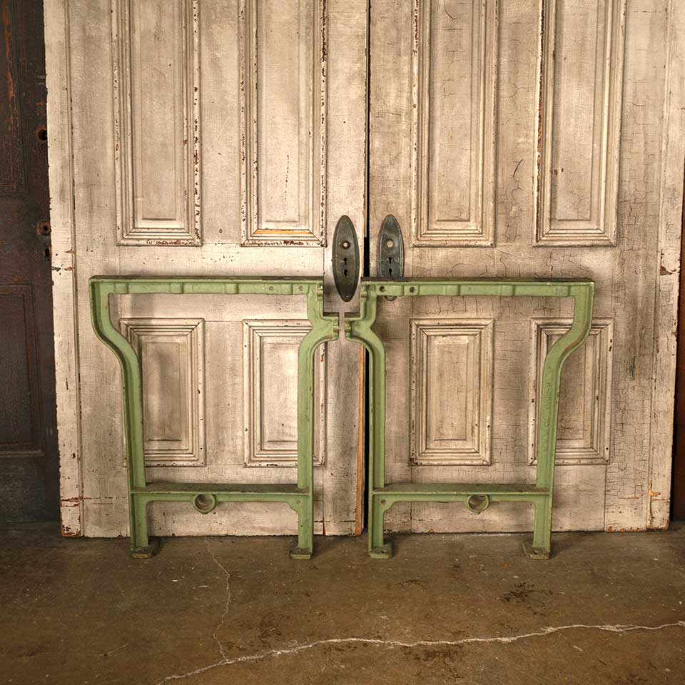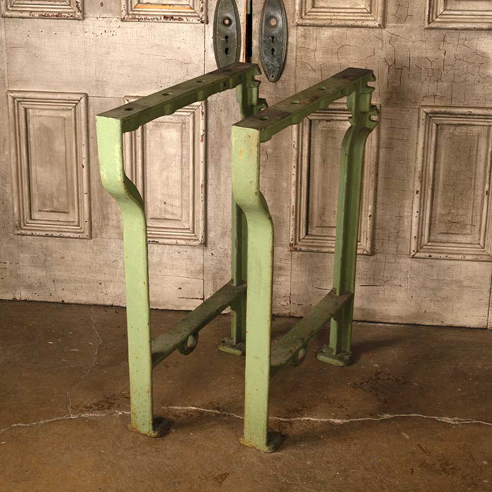 Set of two architectural salvage industrial cast iron table legs each measuring approx. 26 5/8" wide x 32 1/8" tall x 2 1/2" front to back. See photos to evaluate condition. Priced at $250 for the two piece set.