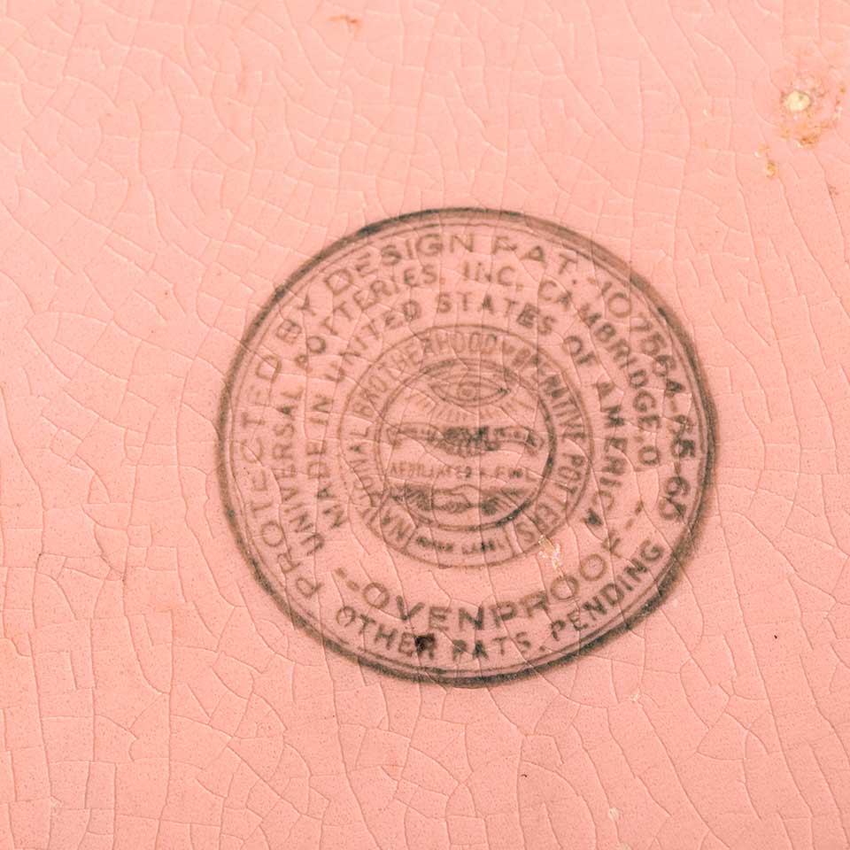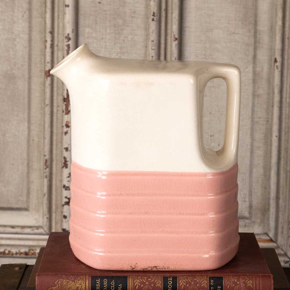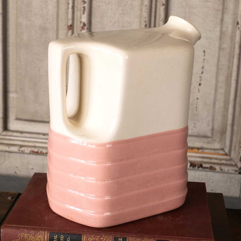 Vintage pink & white ceramic Universal Potteries Inc. refrigerator pitcher measuring approx. 4 3/4" wide x 8 1/4" tall x 7 1/4" front to back. There is a small chip on the spout. See photos to evaluate condition.