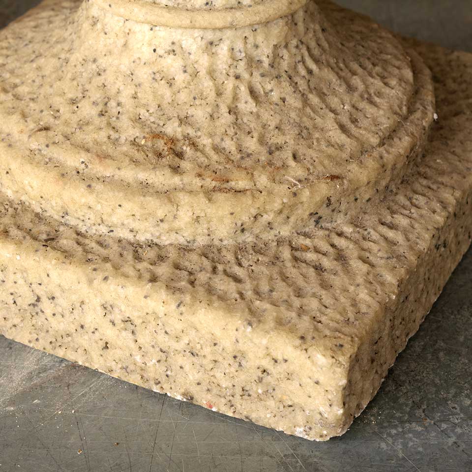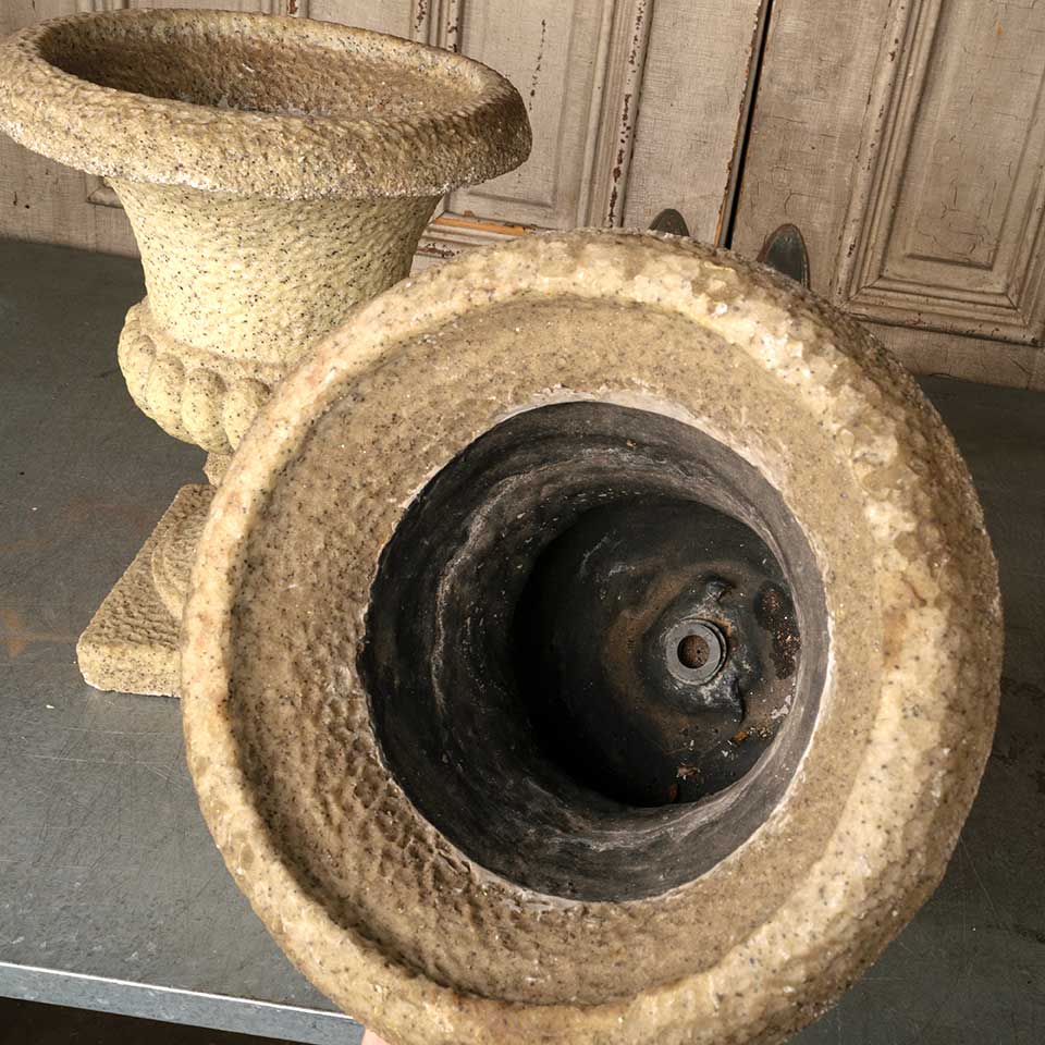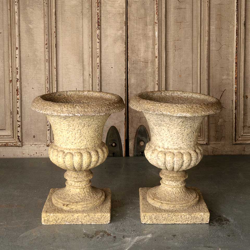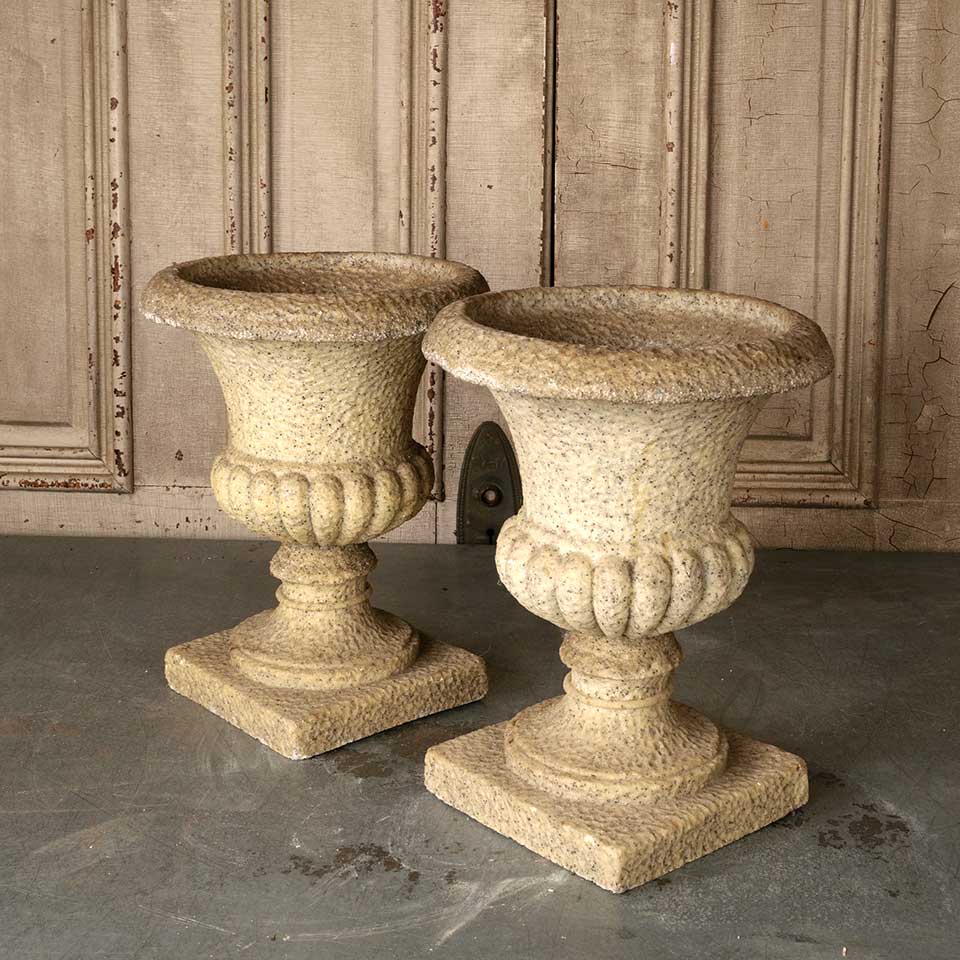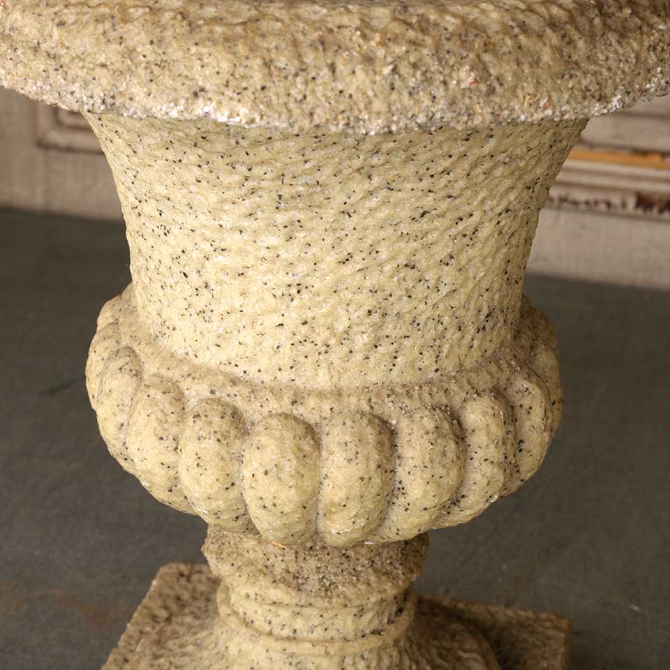 Set of two architectural salvage vintage resin garden patio urn planters each measuring approx. 11 1/2" in diameter x 15" tall with an 8" x 8" base. See photos to evaluate condition. Priced at $175 for the set of two.