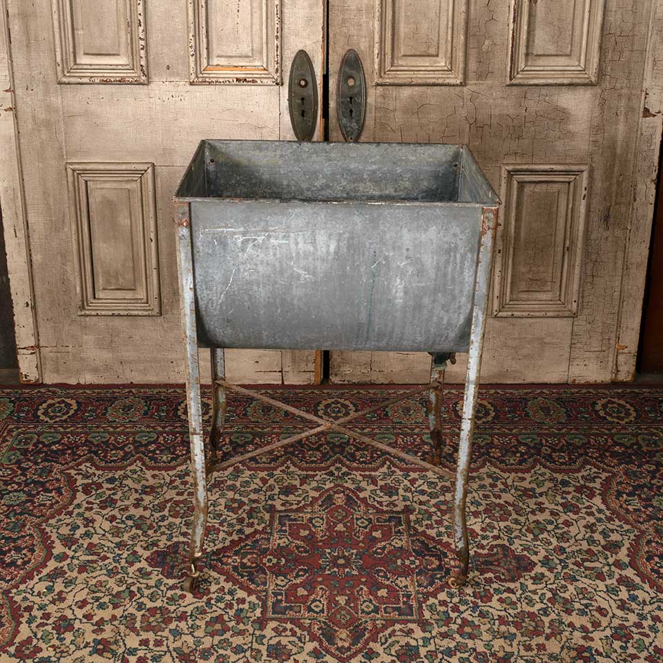 Architectural salvage antique BOSS single bowl galvanized metal washtub on casters measuring approx. 23 1/4" wide x 33 1/4" tall x 18 3/4" front to back. The original label reads: "BOSS CINCINNATI THE BOSS WASHING MACHINE COMPANY CINCINNATI, OHIO Established 1889." See photos to evaluate condition.