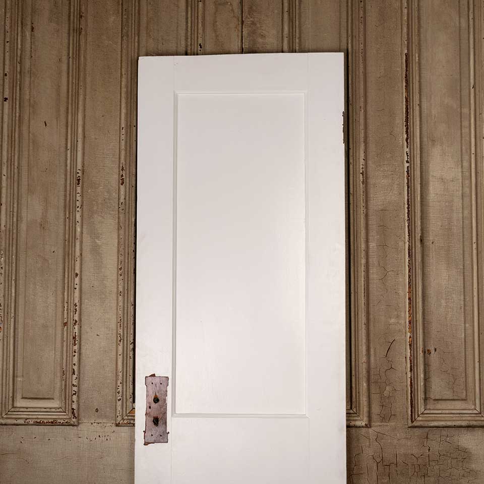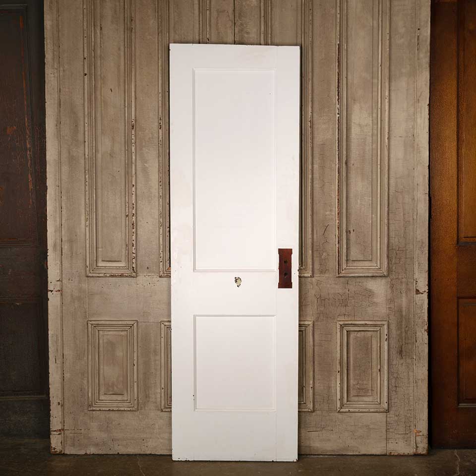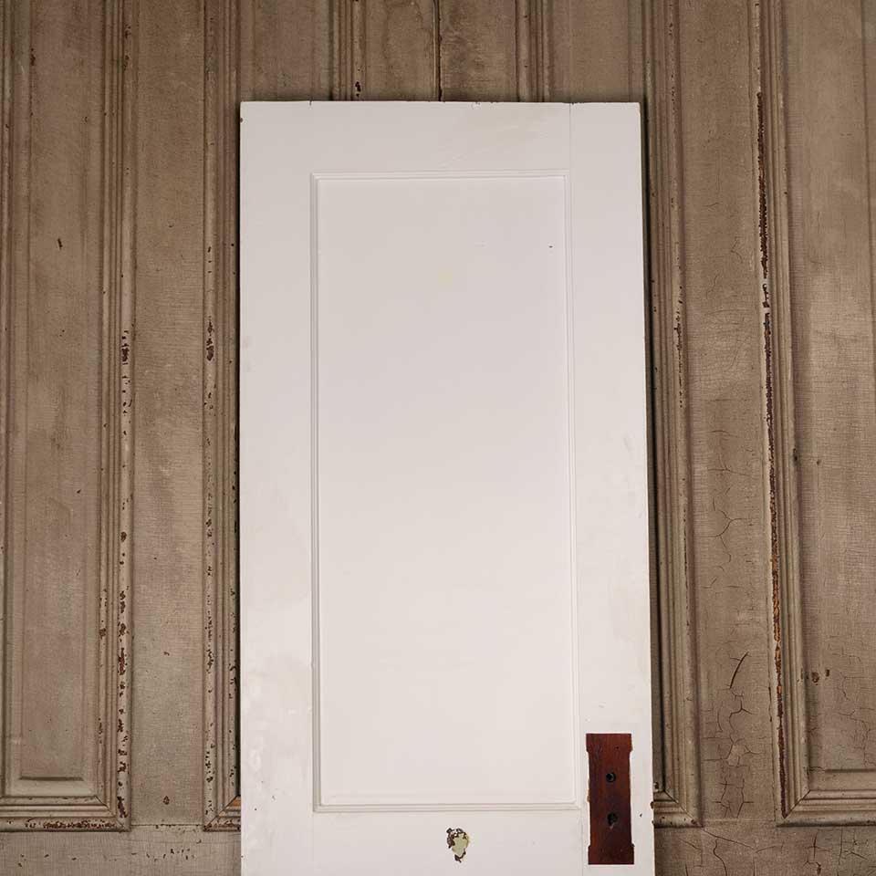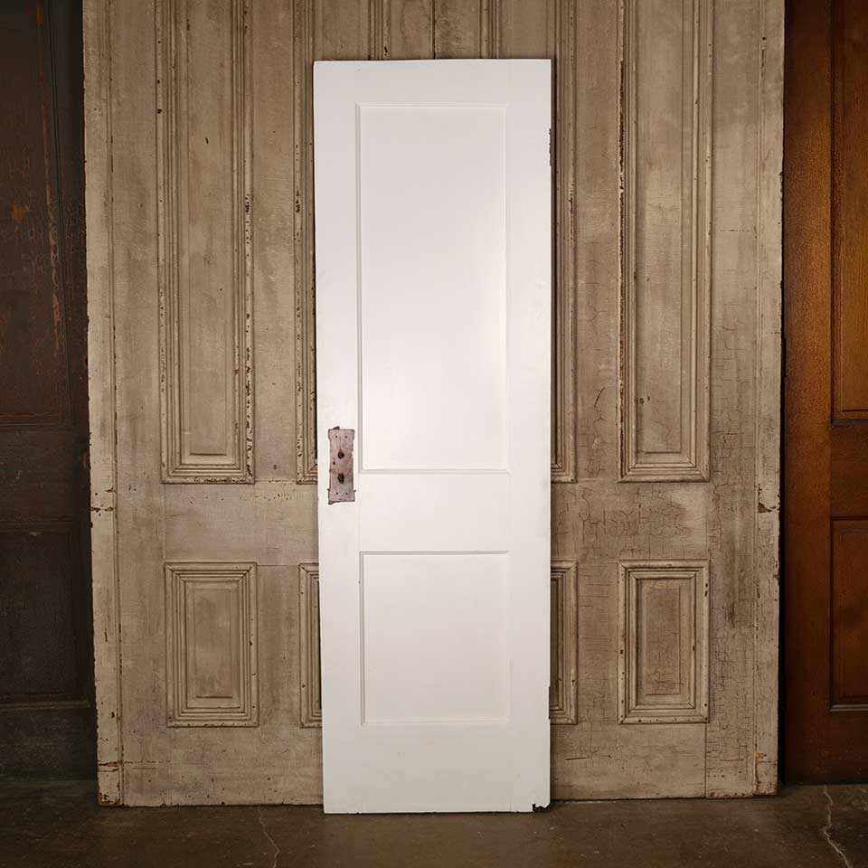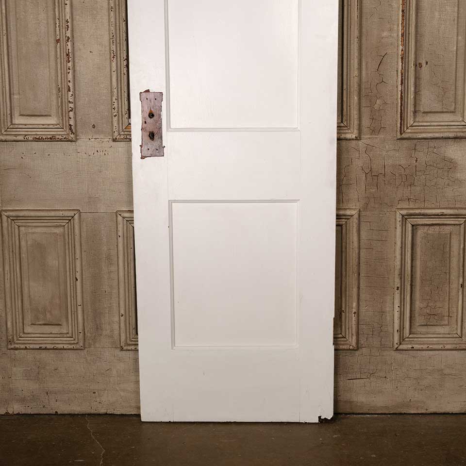 Architectural salvage antique painted wood two panel interior door with mortise lock measuring approx. 24" wide x 77 3/4" tall x 1 3/8" thick. See photos to evaluate condition.