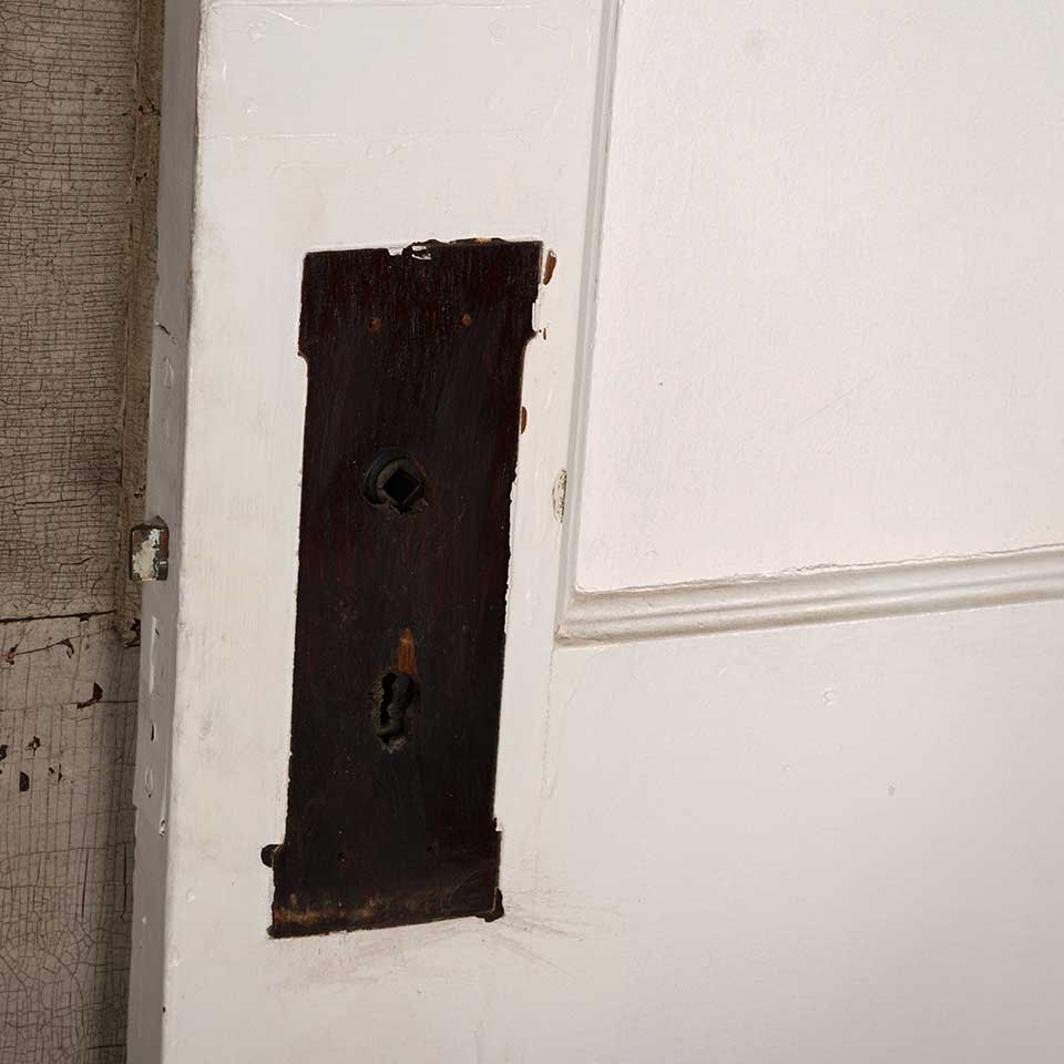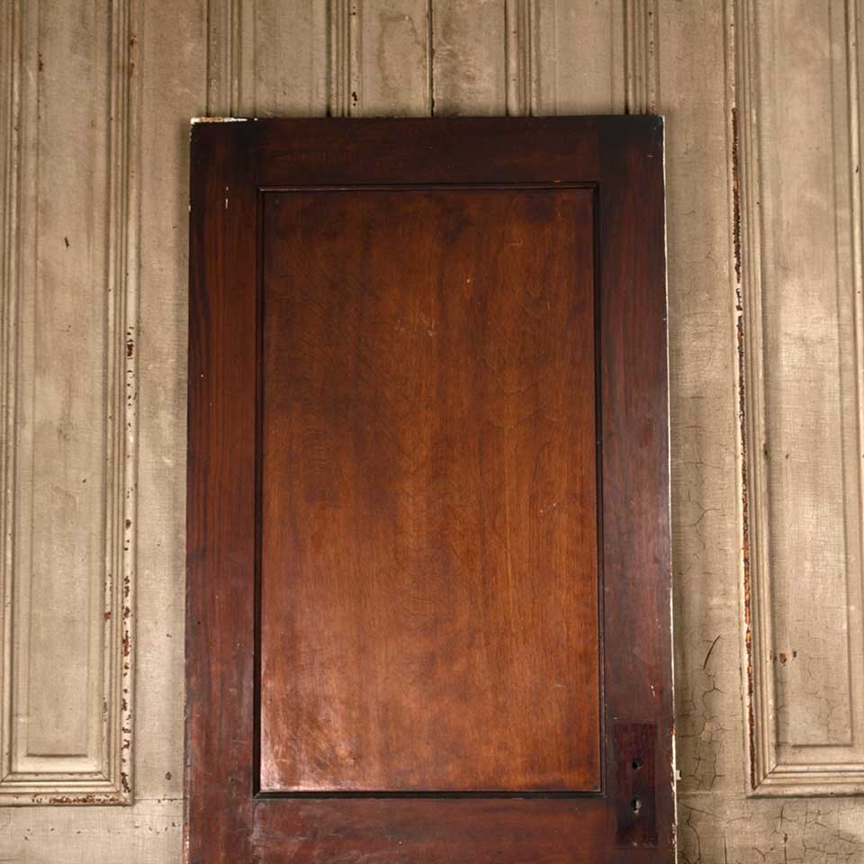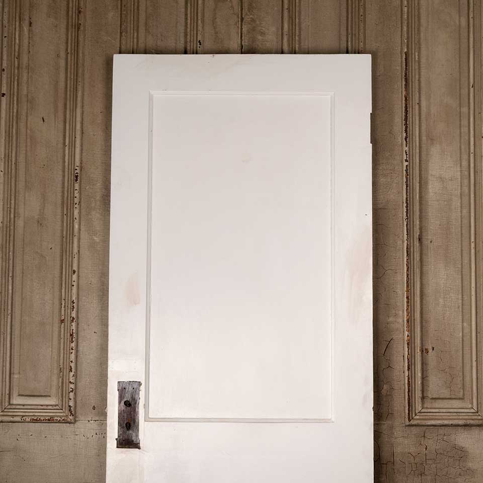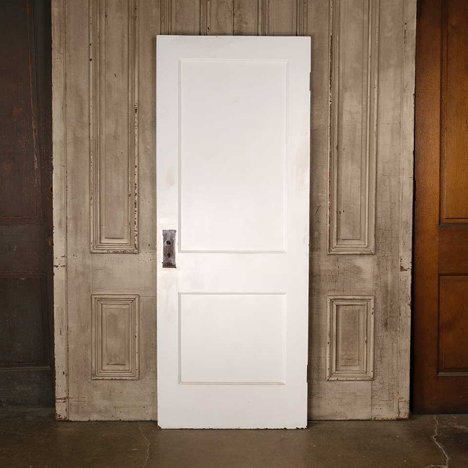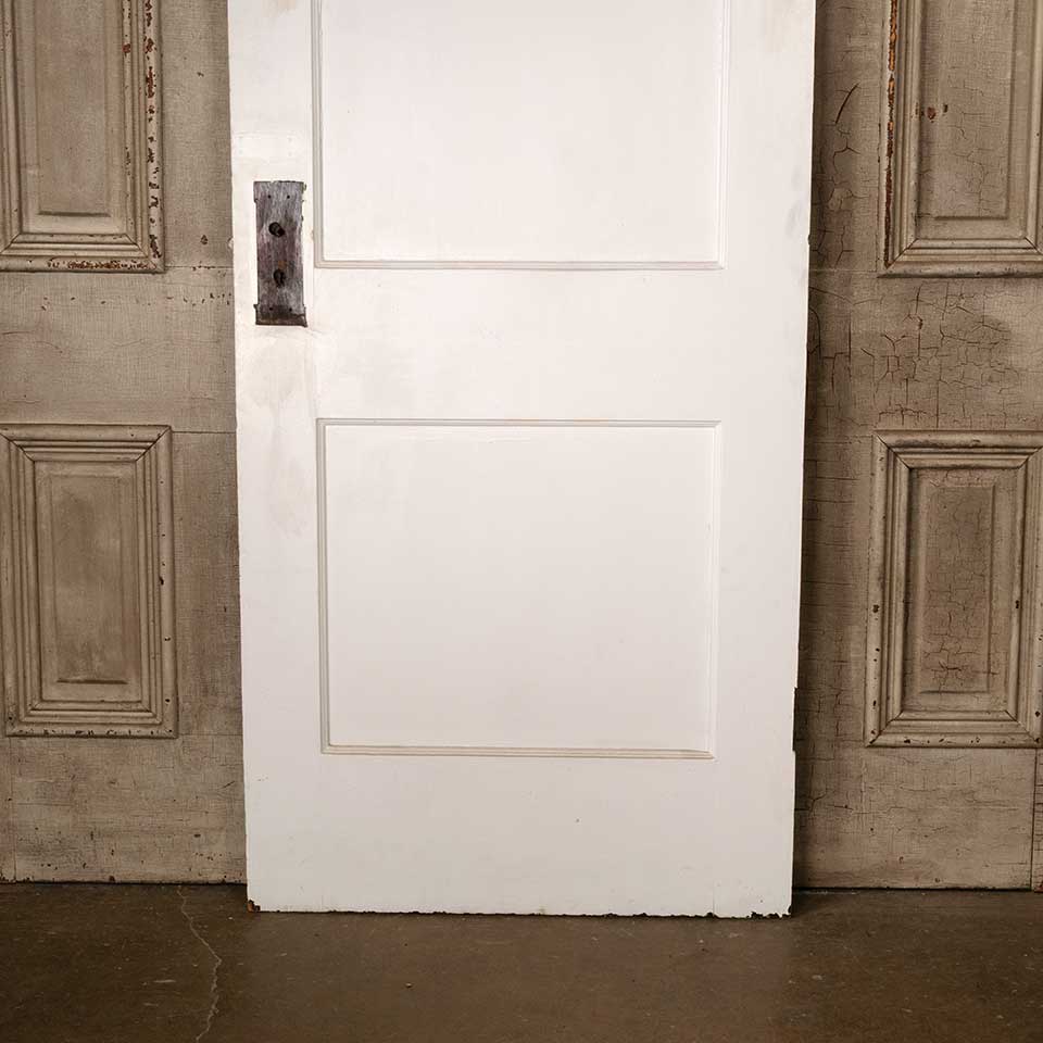 Architectural salvage antique wood two panel interior door with mortise lock measuring approx. 30" wide x 77 3/4" tall x 1 3/8" thick. This door is painted on one side and natural on the other. There's some damage on the lower panel of the unpainted side of the door. See photos to evaluate condition.