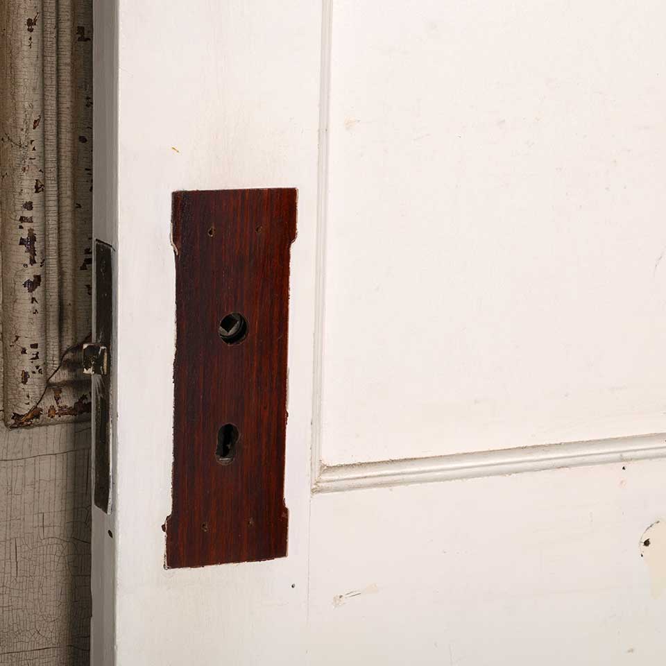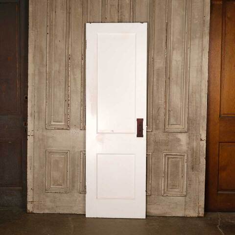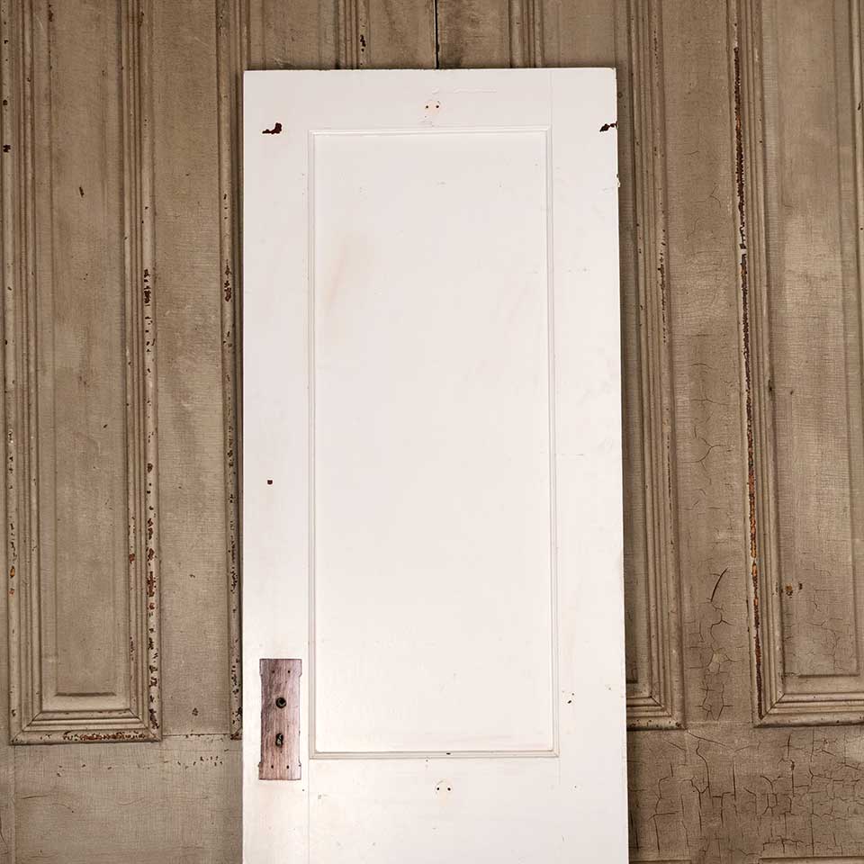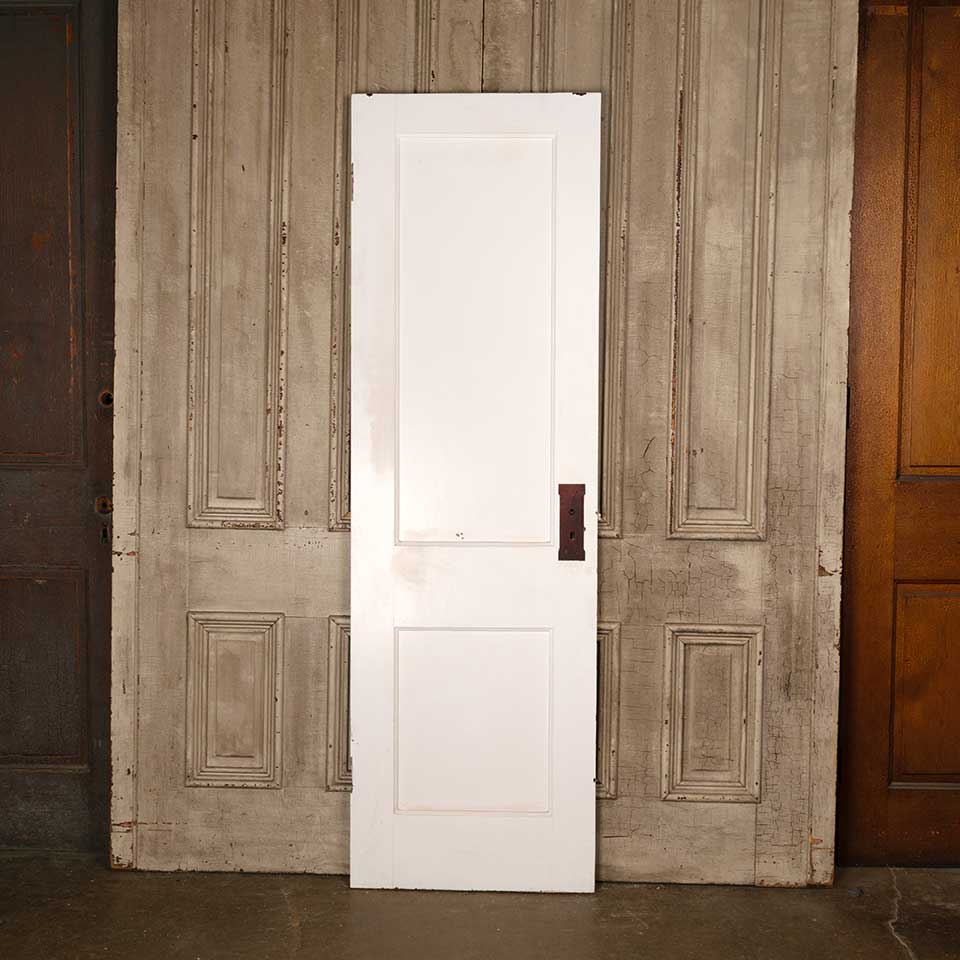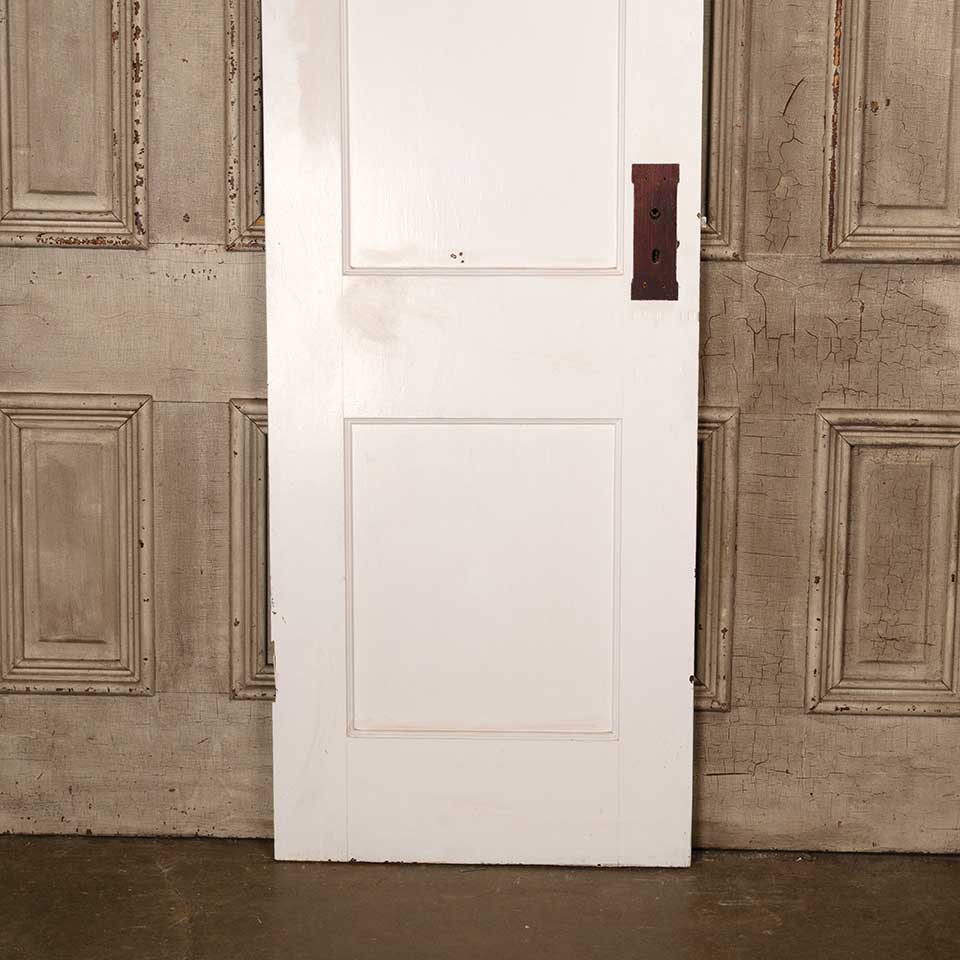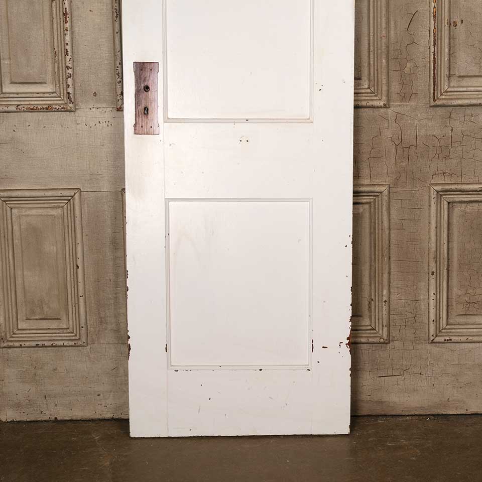 Architectural salvage antique painted wood two panel interior door with mortise lock measuring approx. 24" wide x 77 1/4" tall x 1 3/8" thick. See photos to evaluate condition.