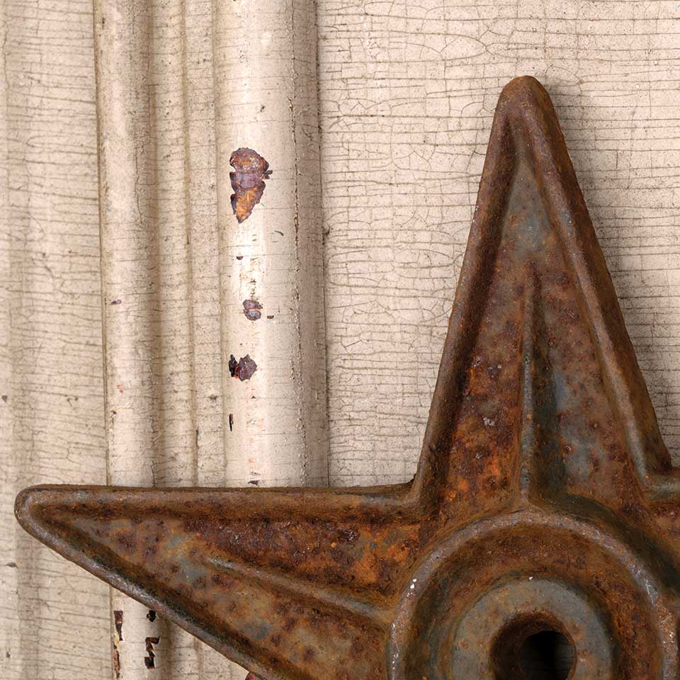 Architectural salvage antique cast iron exterior building star anchor bracket measuring approx. 9 3/4" in diameter x 5/8" thick. See photo to evaluate condition.