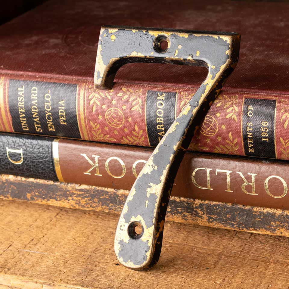 Salvaged vintage brass address numbers each measuring 2 3/8" wide x 4" tall x 1/4" thick. Numbers 0 1 2 3 4 5 6/9 7 8 available, please contact us for quantities. Color and condition vary. Priced at $4/each.