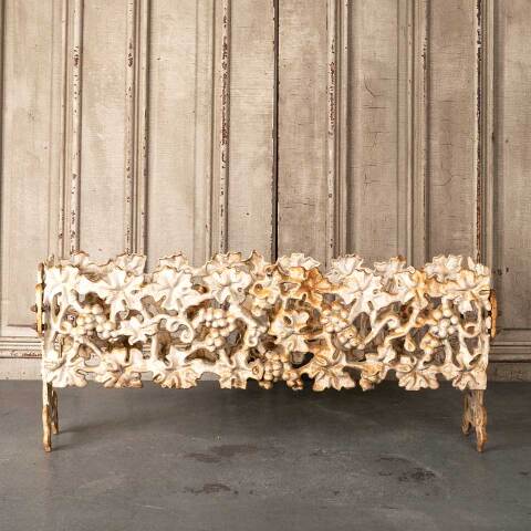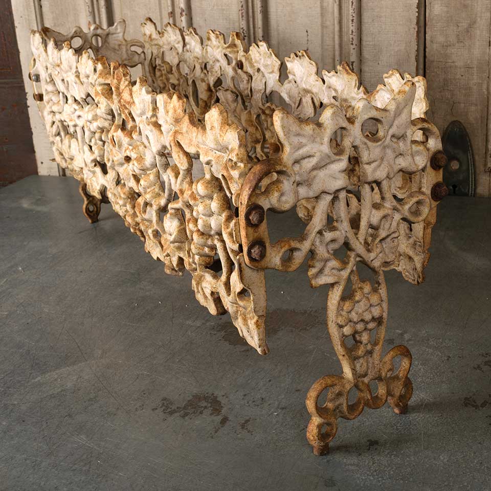Architectural salvage vintage cast iron garden patio planter frame measuring approx. 33 1/2" wide x 14 1/2" tall x 9" front to back. The bottom panel is missing. See photos to evaluate condition.