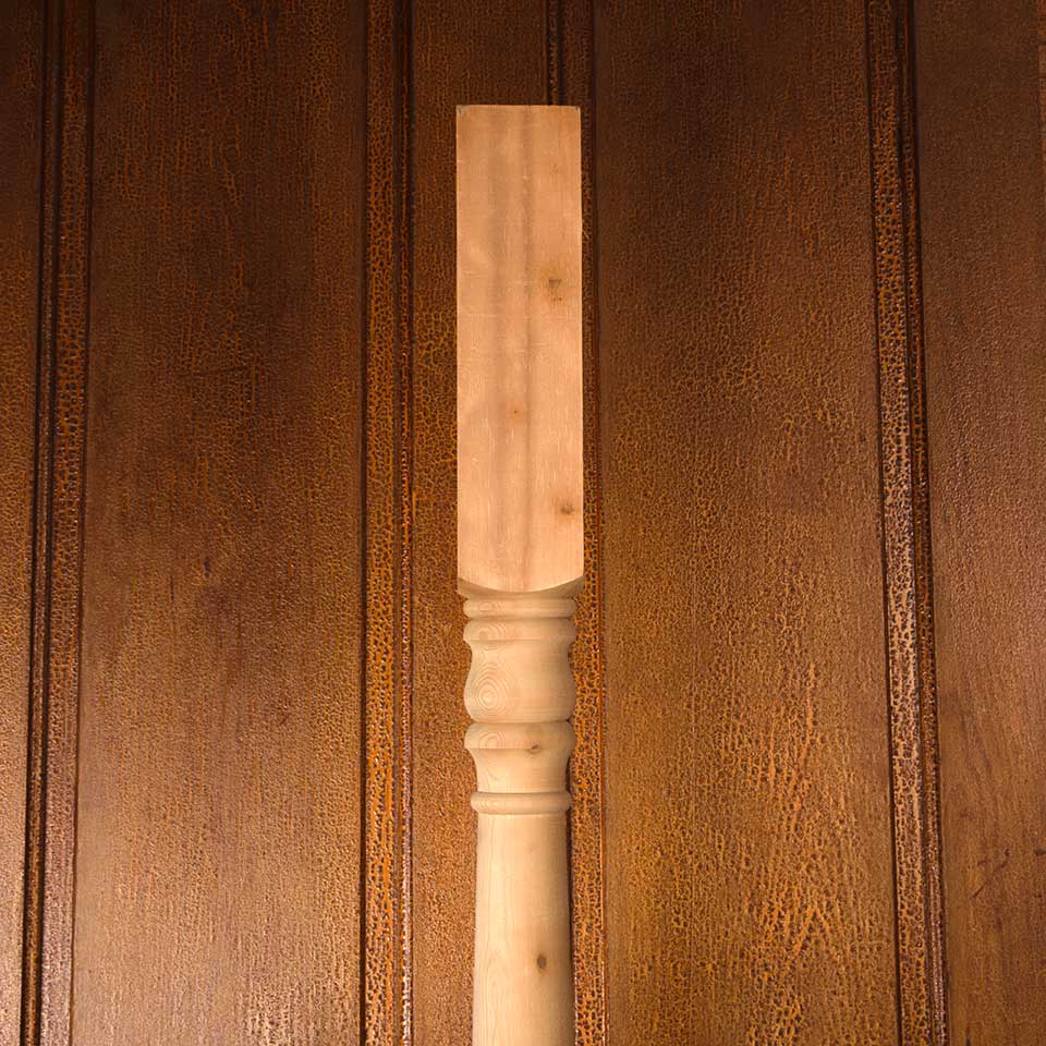 Architectural salvage never used turned wood post measuring approx. 3 1/4" x 3 1/4" x 72" tall. More available contact to inquire. Color and condition may vary.