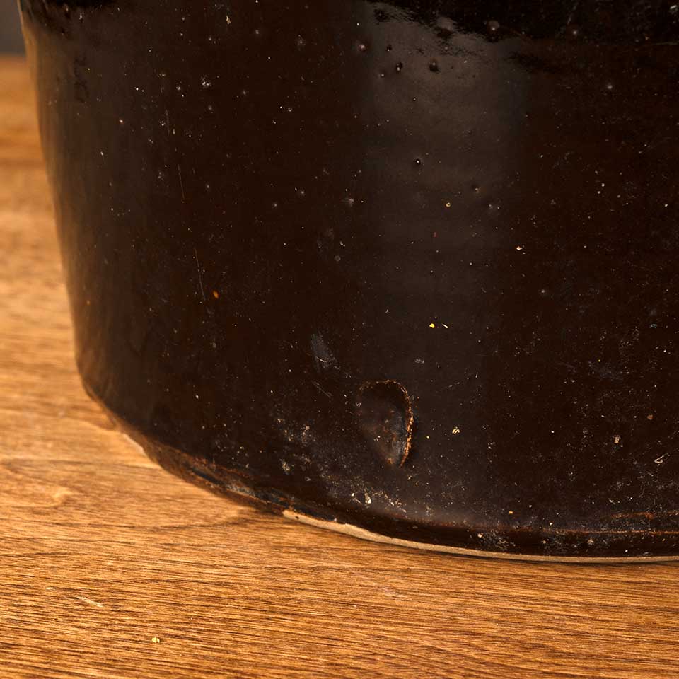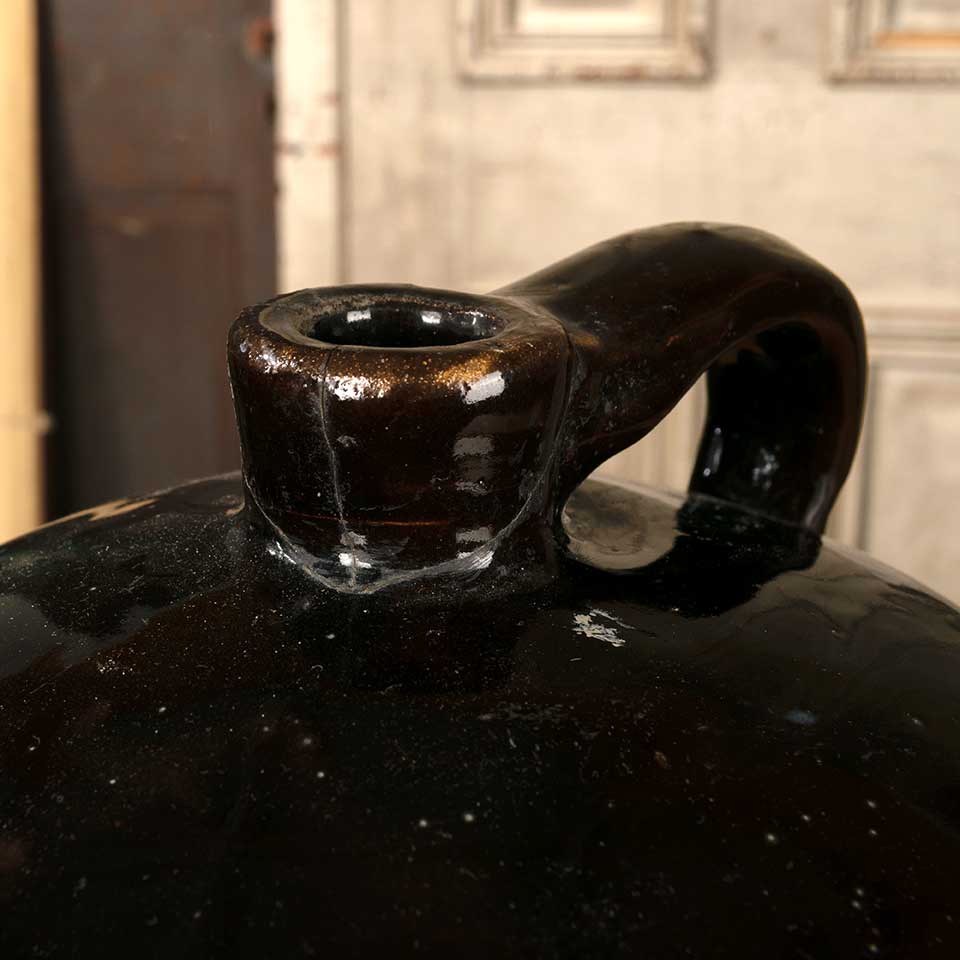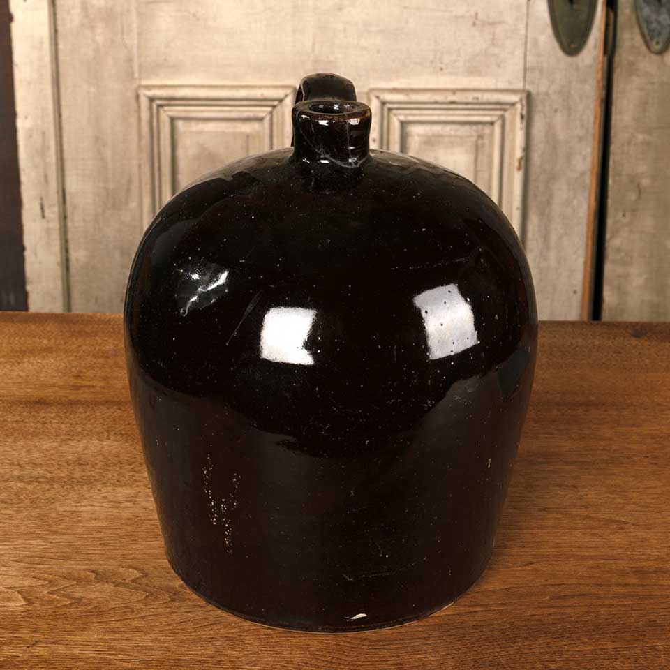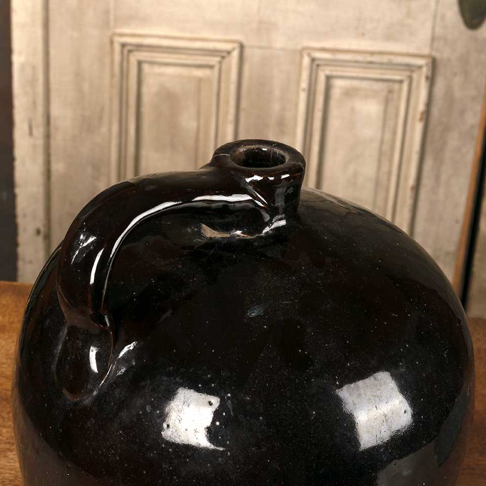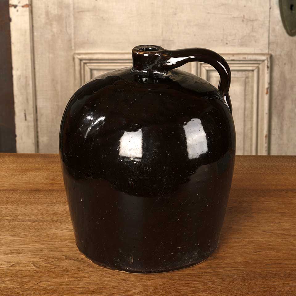 Antique primitive American salt glazed stoneware storage jug with handle measuring approx. 10" in diameter x 11 3/4" tall with a 1" diameter opening. It appears the spout has been repaired sometime in the past. See photos to evaluate condition.