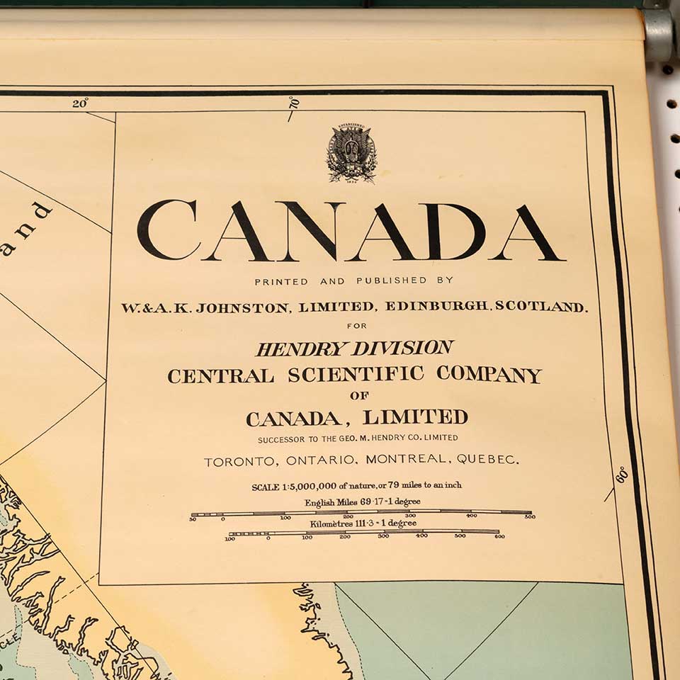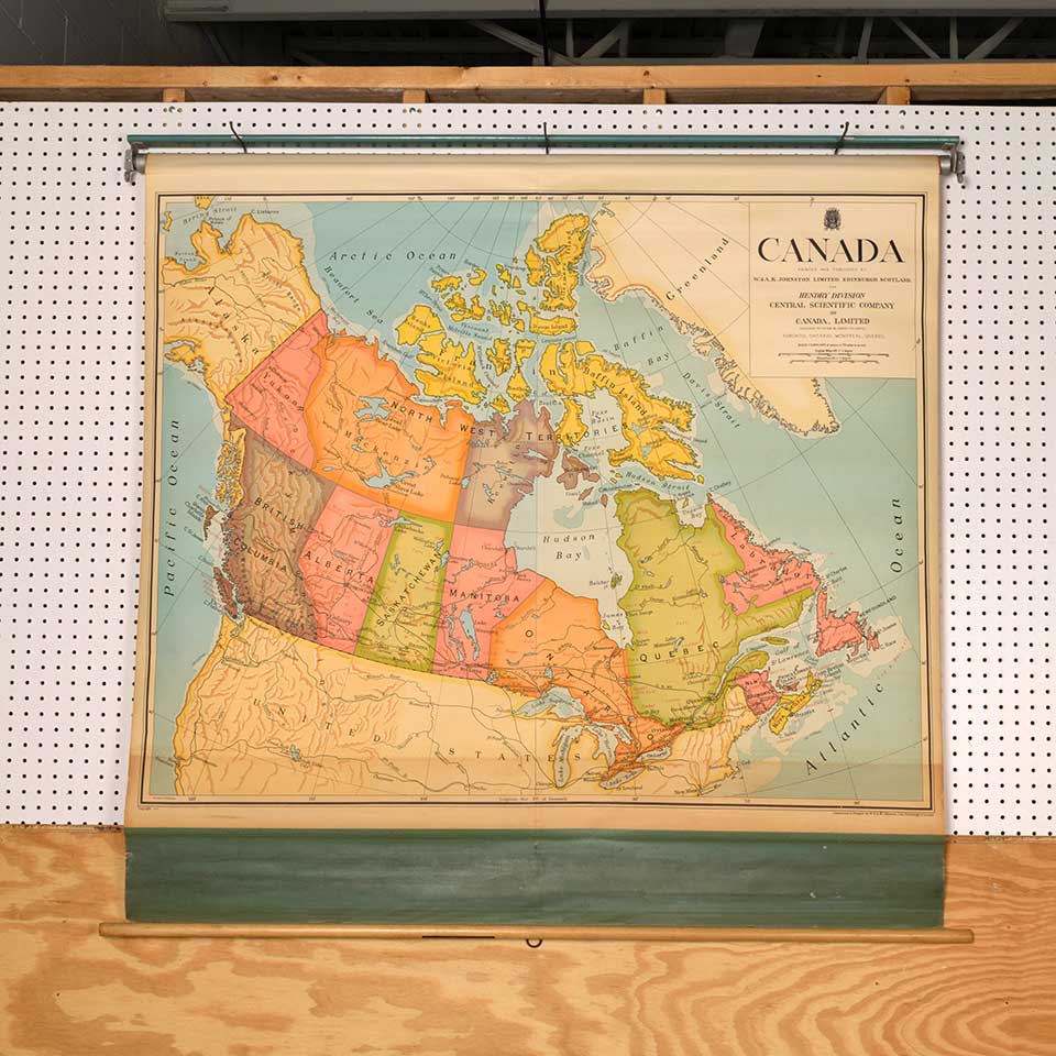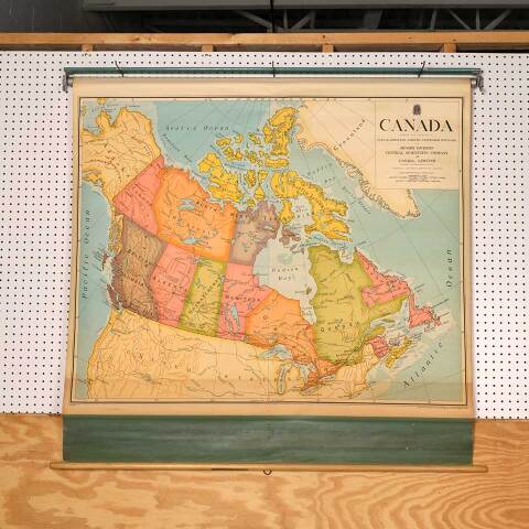 Vintage school classroom pull-down map of Canada published by W.& A.K. Johnston Limited, Edinburgh Scotland and measuring approx. 55 1/2" wide x 51 1/2" tall x 3 1/4" front to back. See photos to evaluate condition.