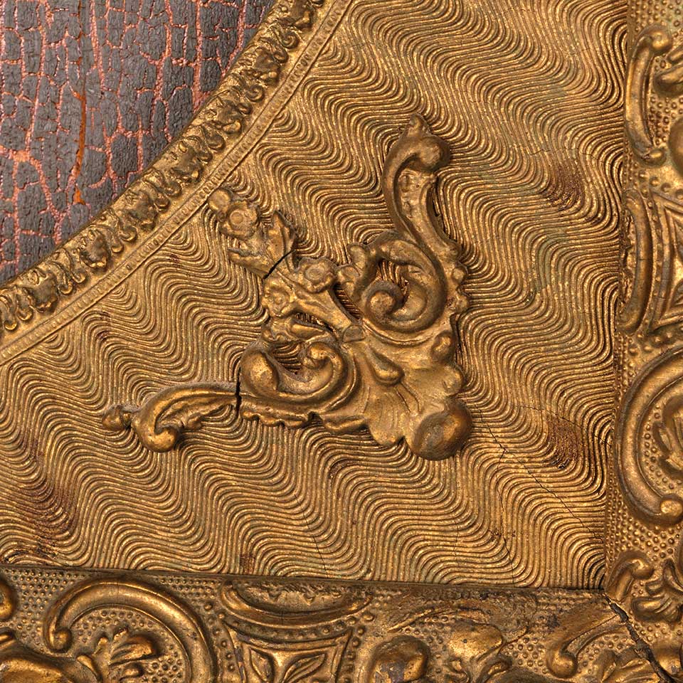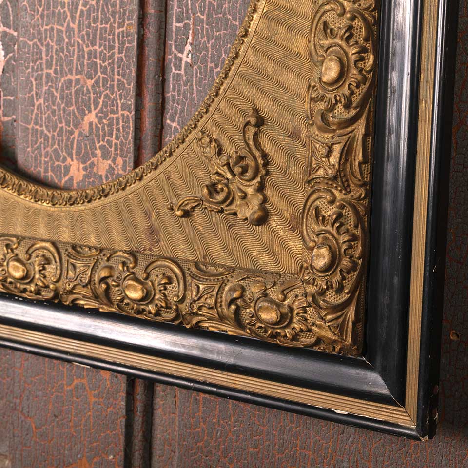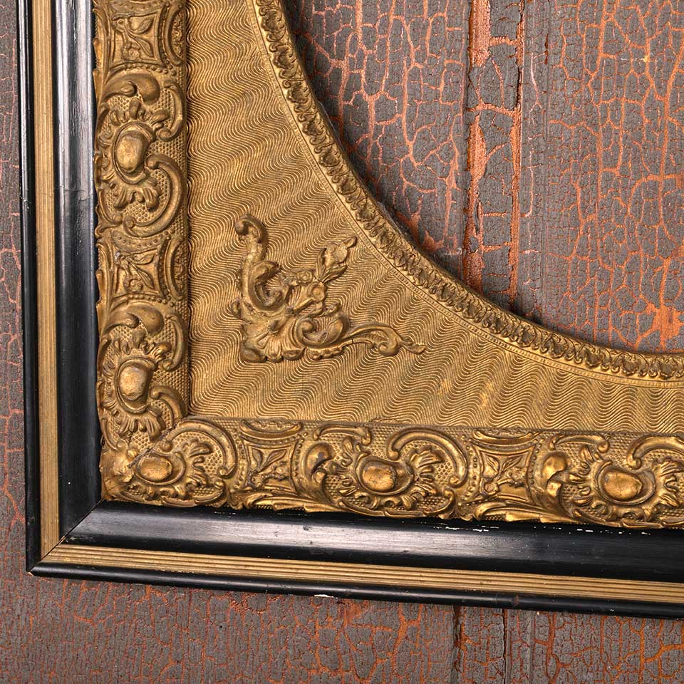 Ornate antique picture frame measuring approx. 25" wide x 29 1/8" tall x 1 3/8" front to back with an oval opening 15" wide x 19" tall. There's no glass in the opening. See photos to evaluate condition.