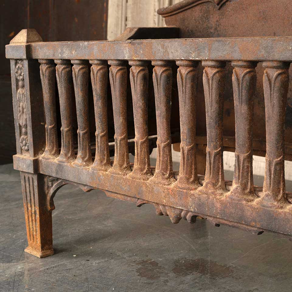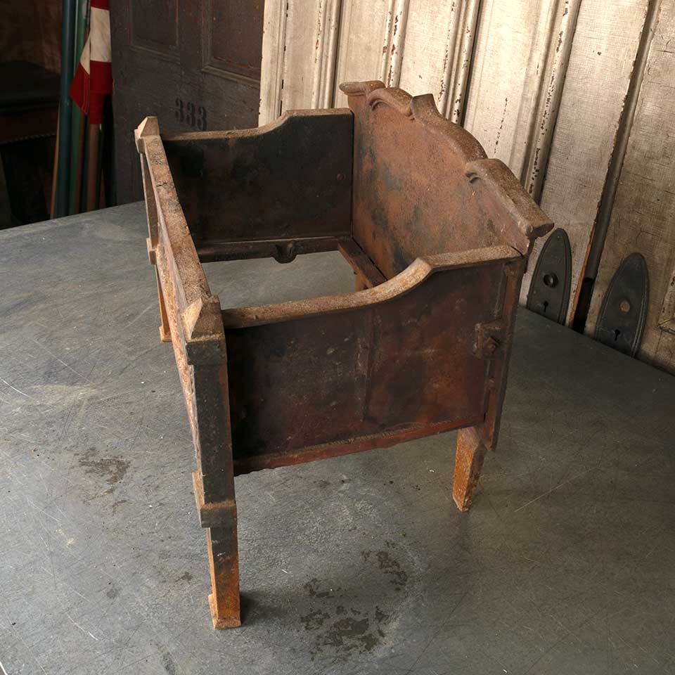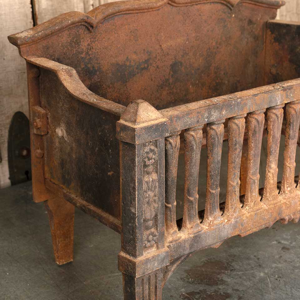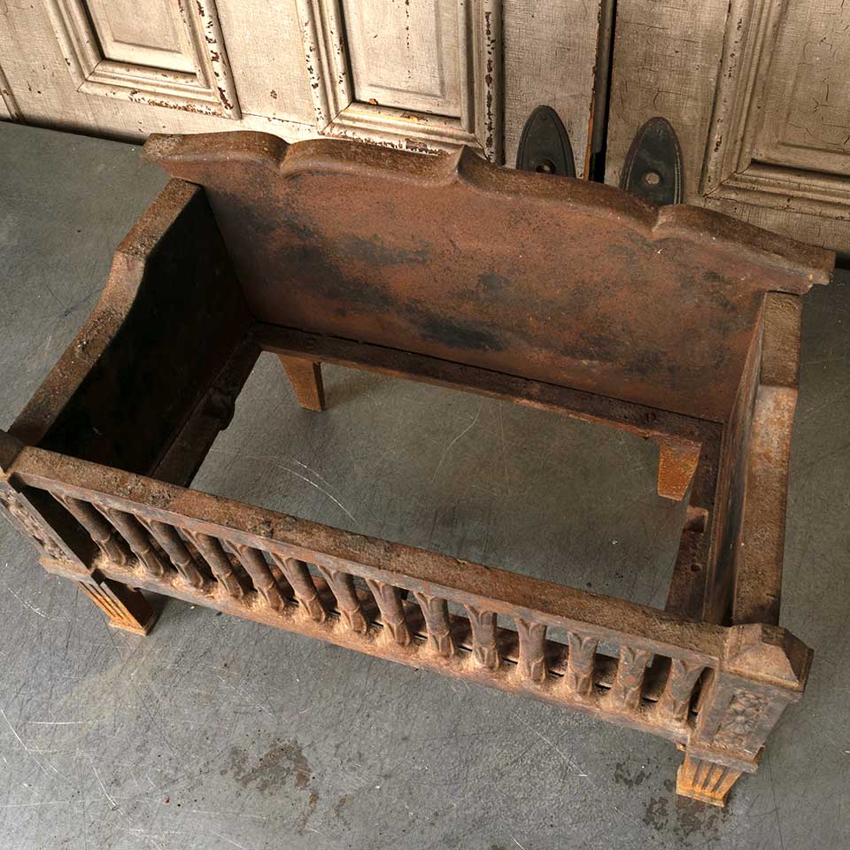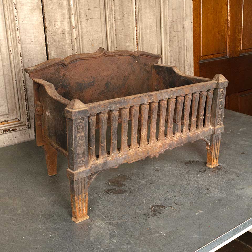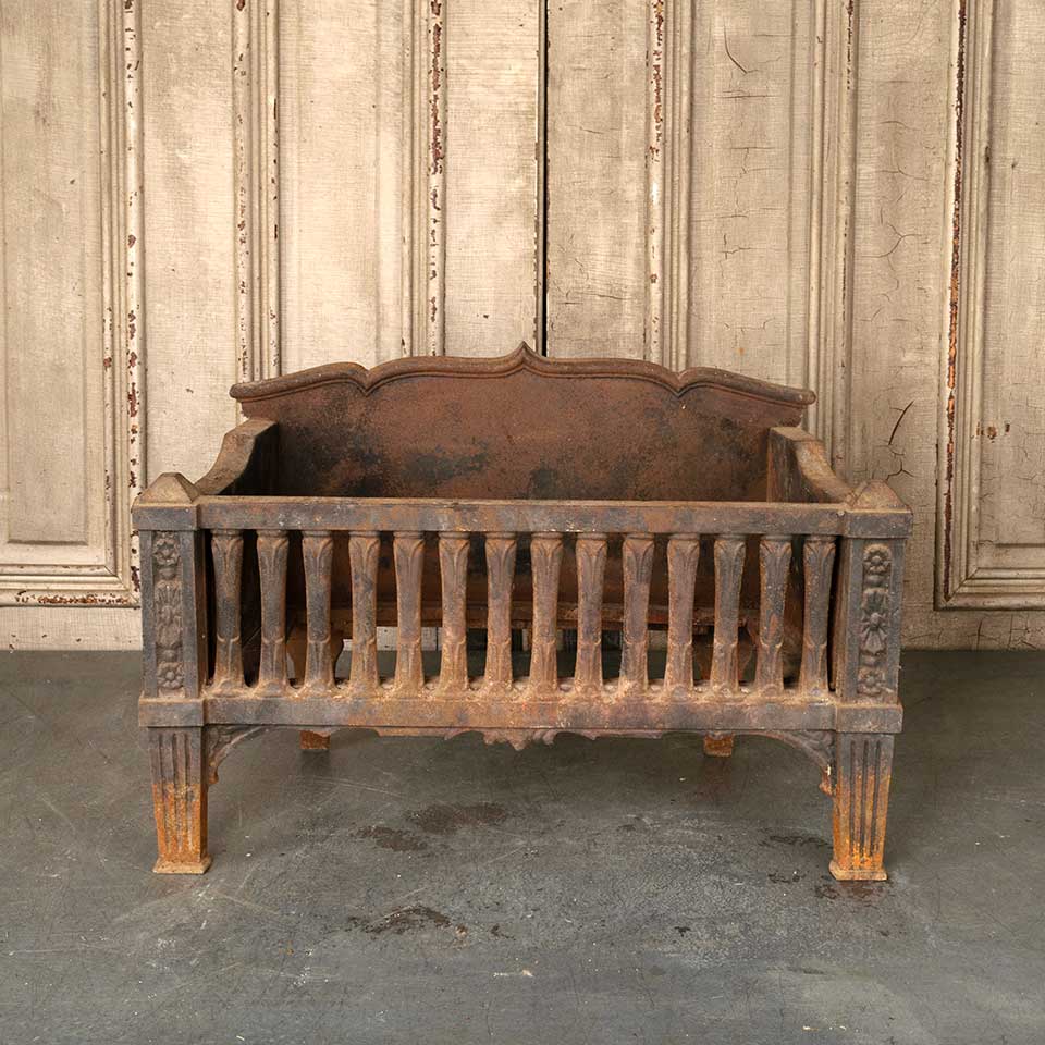 Architectural salvage antique cast iron fireplace log holder basket measuring approx. 24 1/4" wide x 16 1/8" tall x 12 3/8" front to back. The bottom panel is missing. See photos to evaluate condition.