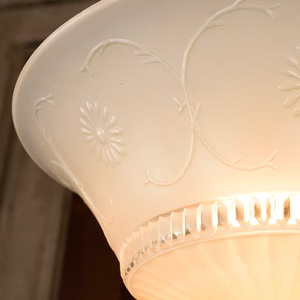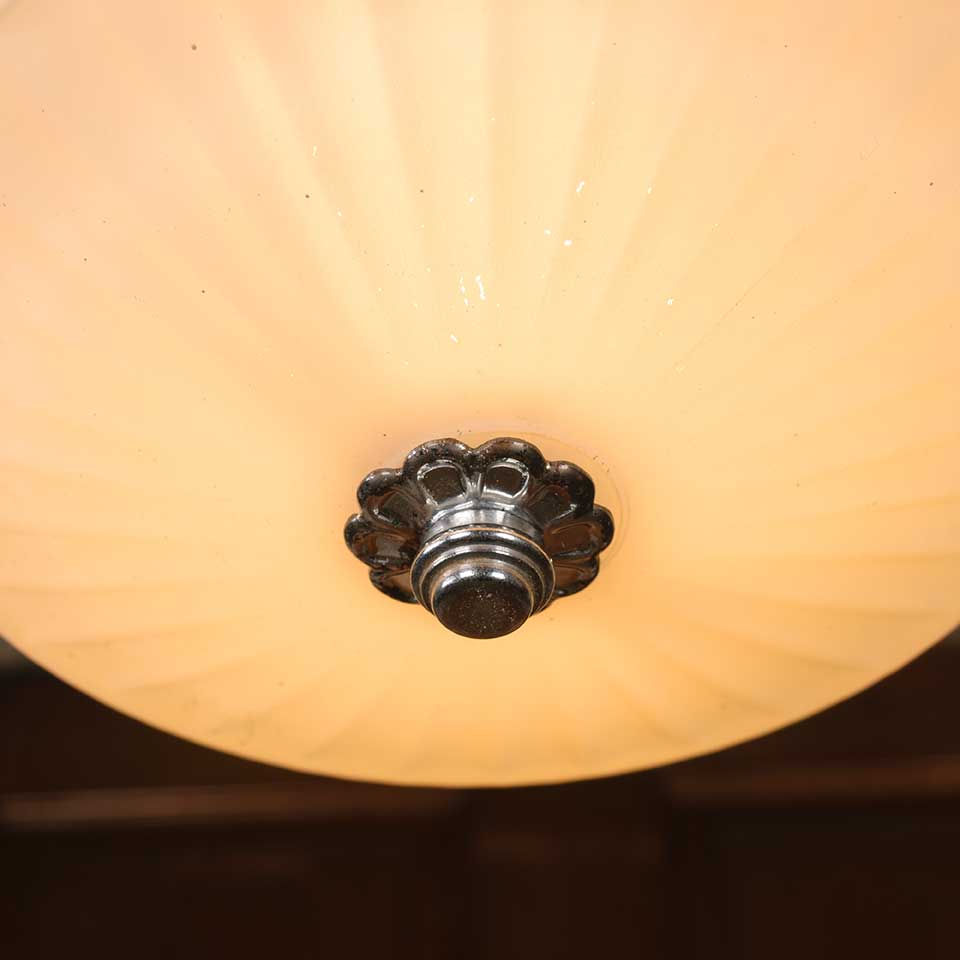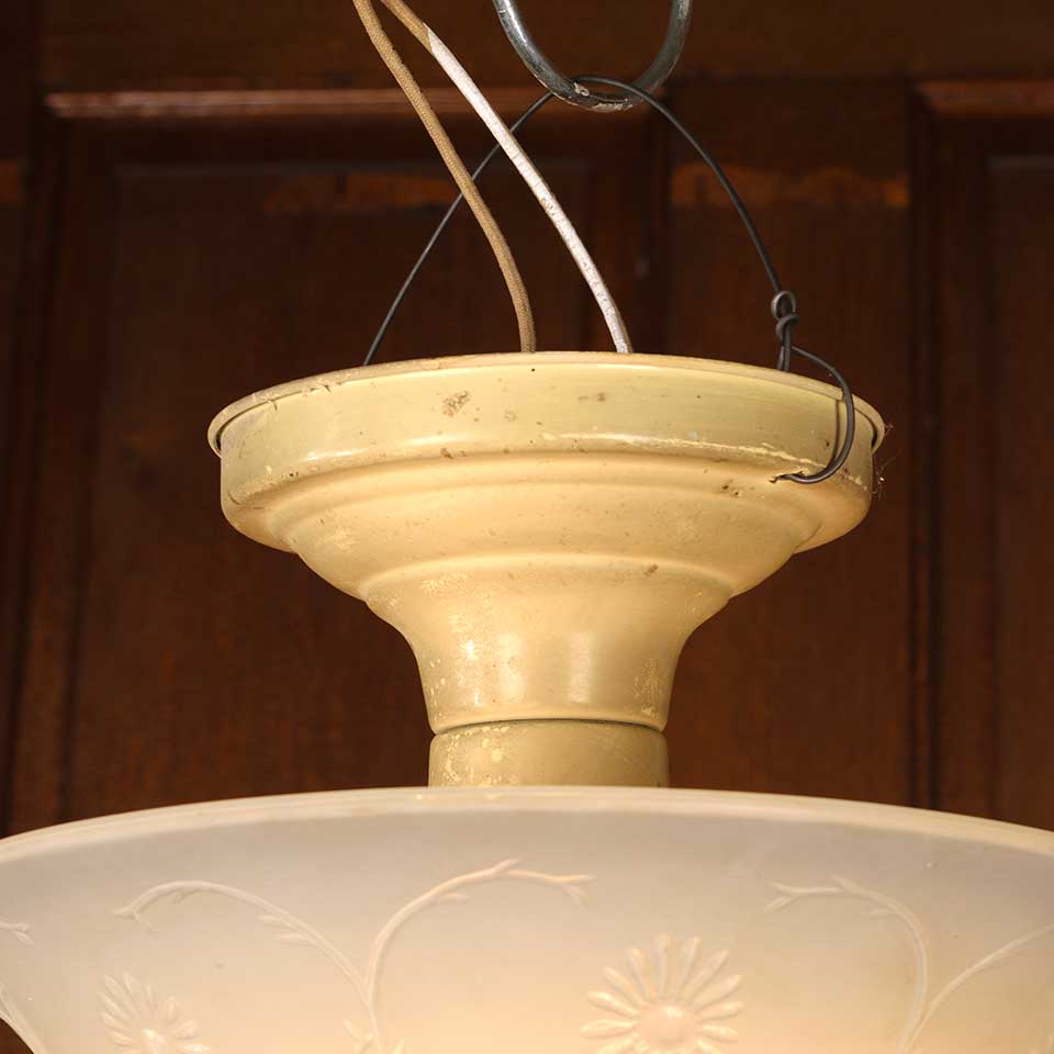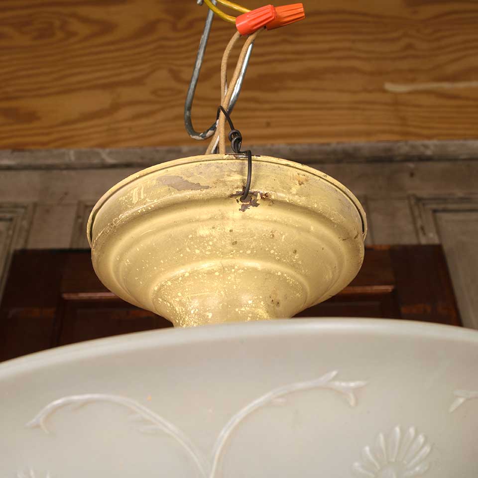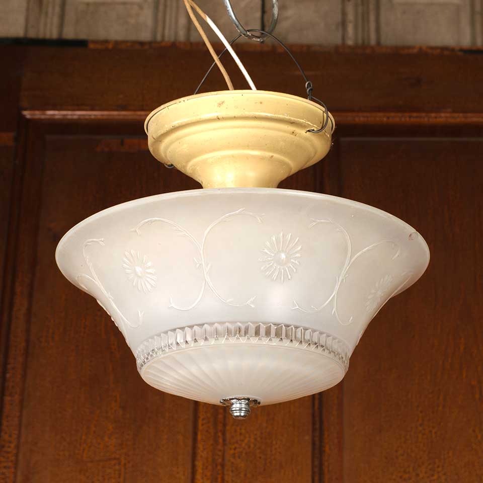 Architectural salvage vintage single bulb flush mount light fixture with pressed glass shade measuring approx. 10 1/2" in diameter x 9" tall with a 5 1/2" diameter ceiling canopy. See photos to evaluate condition. Salvaged lighting should be inspected by a licensed electrician prior to installation.