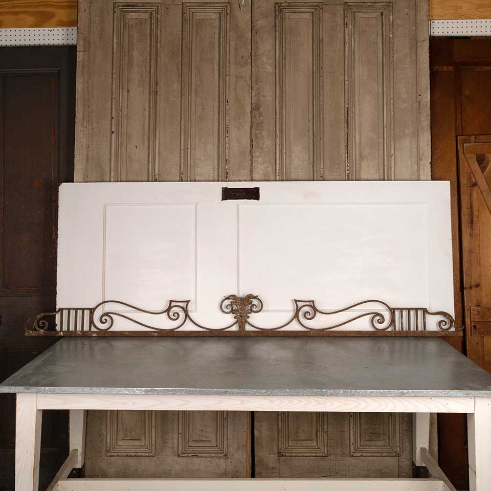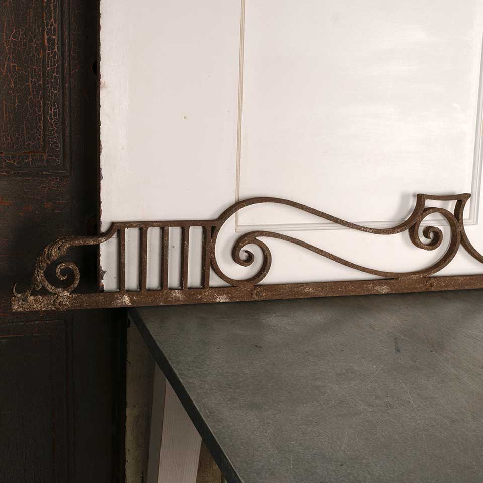 Architectural salvage antique wrought iron ornamental pediment measuring approx. 84 1/2" wide x 8 1/8" tall x 2" front to back. See photos to evaluate condition.