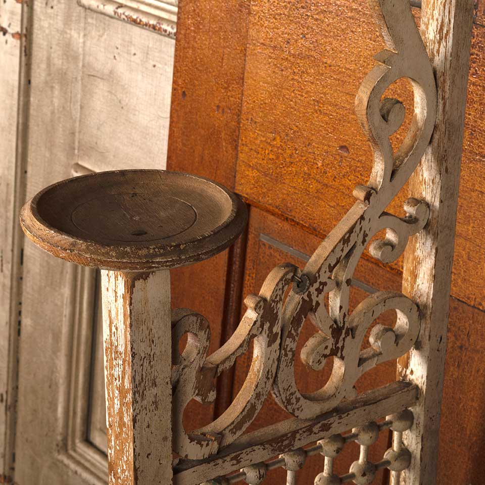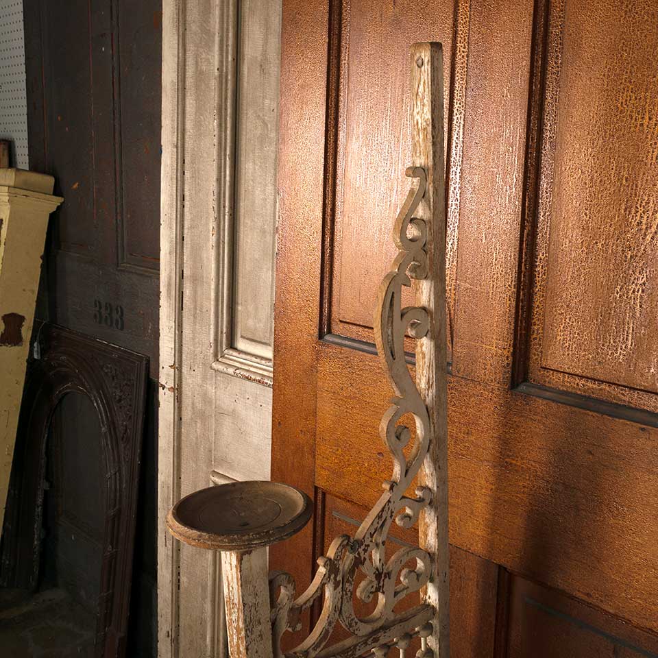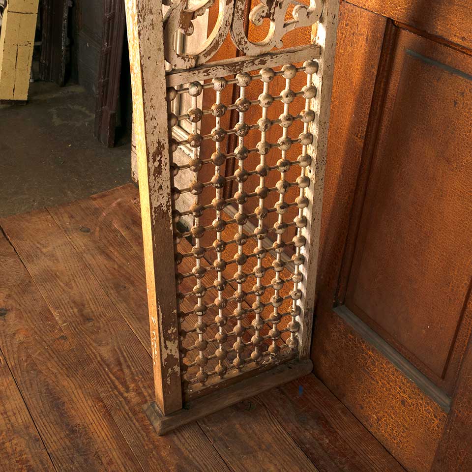 Architectural salvage antique Victorian painted oak wood interior stick and ball fretwork door panel with dish / plant stand measuring approx. 6 5/8" wide (dish) x 56" tall x 15 3/8" front to back. See photos to evaluate condition.