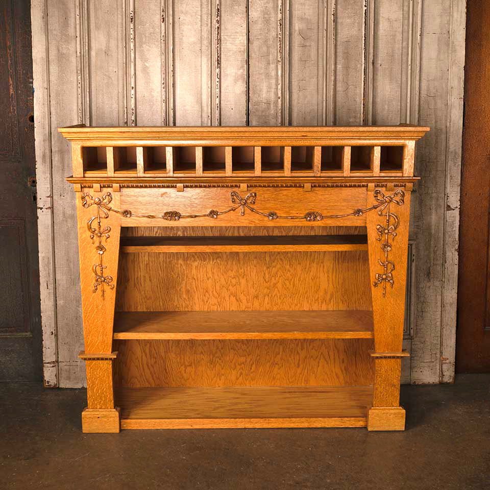 Handcrafted oak back bar cabinet measuring approx. 50 1/8" wide x 46 3/8" tall x 14 1/4" front to back. This cabinet was constructed from pieces of an antique fireplace mantel. See photos to evaluate condition.