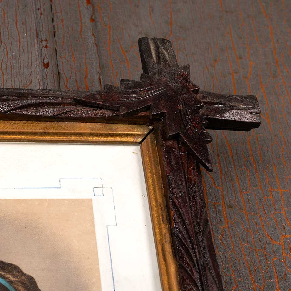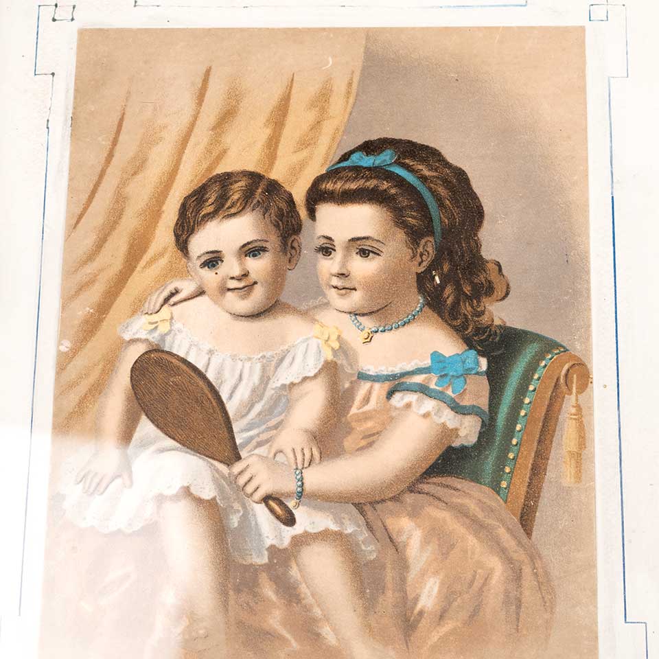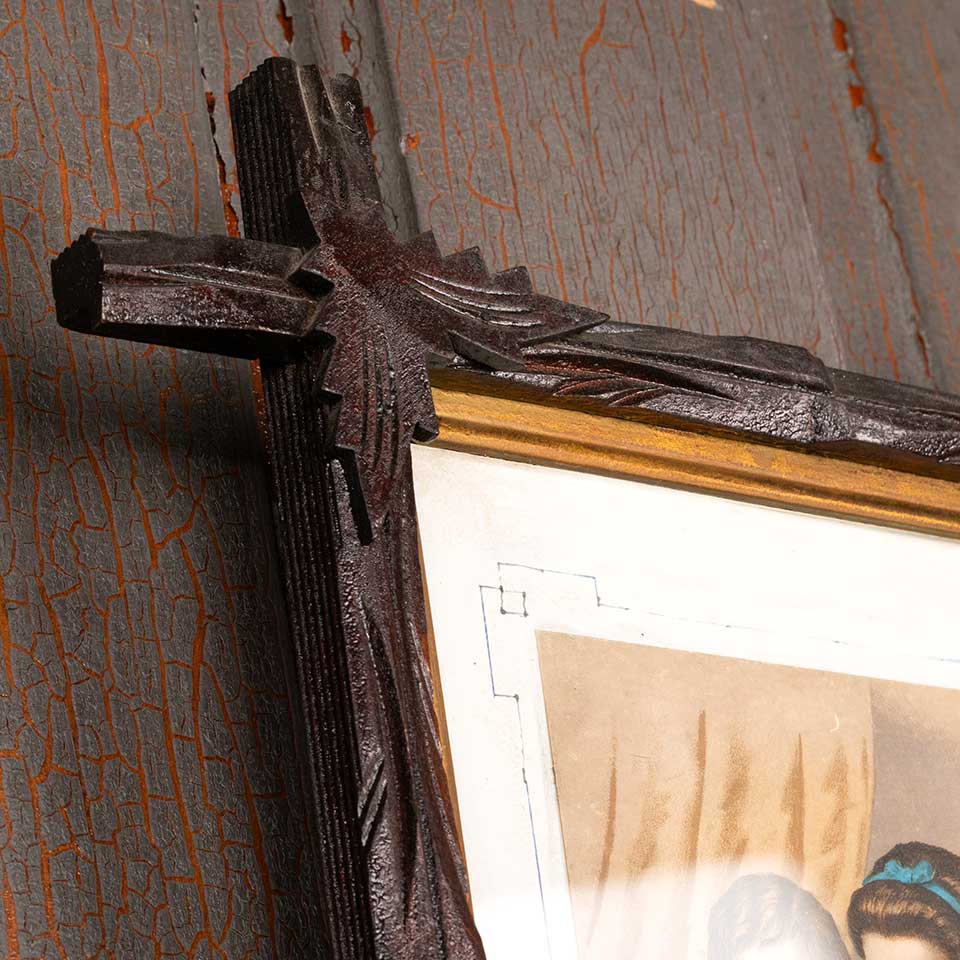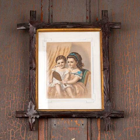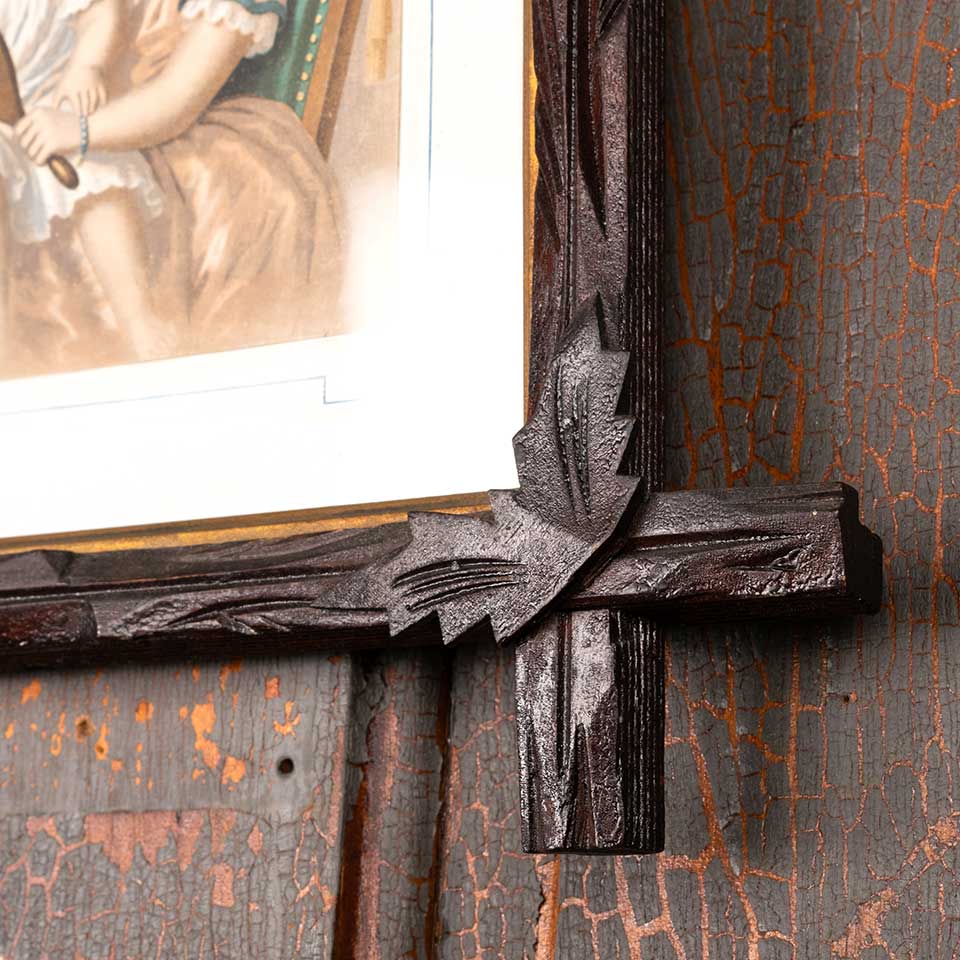 Antique color illustration of children in carved wood frame measuring approx. 13 1/8" wide x 15 1/8" tall x 1 1/4" front to back. See photos to evaluate condition.