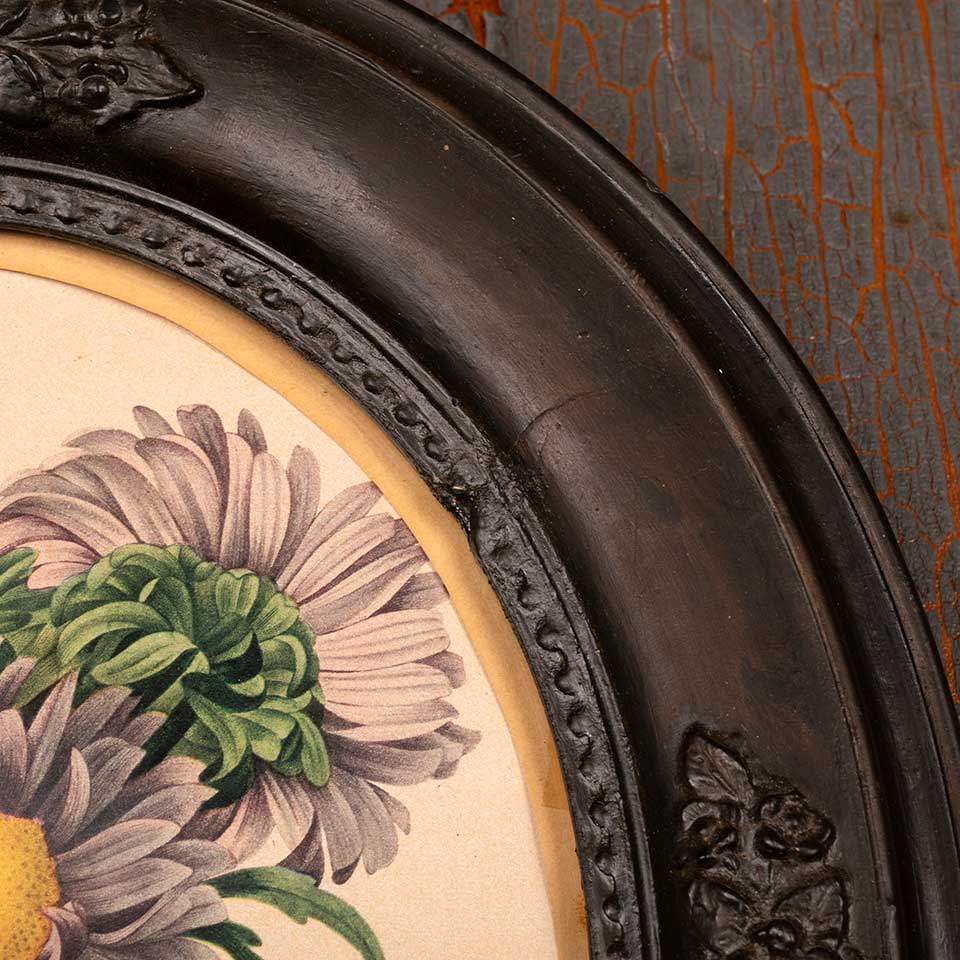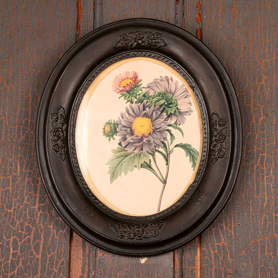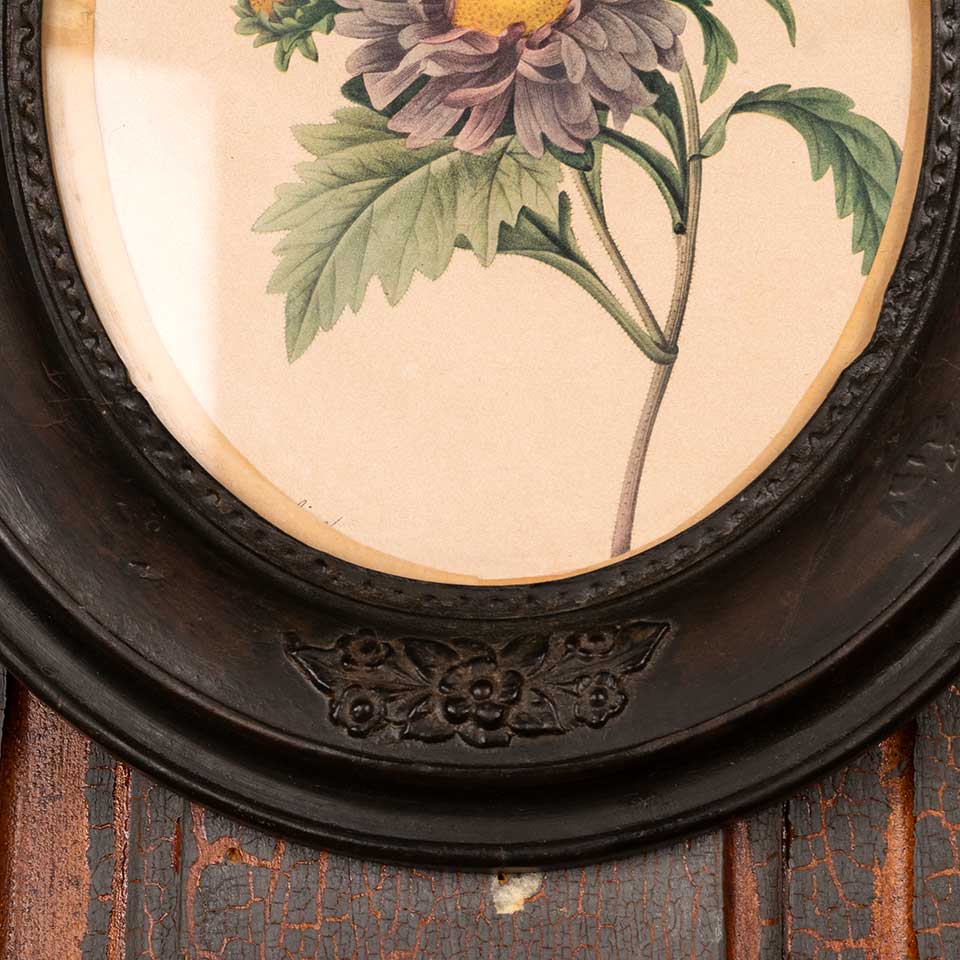 Antique botanical print in oval frame measuring approx. 12" wide x 14" tall x 1 1/8" front to back. See photos to evaluate condition.