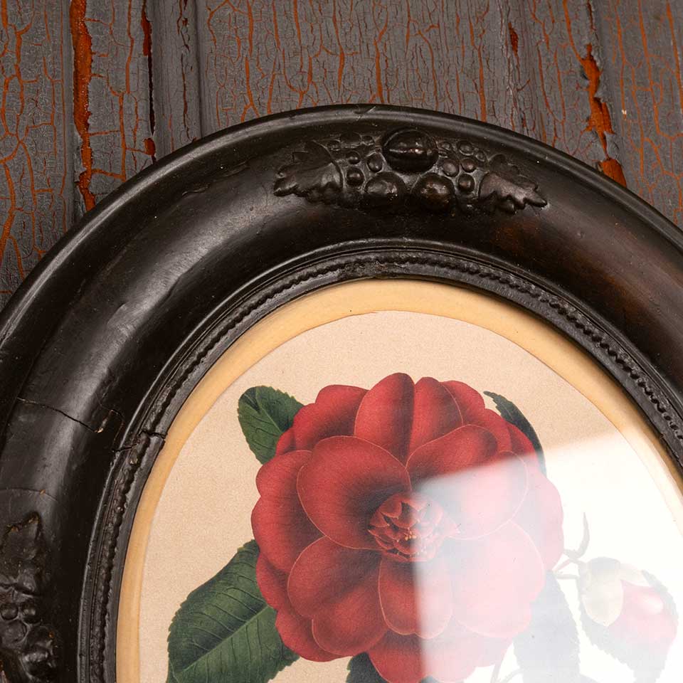 Antique botanical print of Camellia Japonica corallina in oval frame measuring approx. 12" wide x 14" tall x 1 1/8" front to back. See photos to evaluate condition.