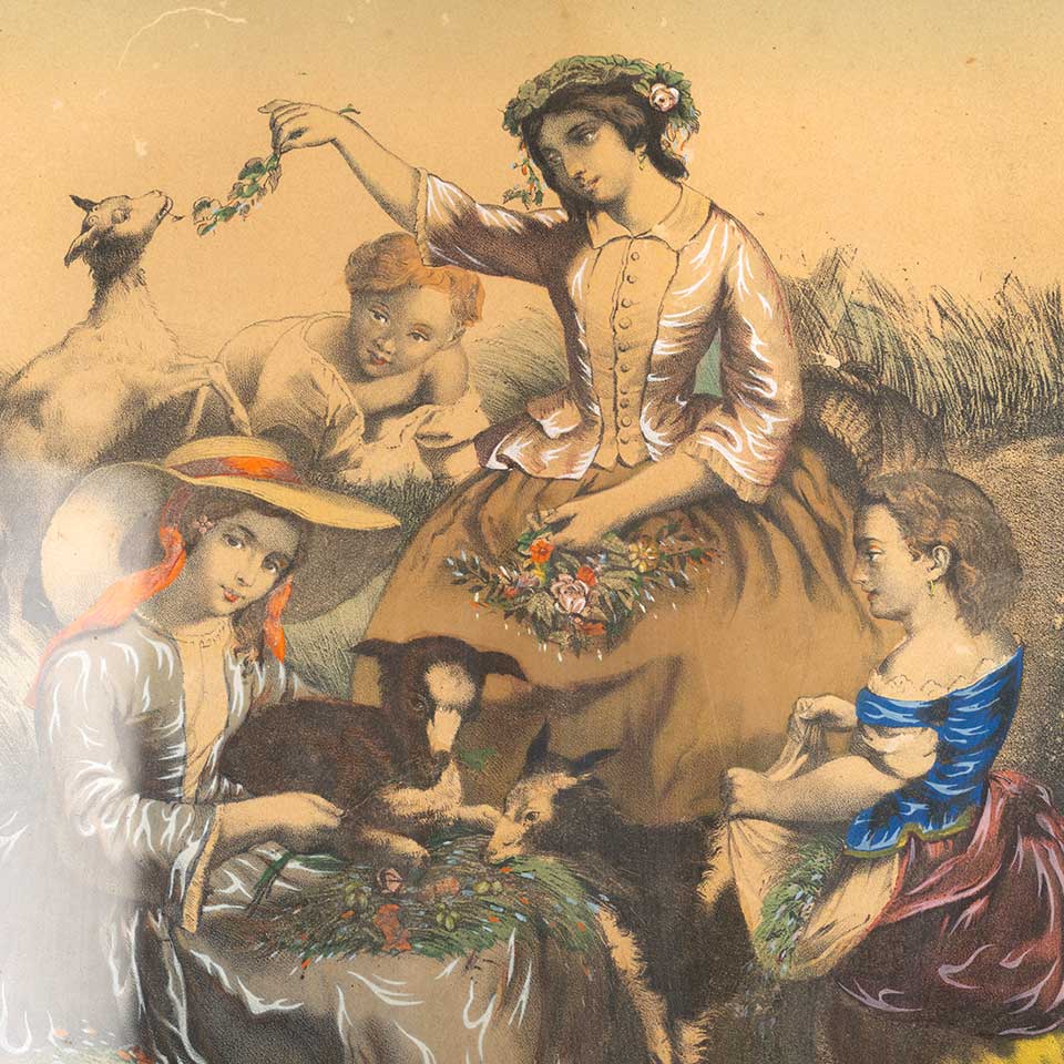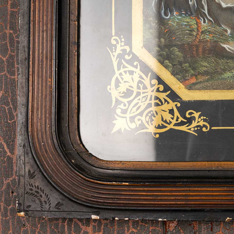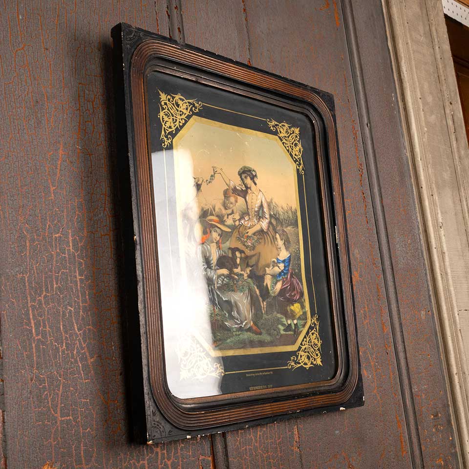 Antique color print entitled "SHEPHERD'S JOY" in Victorian frame measuring approx. 17" wide x 20" tall x 7/8" front to back. See photos to evaluate condition.