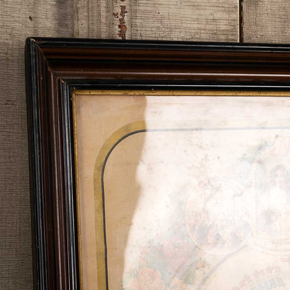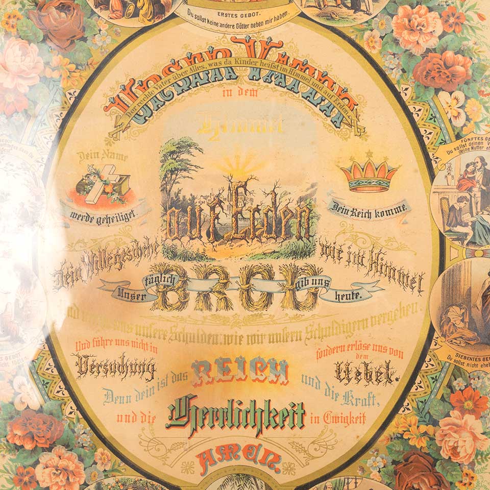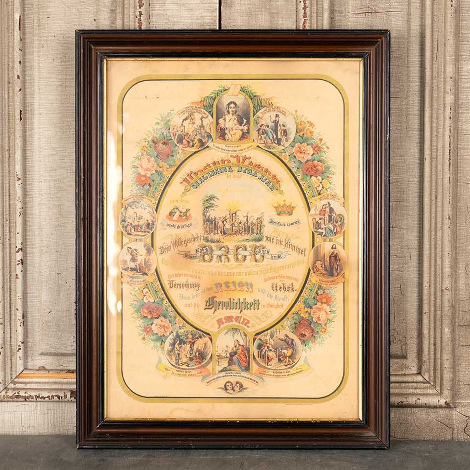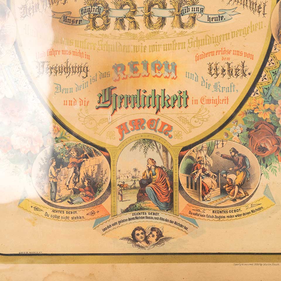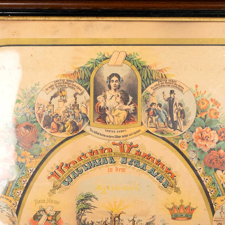 Antique German chromolithograph color print from the 1880s featuring "Our Father" (Lord's Prayer) surrounded by illustrations of the Ten Commandments measuring approx. 18 3/4" wide x 25 1/4" tall x 1 1/2" front to back. See photos to evaluate condition.