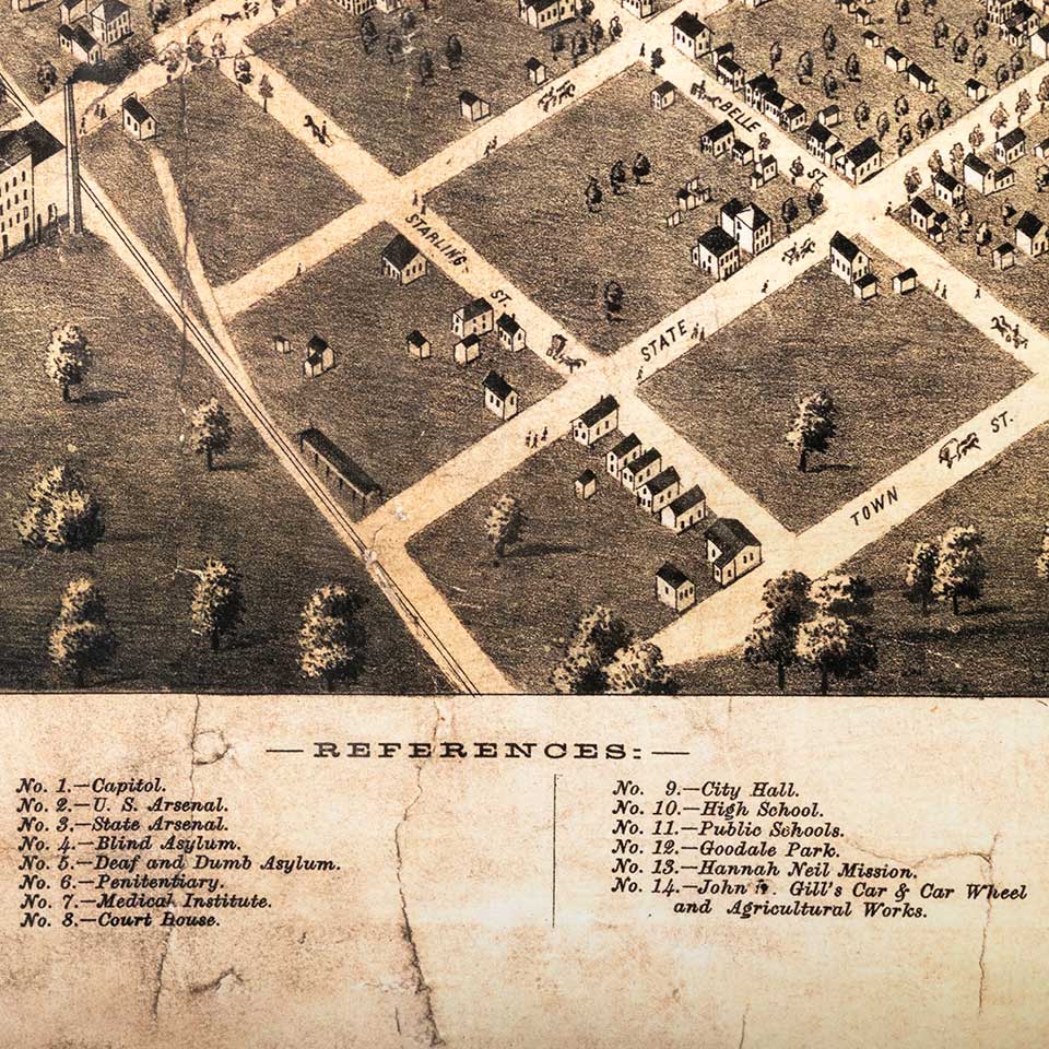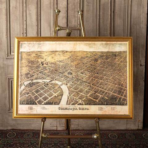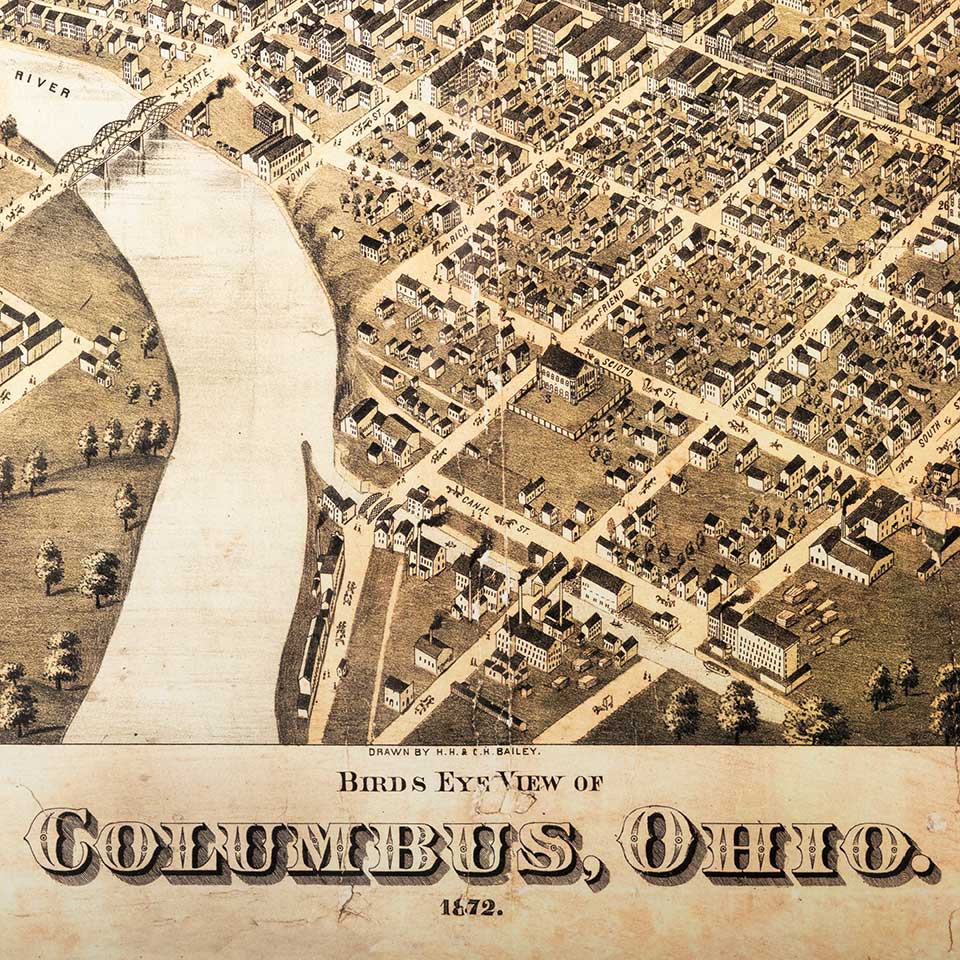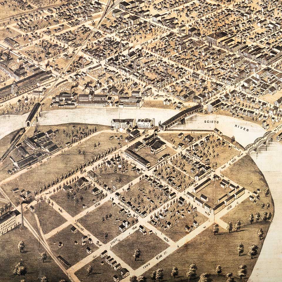 Bird's Eye View of Columbus, Ohio 1872 poster print on heavy coated bond paper measuring 36" wide x 24" tall. Poster only, frame not included.
