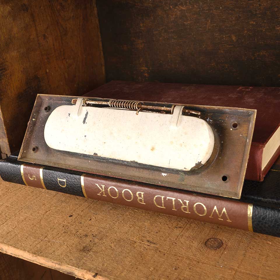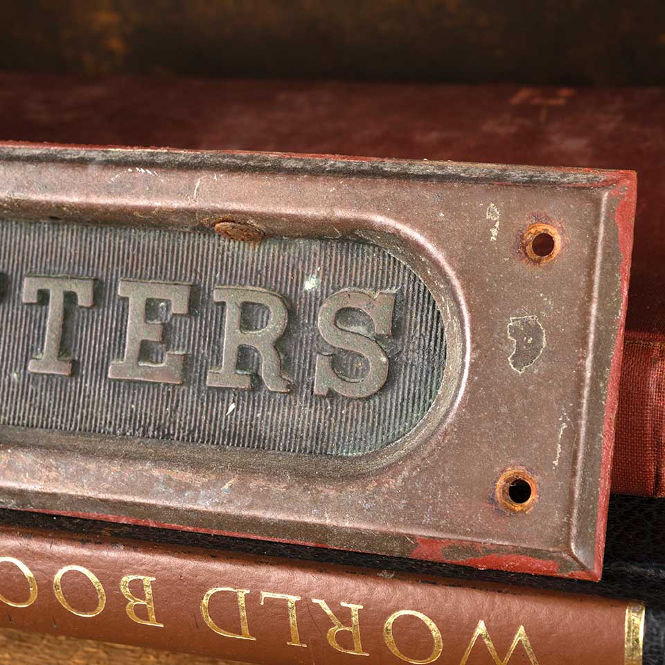 Architectural salvage antique brass entry door mail slot hardware with hinged LETTERS flap measuring approx. 8" wide x 2 1/2" tall x 1/2" front to back with an opening 5 3/4" wide x 1 1/2" tall. See photos to evaluate condition.