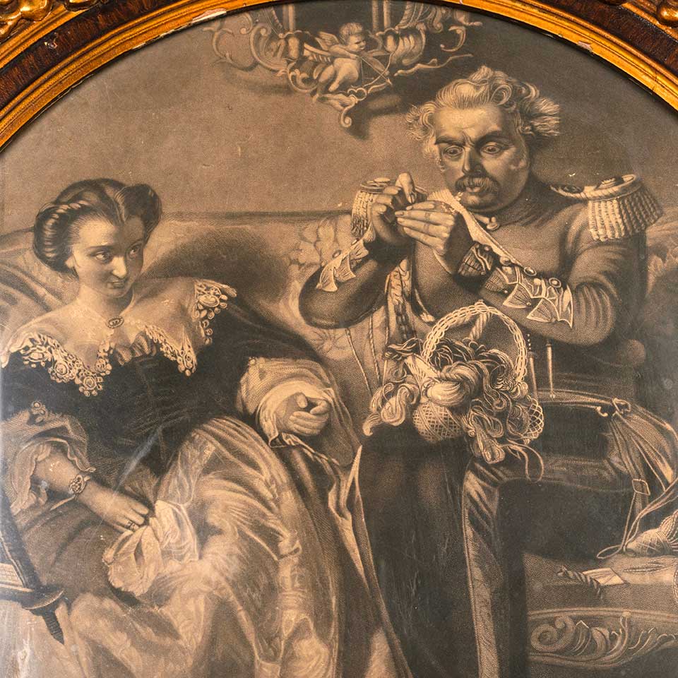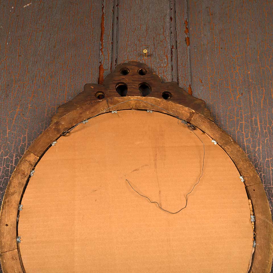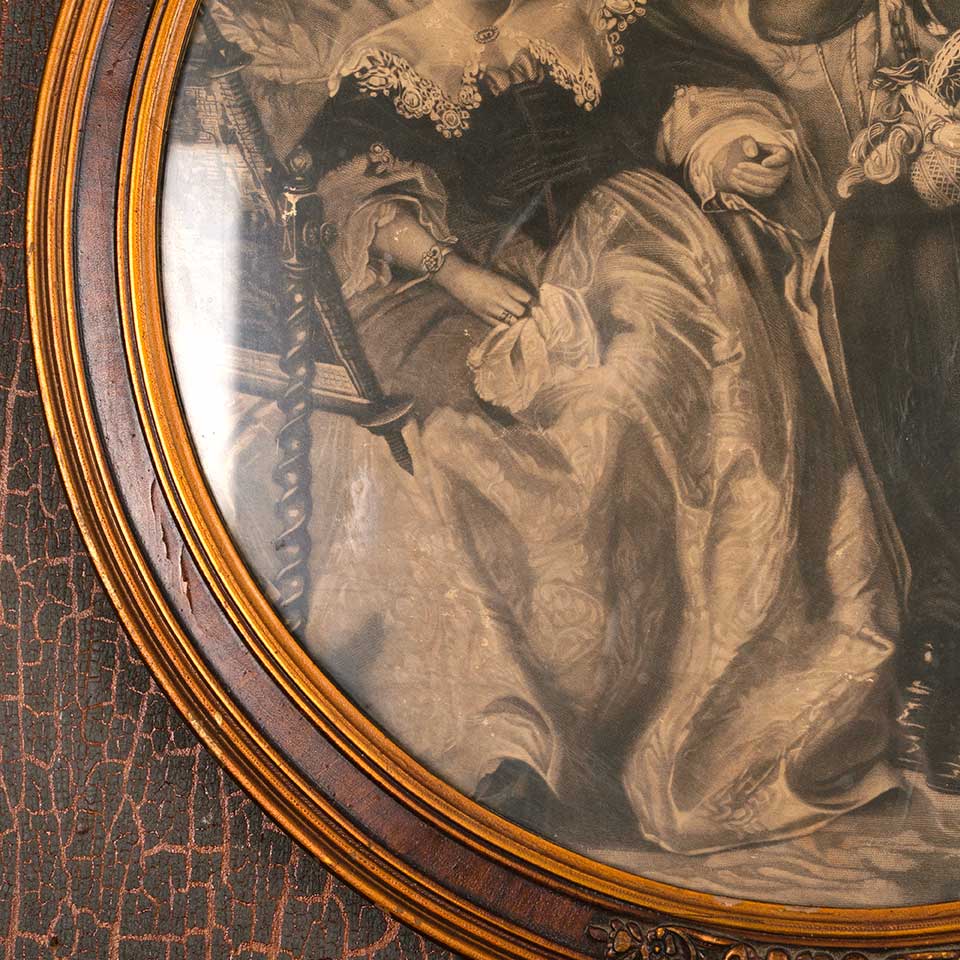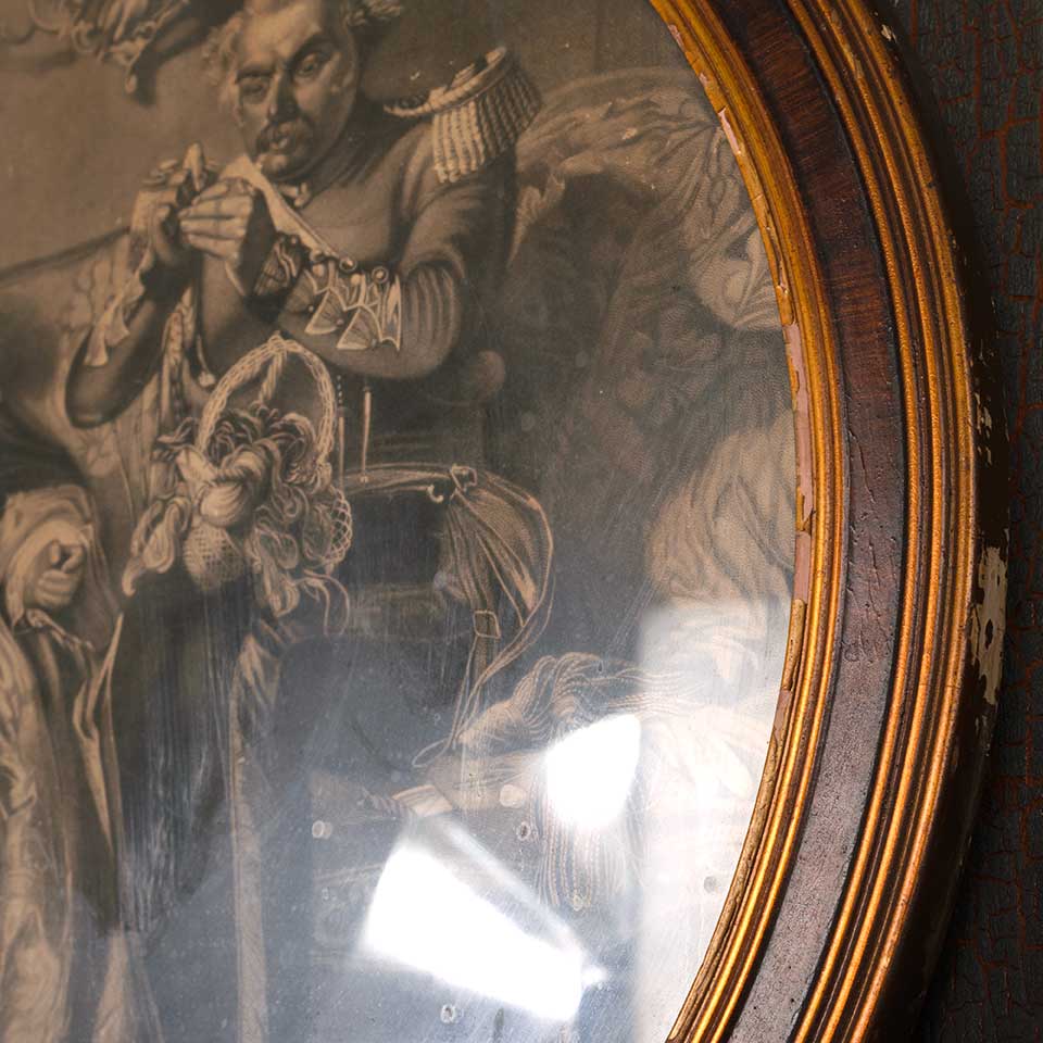 Antique print in ornate round picture frame measuring approx. 17 3/8" wide x 20 7/8" tall x 3/4" front to back. There's some loss of the finish. See photos to evaluate condition.