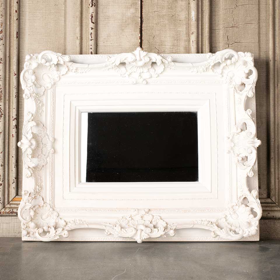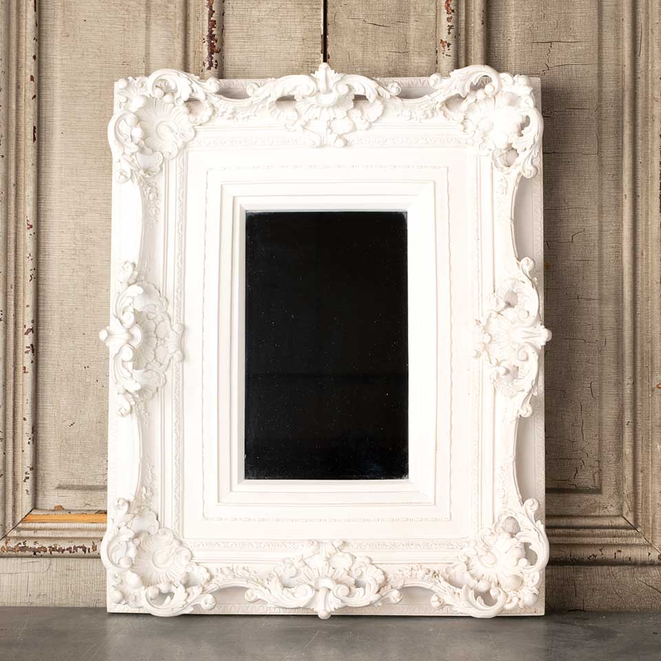 Ornate modern framed wall mirror measuring approx. 17 3/4" x 22 1/4" x 3 1/2" front to back with a 6 3/4" x 11 1/4" mirror. See photos to evaluate condition.