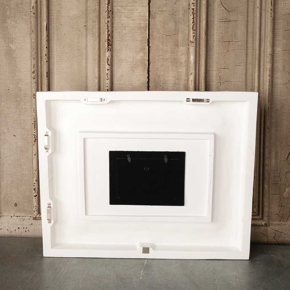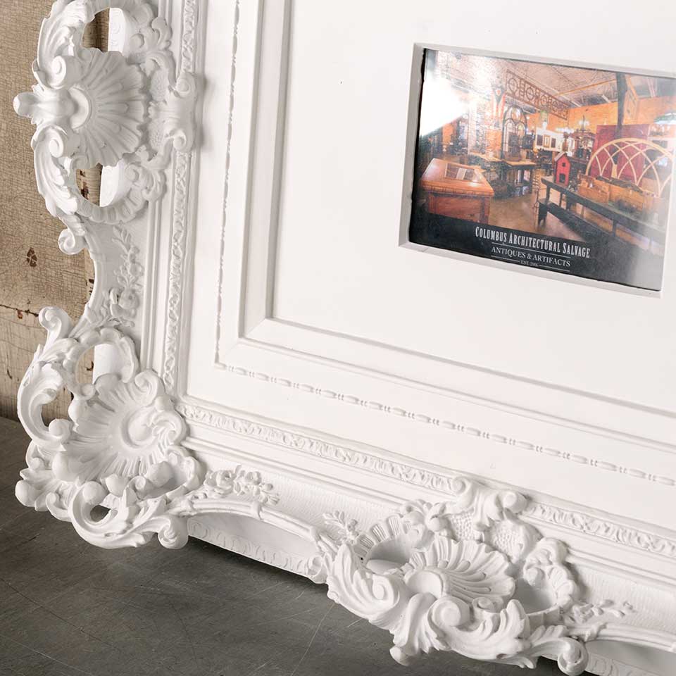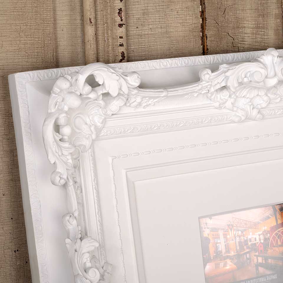 Ornate modern picture frame measuring approx. 22 3/8" x 18" x 3 1/2" front to back with an opening approx. 5 3/4" x 3 3/4". Color and condition may vary.
