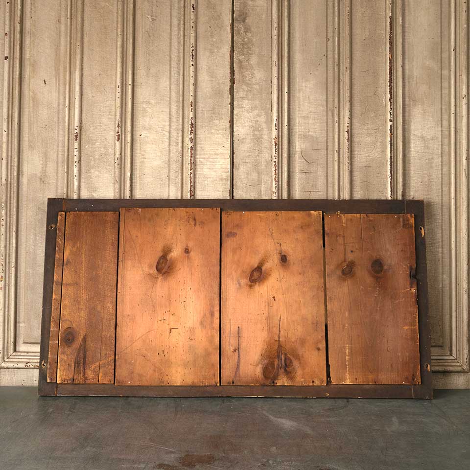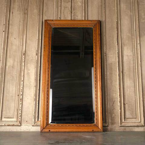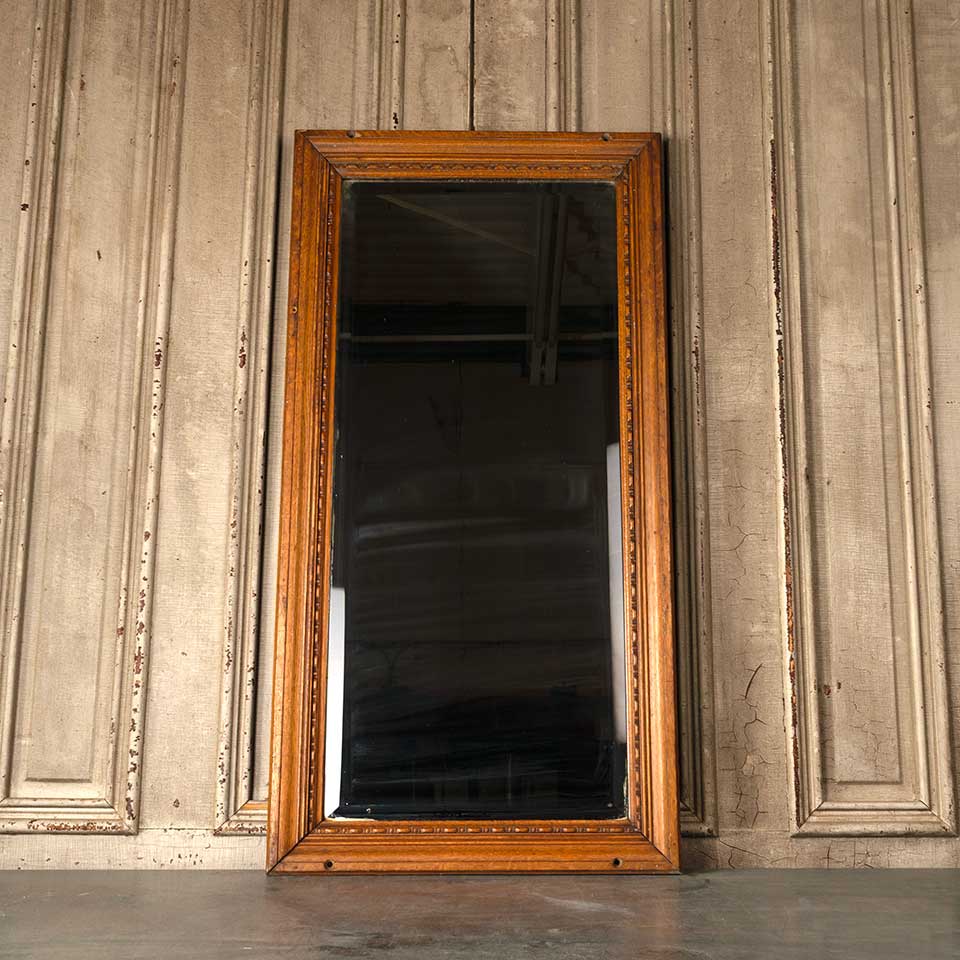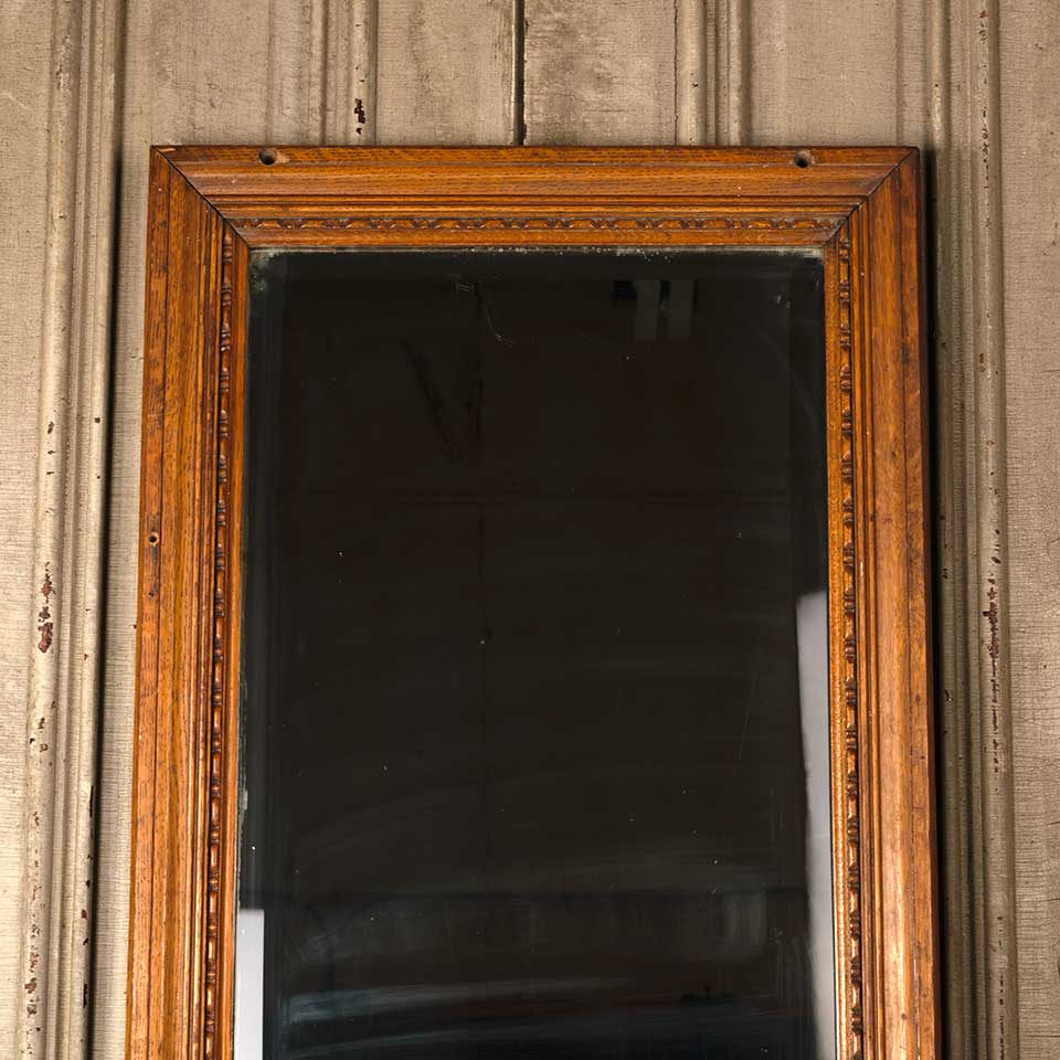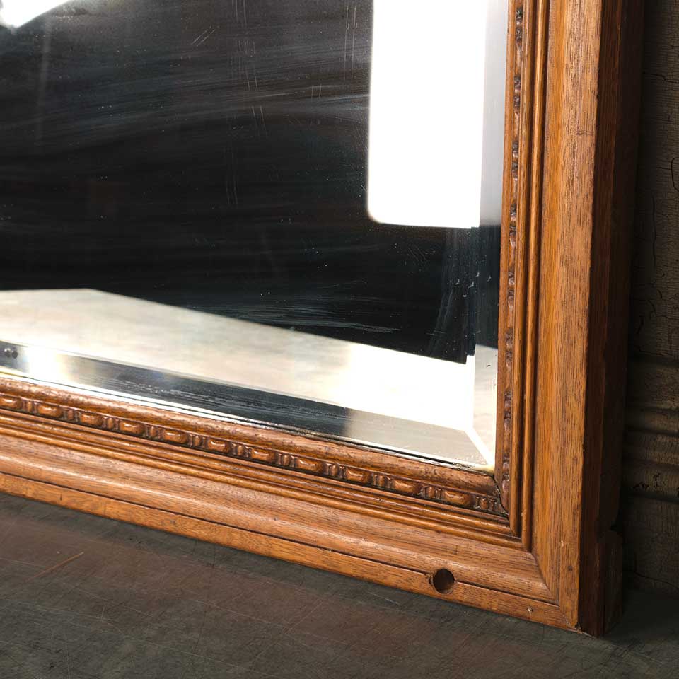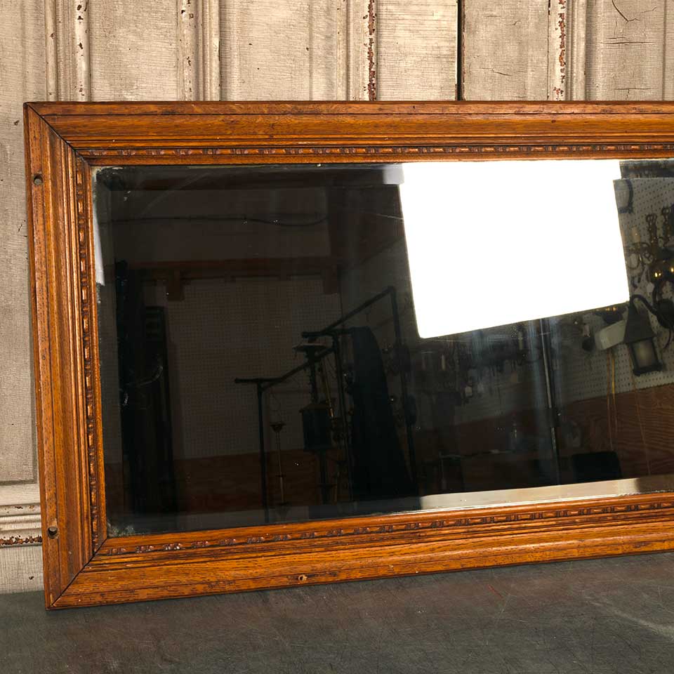 Architectural salvage antique oak wood framed beveled glass mirror measuring approx. 23 1/8" x 45" x 1 3/4" front to back. There are some holes drilled through the frame. See photos to evaluate condition.