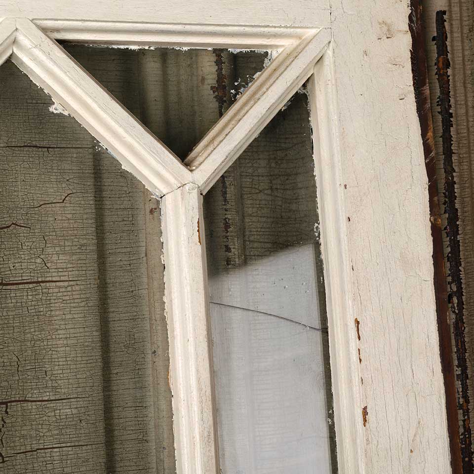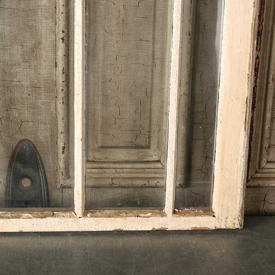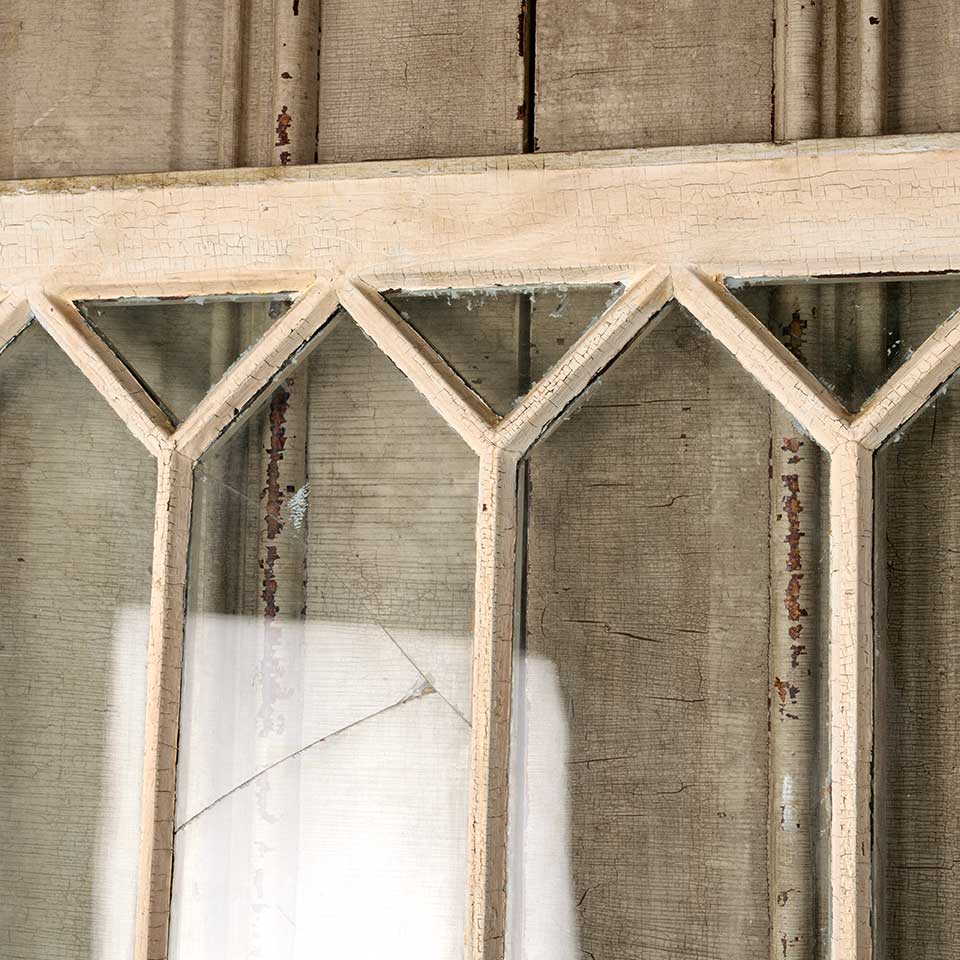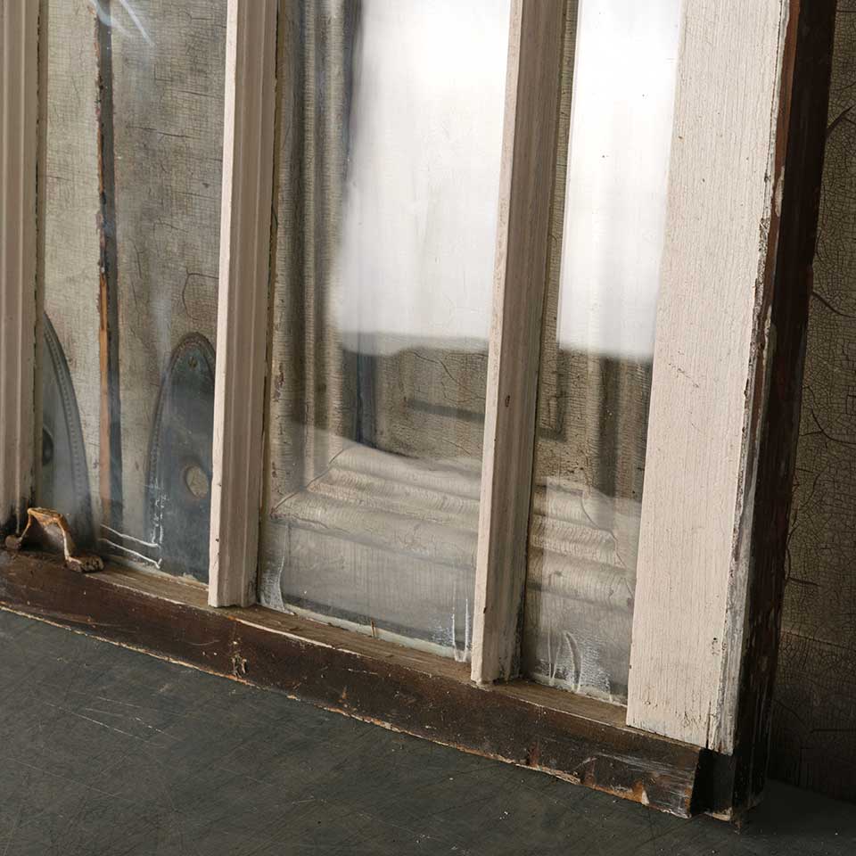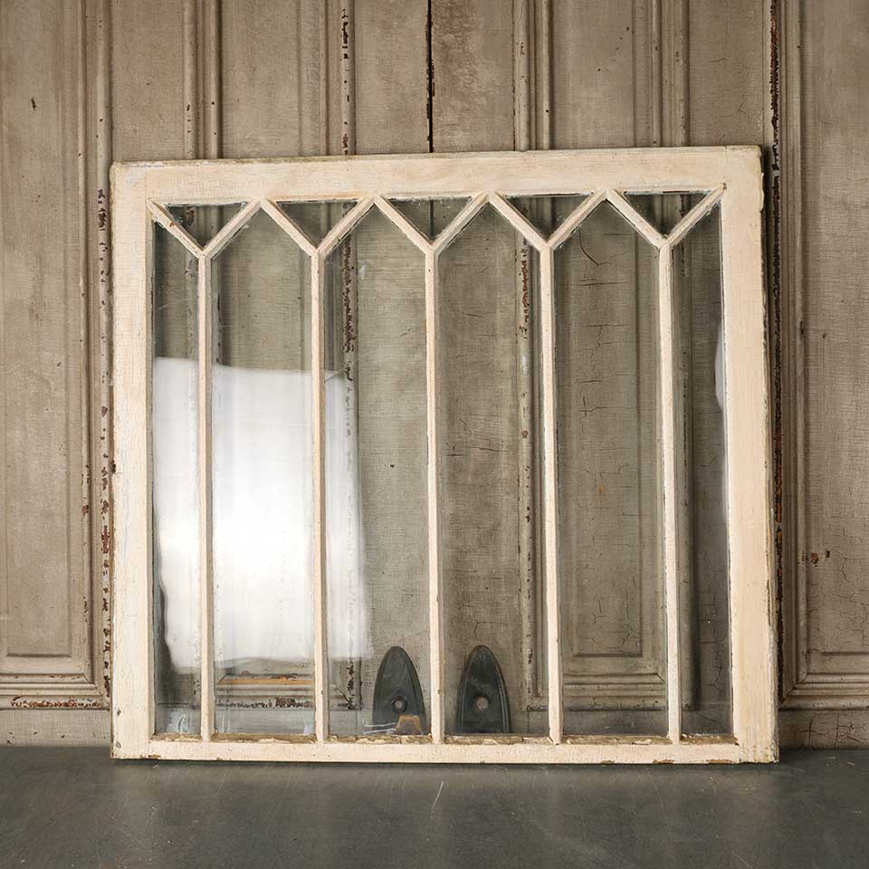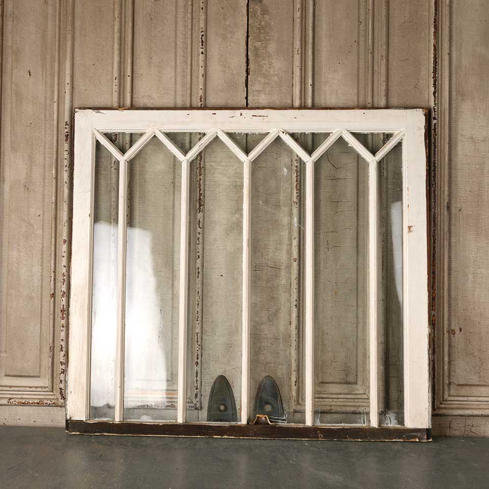 Architectural salvage antique divided lite wood window sash measuring approx. 36 1/4" wide x 33 1/4" tall x 1 3/8" thick. Two of the glass panes are cracked. See photos to evaluate condition.