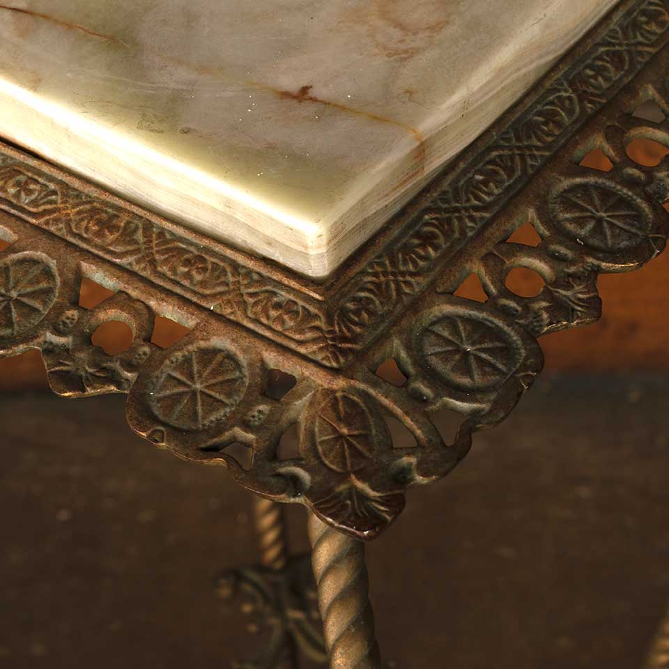 Ornate antique brass plant stand with removable marble top measuring approx. 12 1/4" x 12 1/4" x 29 1/4" tall. See photos to evaluate condition.
