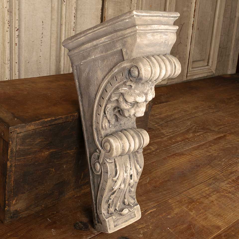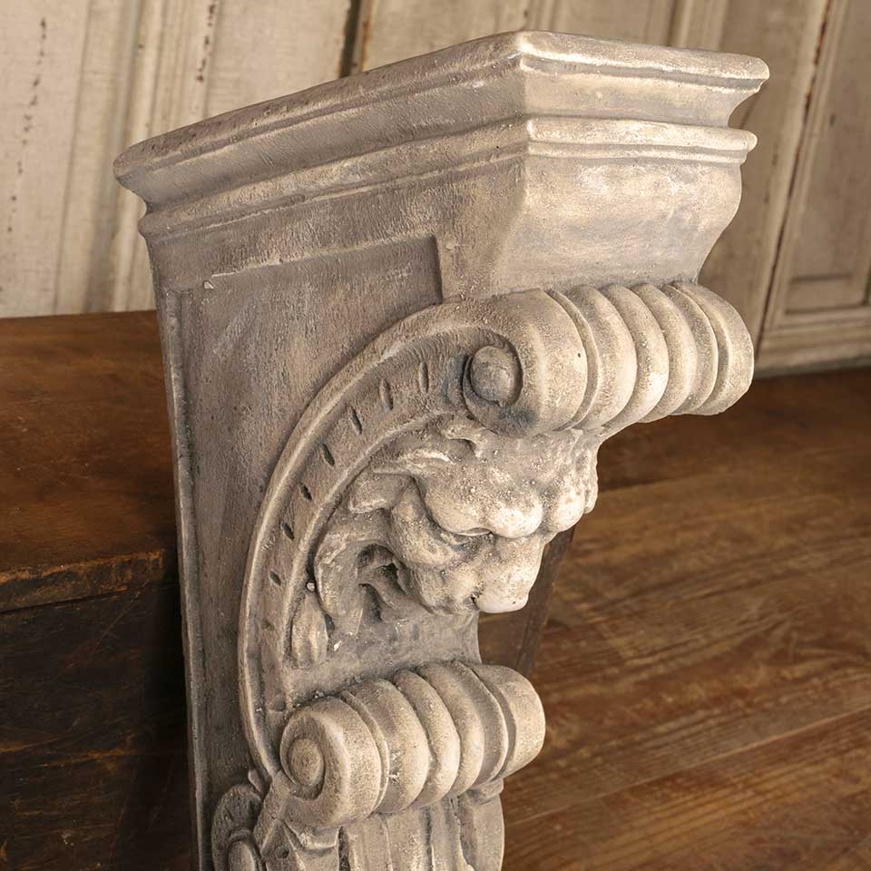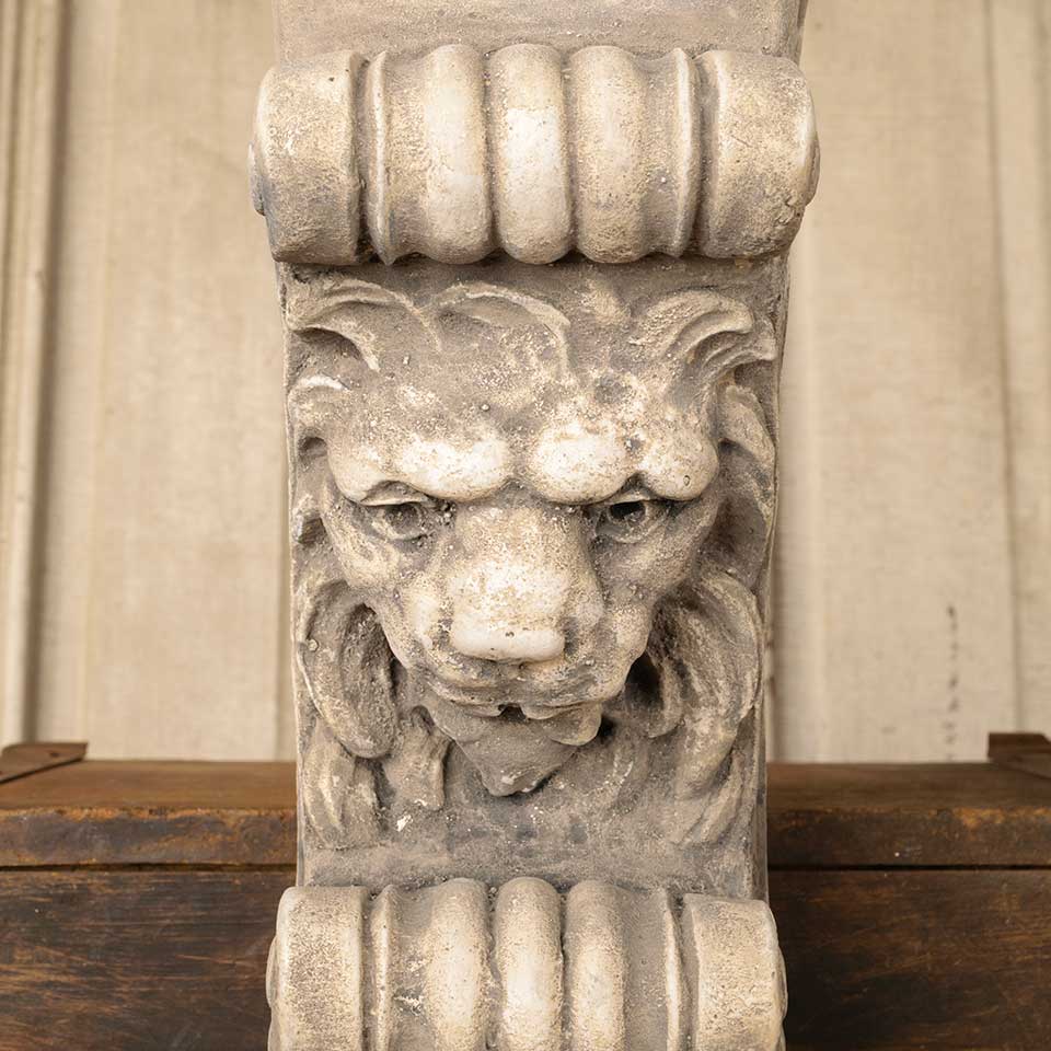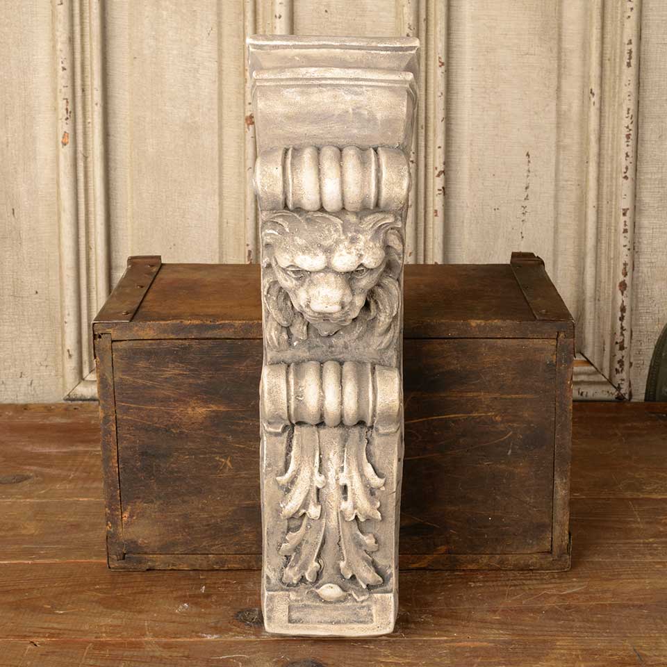 Cast plaster architectural lion bracket wall hanging measuring approx. 4 1/2" wide x 14 1/2" tall x 7 7/8" front to back. Color and condition may vary.