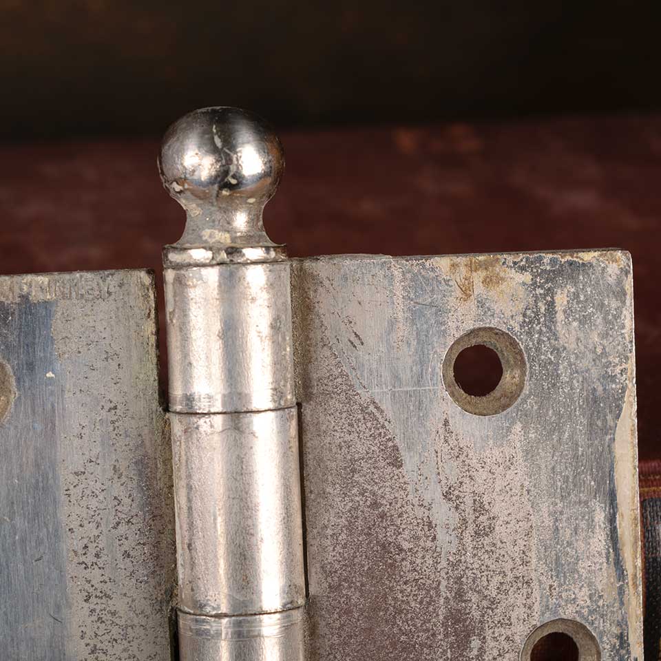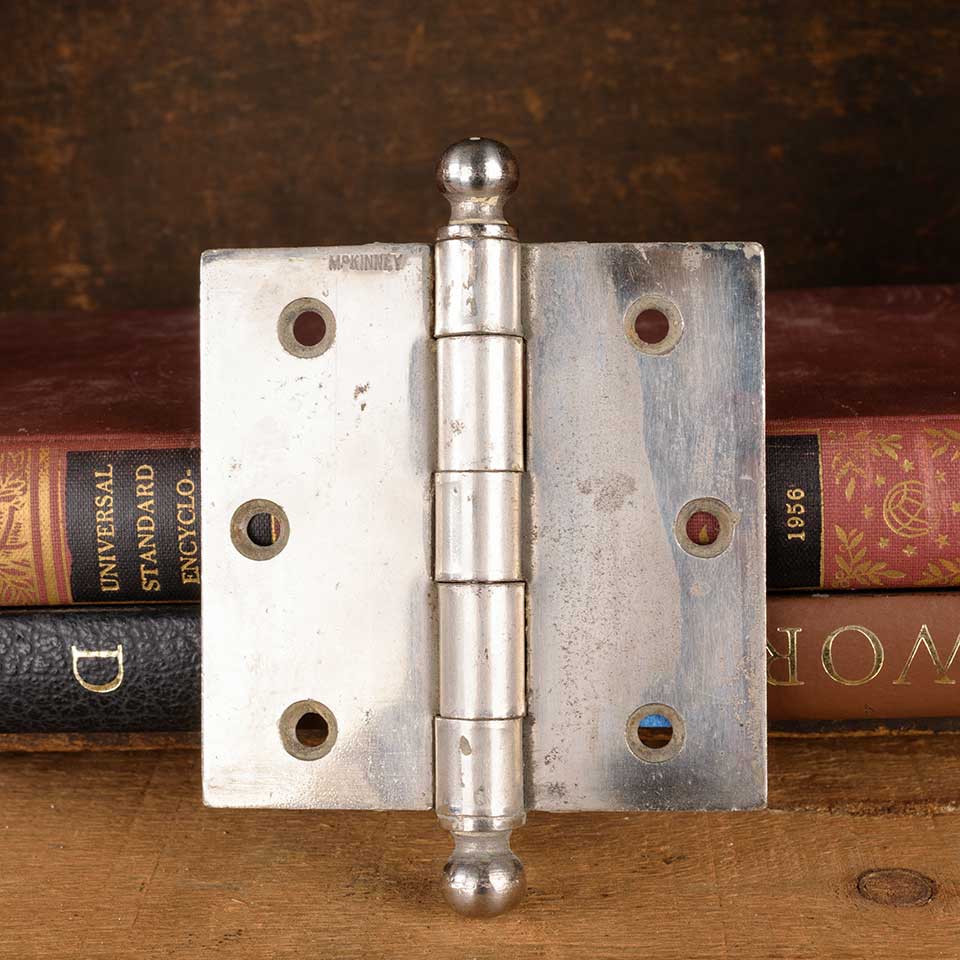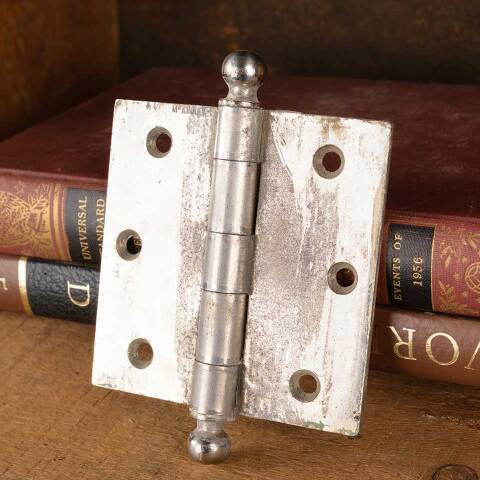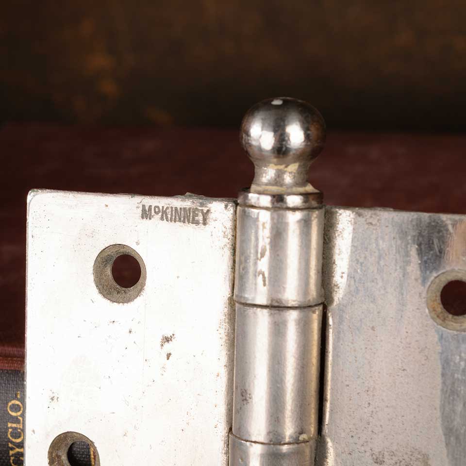 Architectural salvage McKinney chrome-plated door butt hinge with ball finials measuring approx. 3" square (4 3/4" tall including finials). Color and condition may vary.