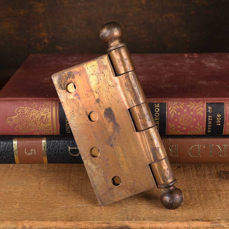Architectural salvage antique steel door butt hinge hardware with ball finials measuring approx. 4" square (5 1/2" tall including finials). Color and condition may vary.