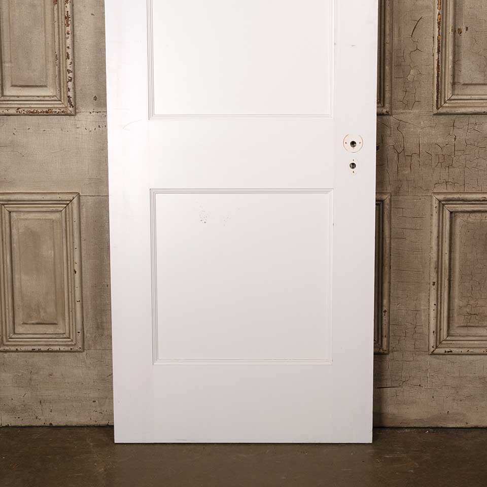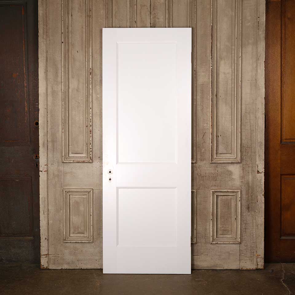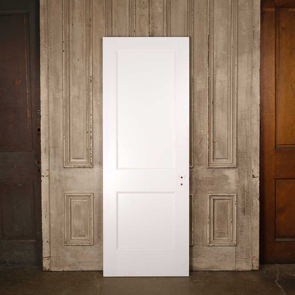 Architectural salvage painted two panel interior door with mortise lock measuring approx. 27 3/4" wide x 77 3/8" tall x 1 3/8" thick. This is not an antique door. See photos to evaluate condition.