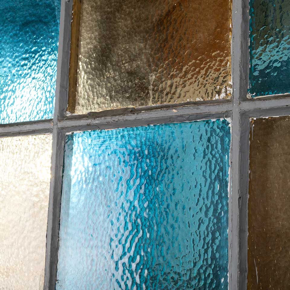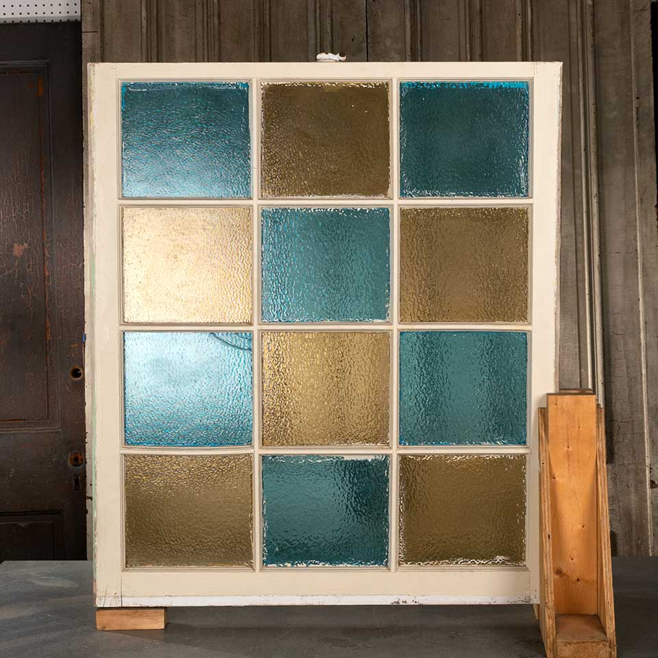 Architectural salvage antique divided twelve lite colored glass window sash measuring approx. 34 3/8" wide x 40" tall x 1 3/8" thick. Color and condition may vary.