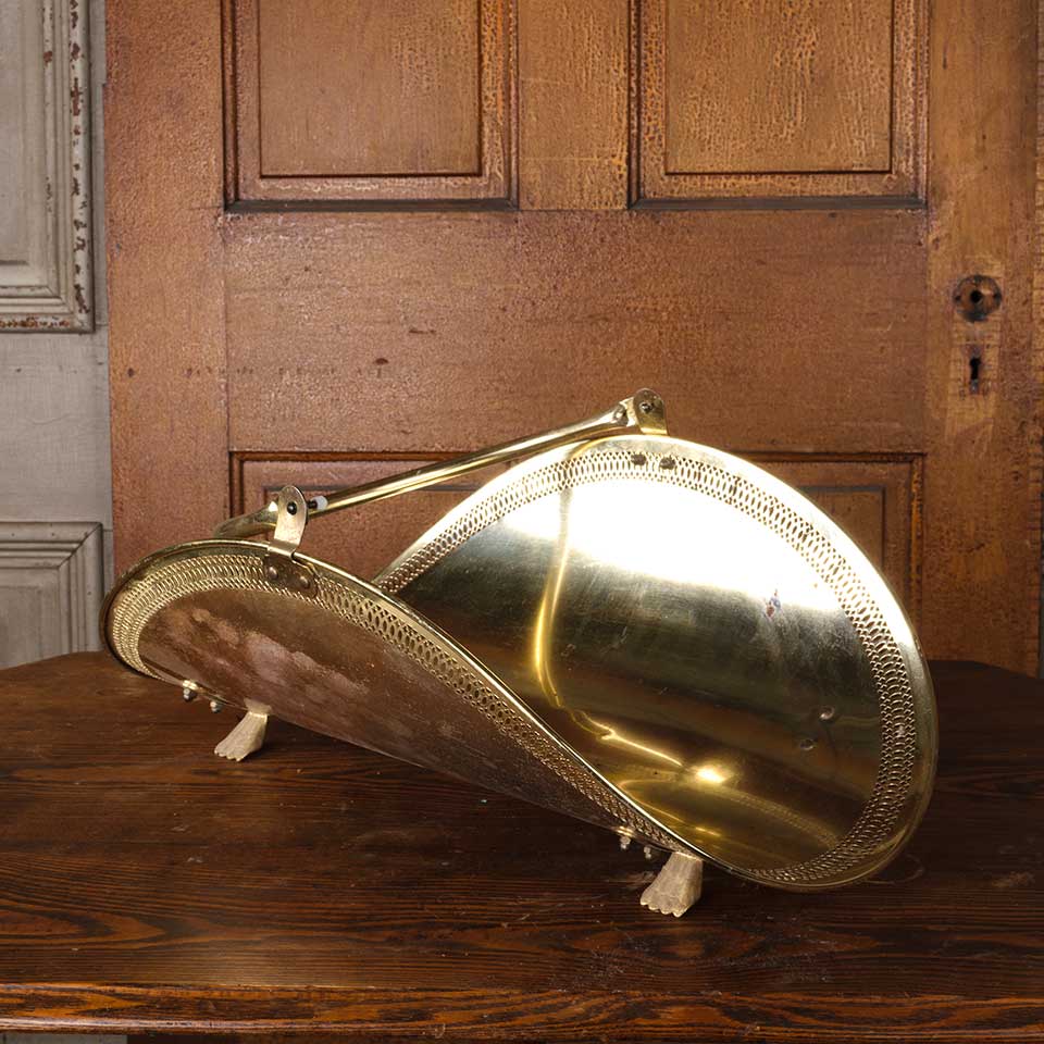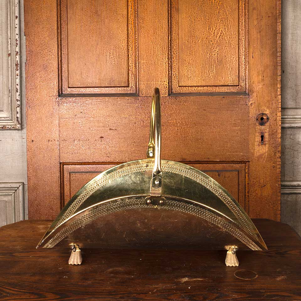 Vintage metal footed fireside log holder basket with handle measuring approx. 14" wide x 16" tall (with handle all the way up) x 21" front to back. See photos to evaluate condition.