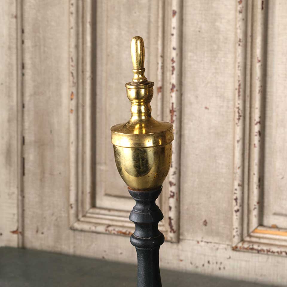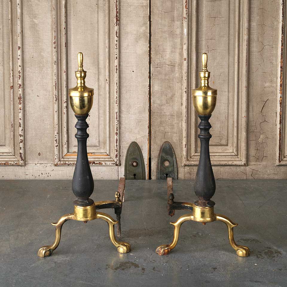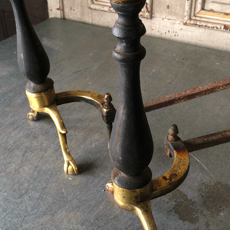 Pair of architectural salvage vintage brass and cast iron fireplace andirons each measuring approx. 9 1/8" wide x 19 3/4" tall x 16 1/8" front to back. See photos to evaluate condition. Priced at $65 for the pair.