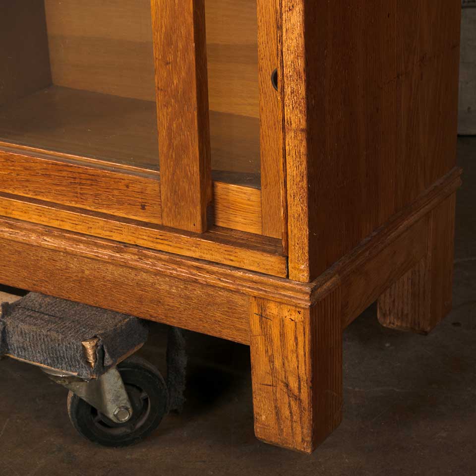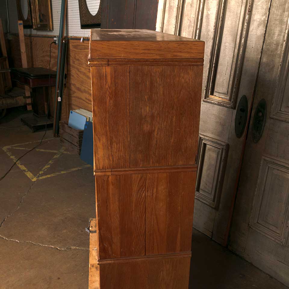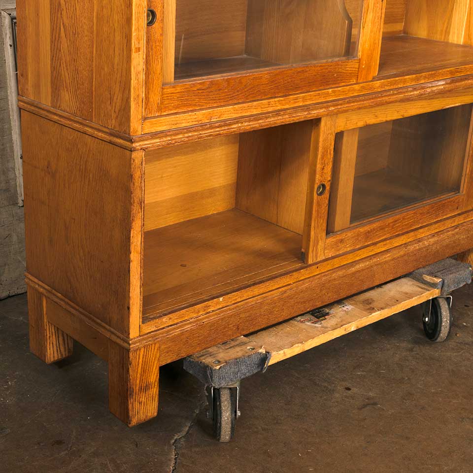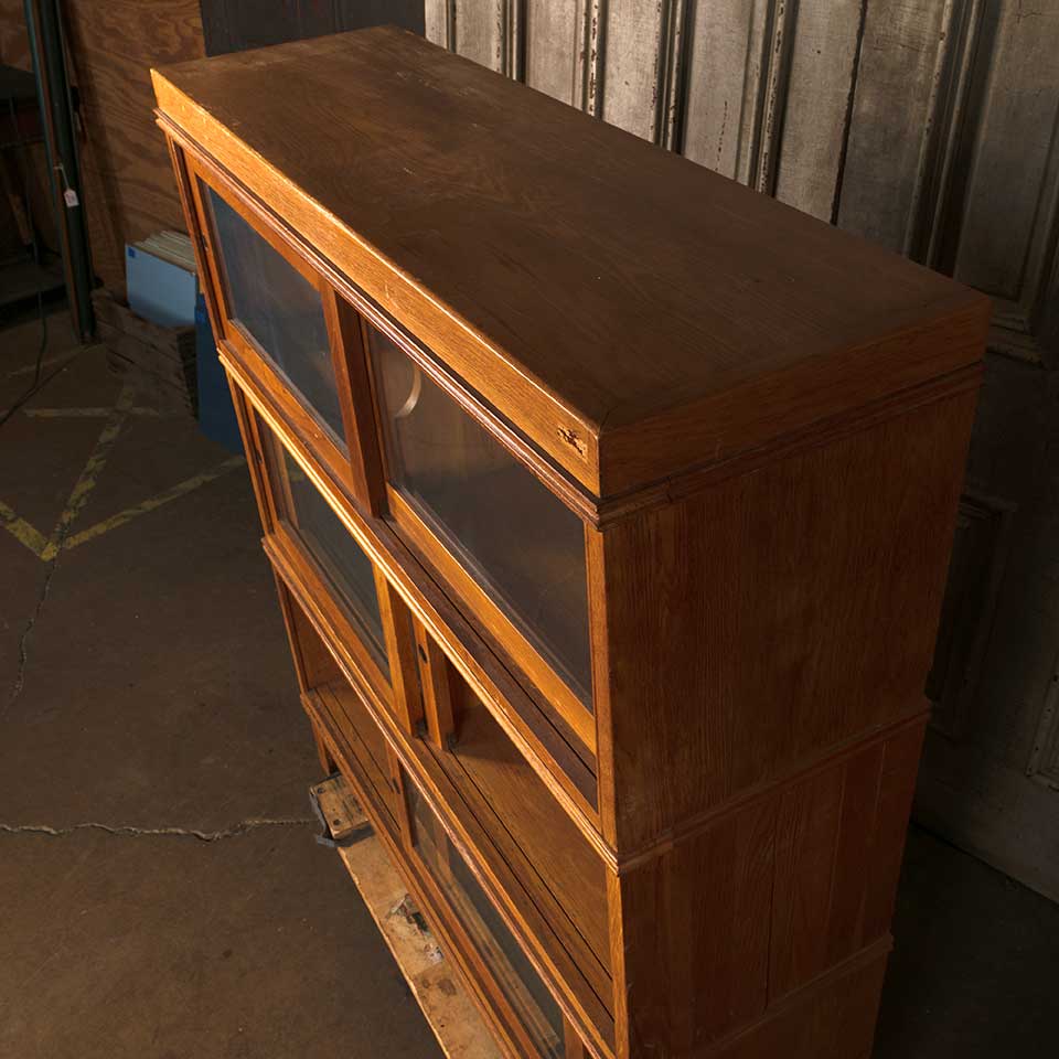 Architectural salvage vintage mid century modern five piece stackable wood bookcase unit with sliding glass doors measuring approx. 43 1/4" wide x 49 1/4" tall x 13 1/4" front to back. The unit consists of a top, three shelving units, and a base. This piece was used at The Ohio State University. See photos to evaluate condition.