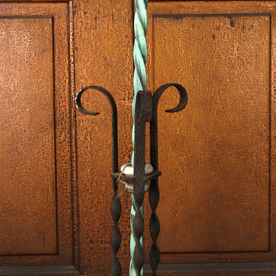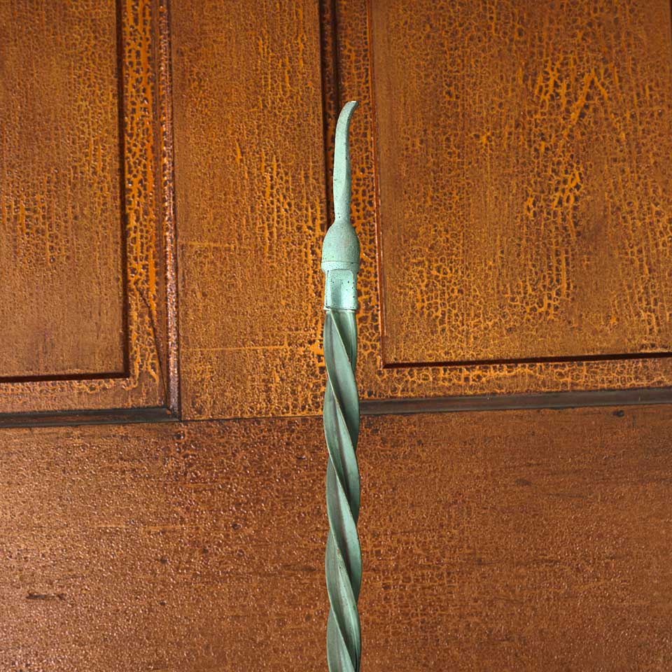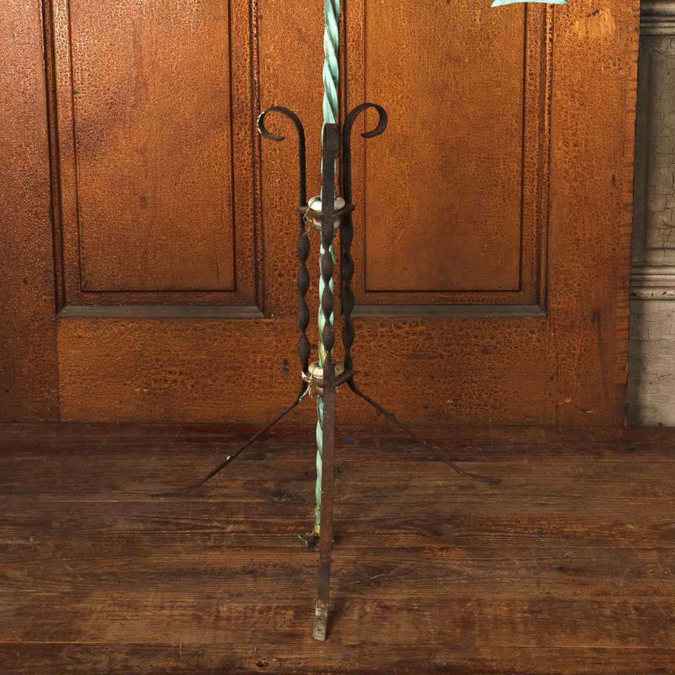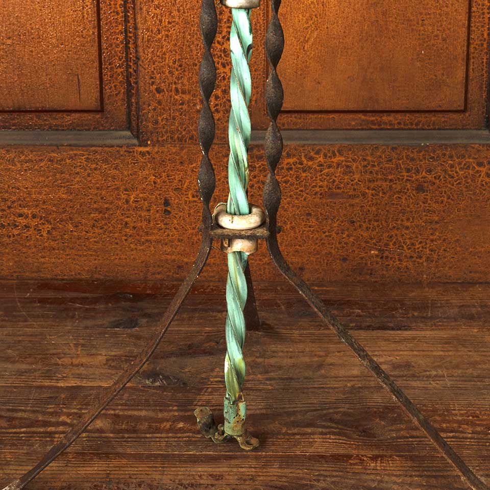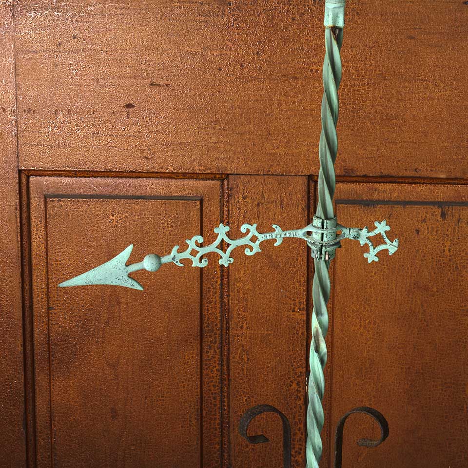 Architectural salvage antique spiraled copper lighting rod with directional arrow and wrought iron stand base measuring approx. 44 5/8" tall with an 11 1/2" diameter base. It appears that the tail of the directional arrow was broken off at some point in the piece's history. See photos to evaluate condition.
