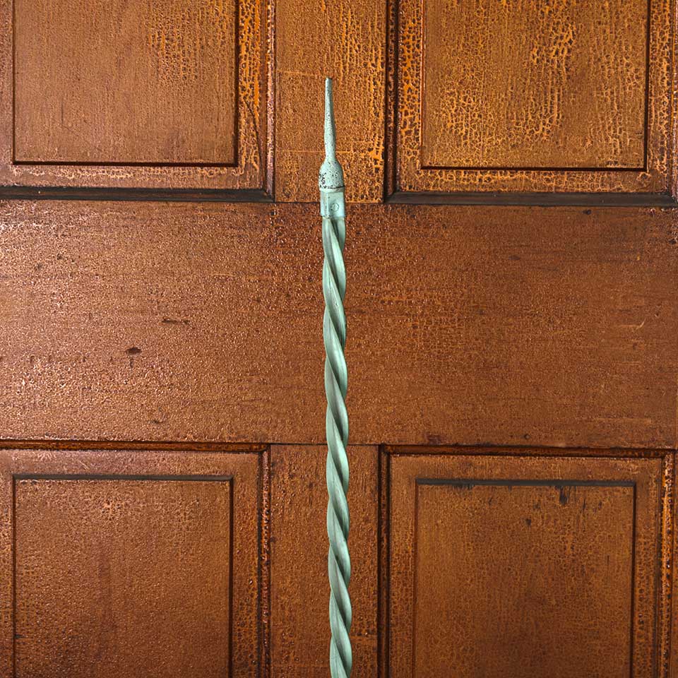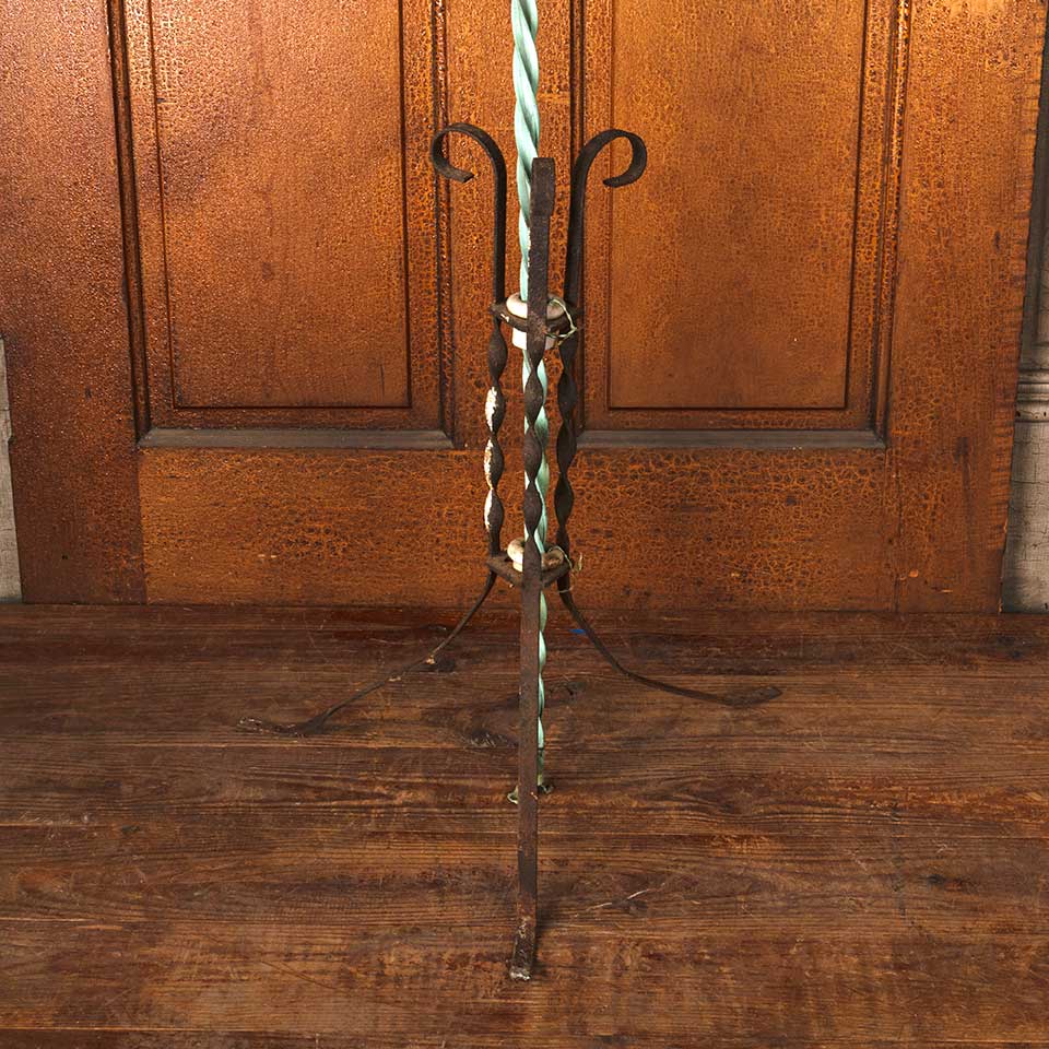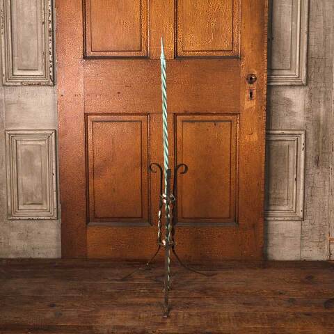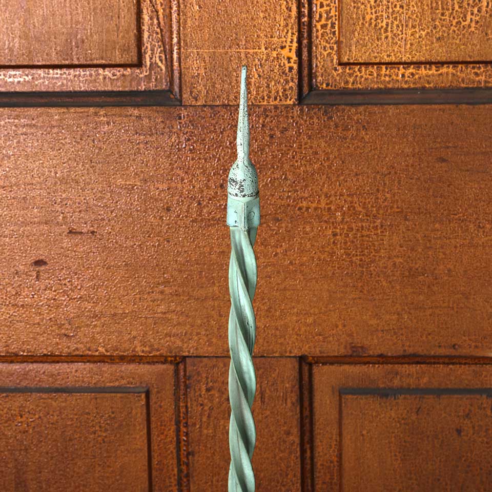 Architectural salvage antique spiraled copper lighting rod and wrought iron stand base measuring approx. 44" tall with a 10 1/2" diameter base. See photos to evaluate condition.