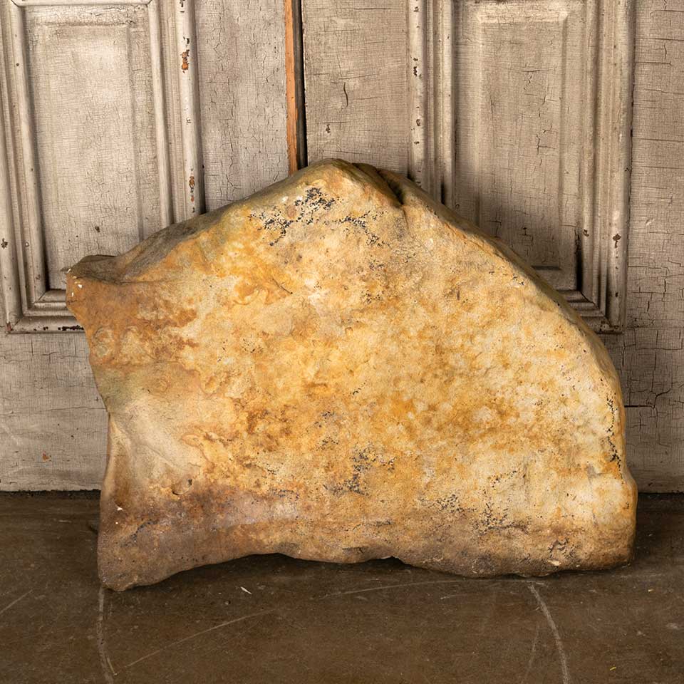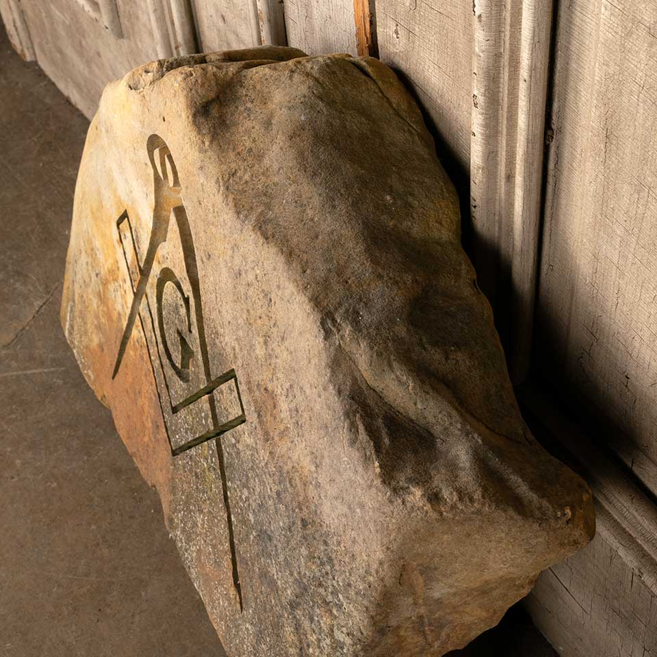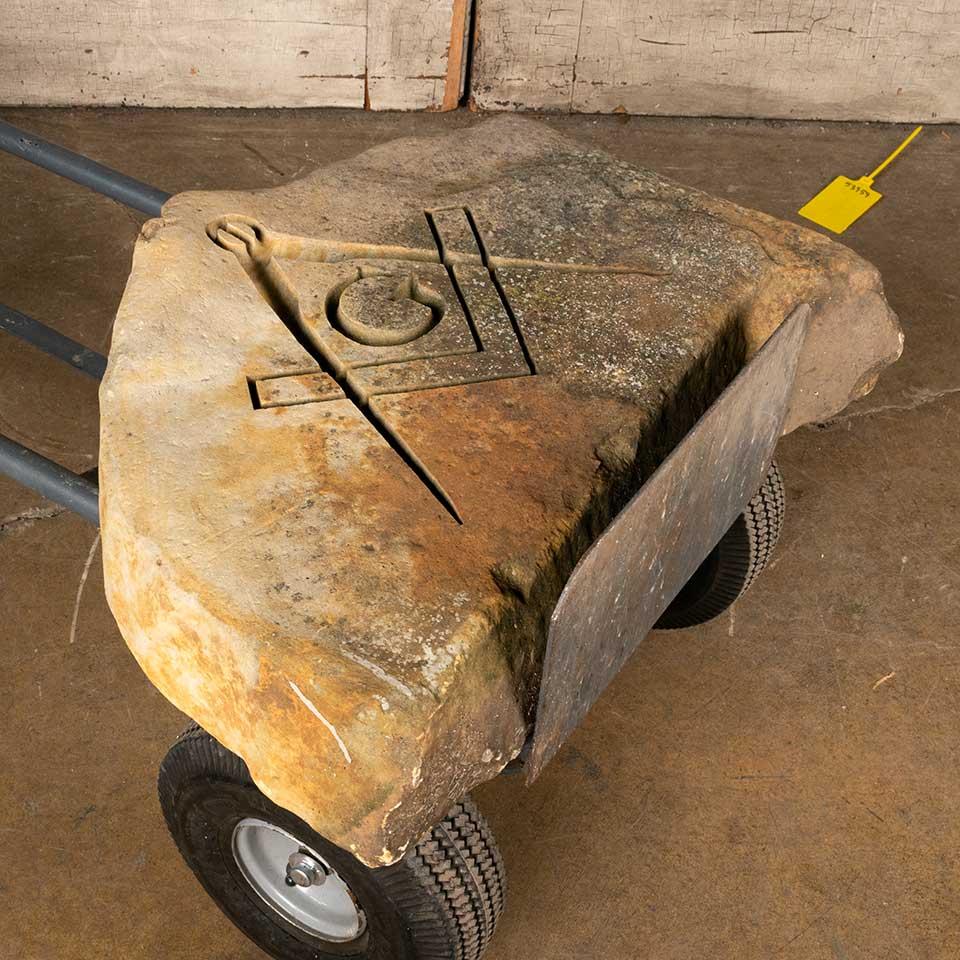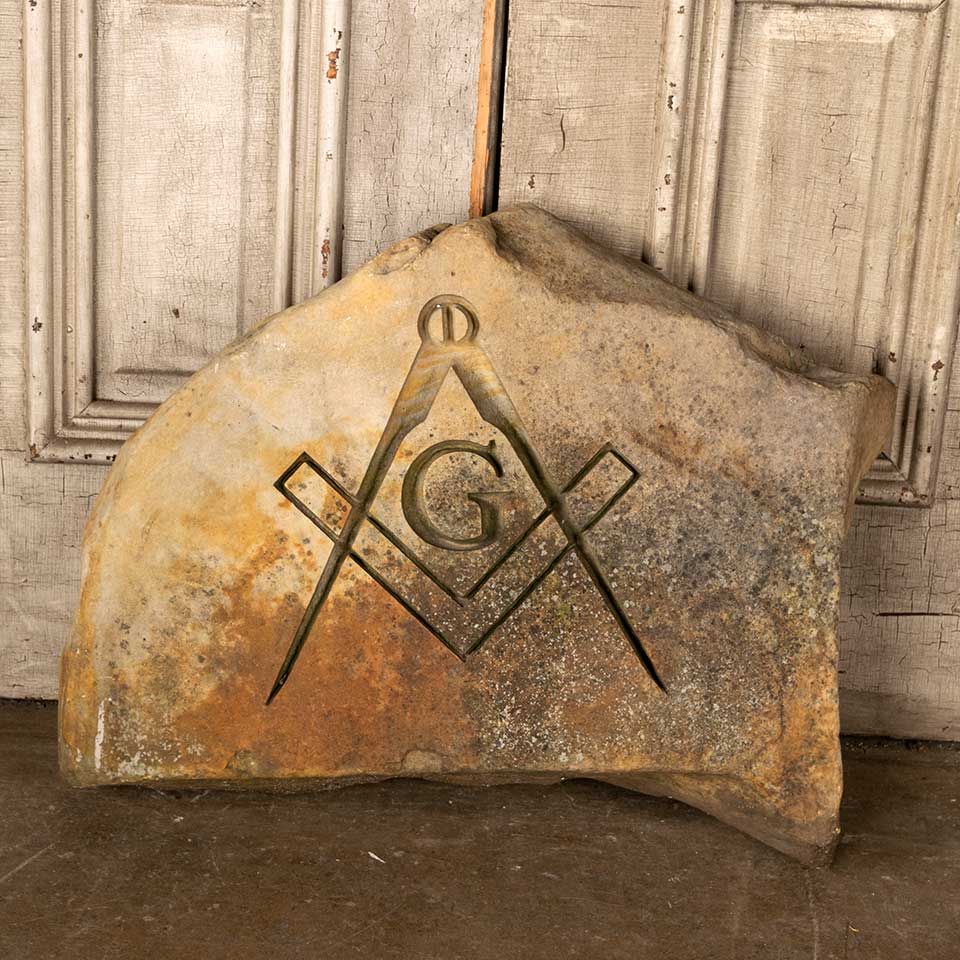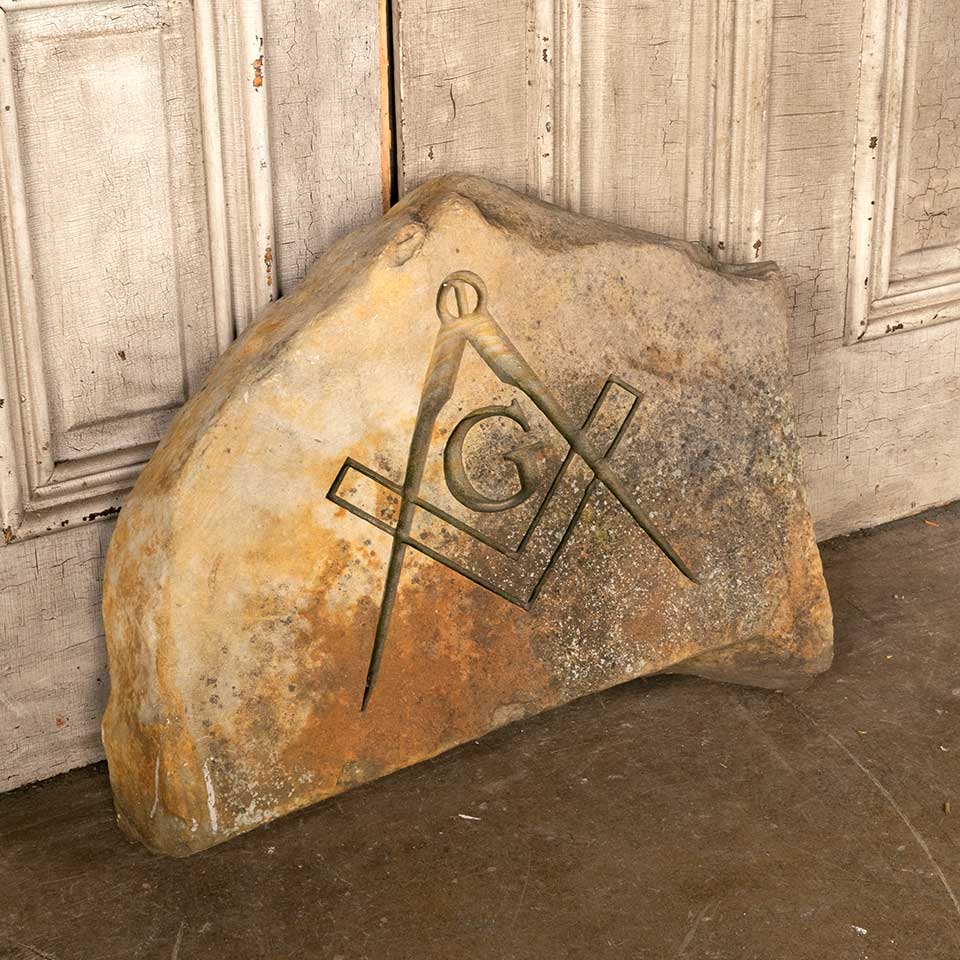 Carved sandstone garden rock with Freemason Masonic emblem featuring a square and compass measuring approx. 25 3/4" wide x 21" tall x 5" front to back. See photos to evaluate condition.
