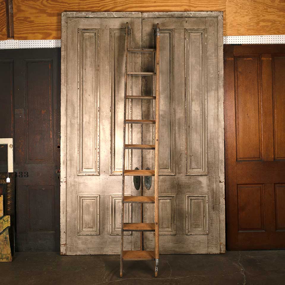 Architectural salvage nine rung oak wood library step ladder with handle measuring approx. 14" wide x 105 1/4" tall x 8 1/2" front to back. See photos to evaluate condition.