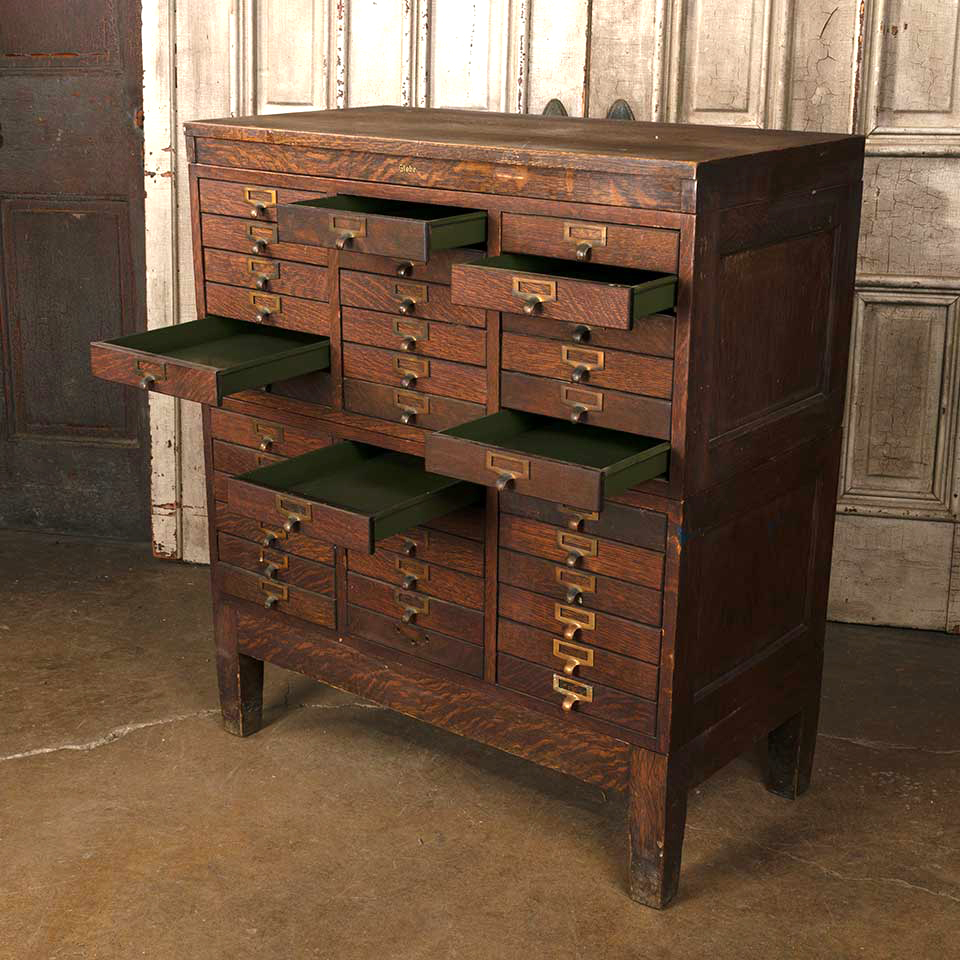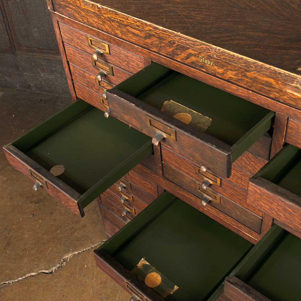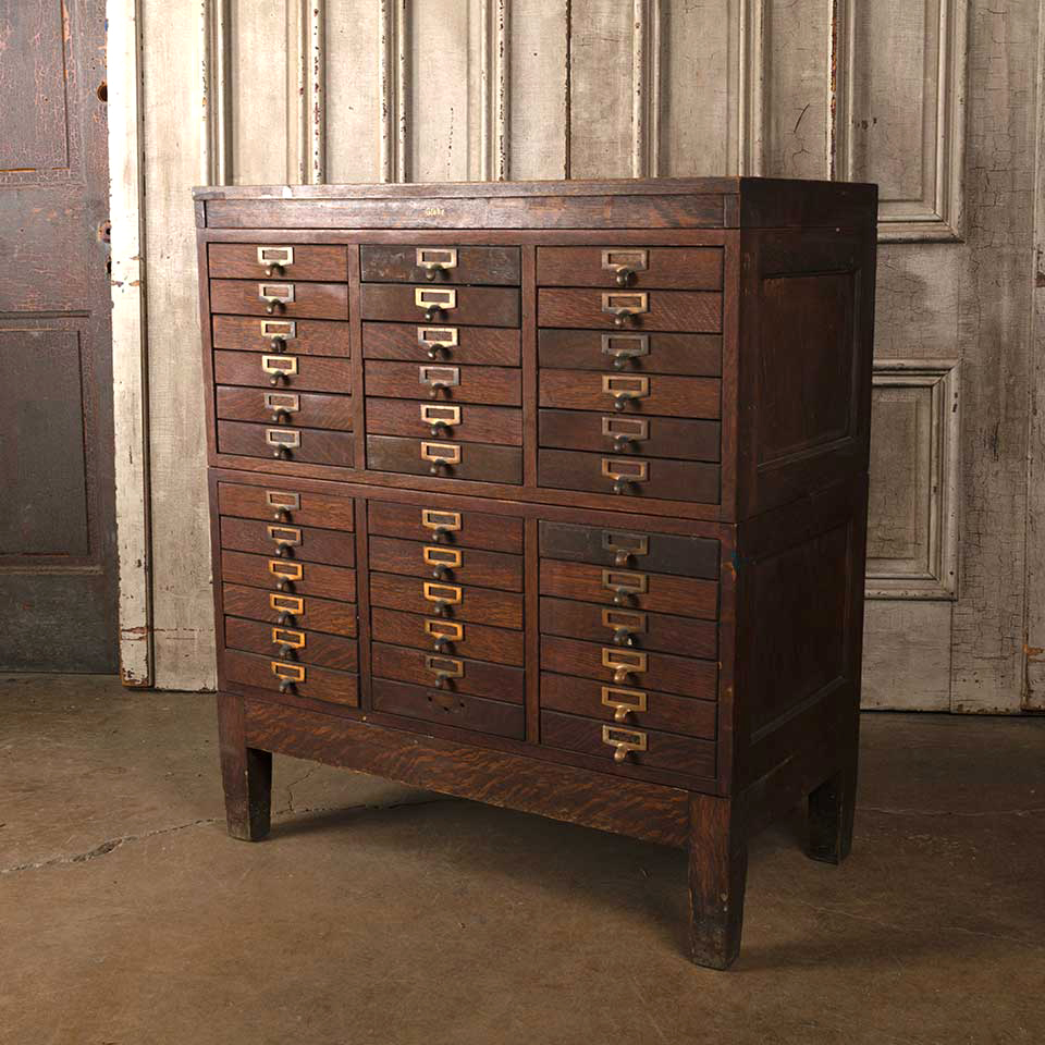 Antique Globe four piece oak stackable 36 drawer storage unit measuring approx. 33" wide x 38" tall x 17 1/4" front to back. The set includes a top, two 18 drawer units, and a base. One of the brass label handles is missing. See photos to evaluate condition.