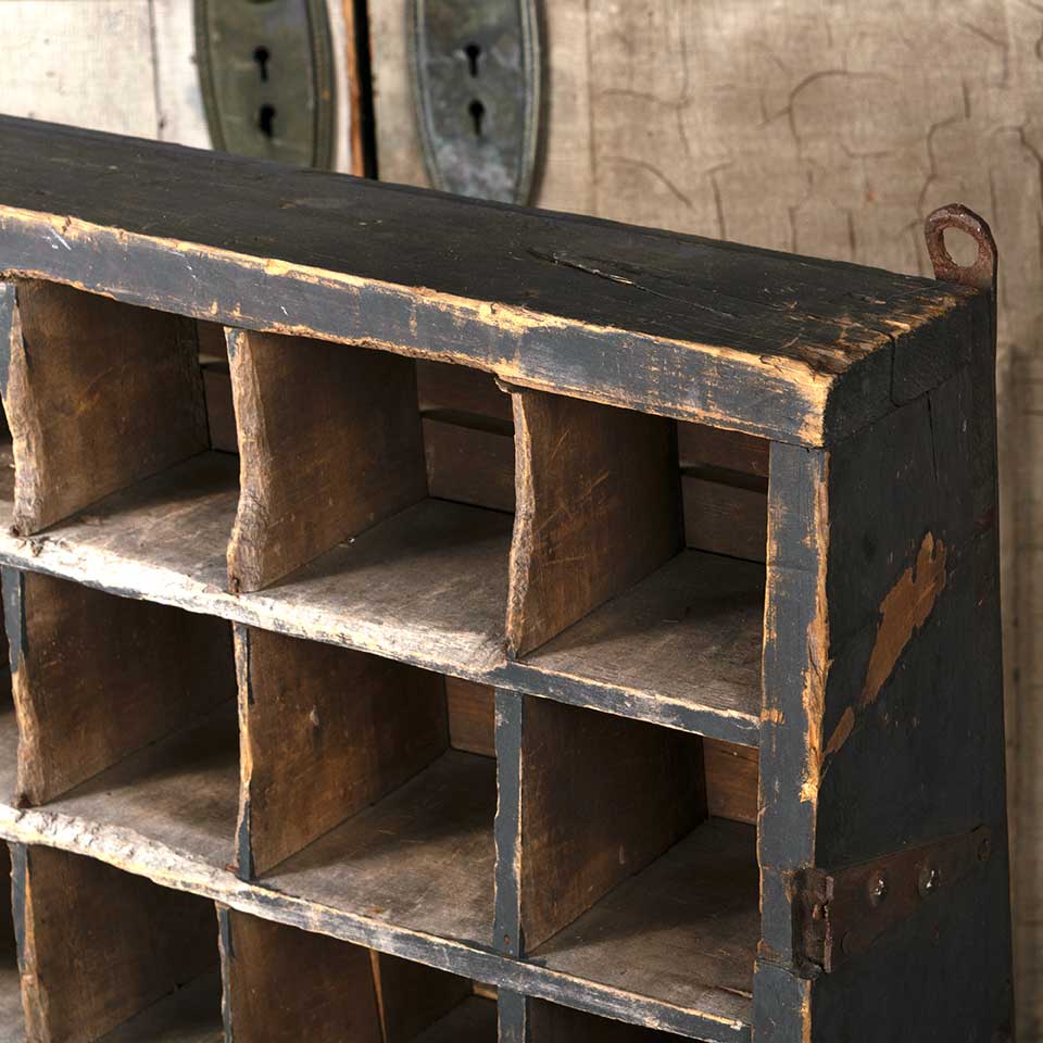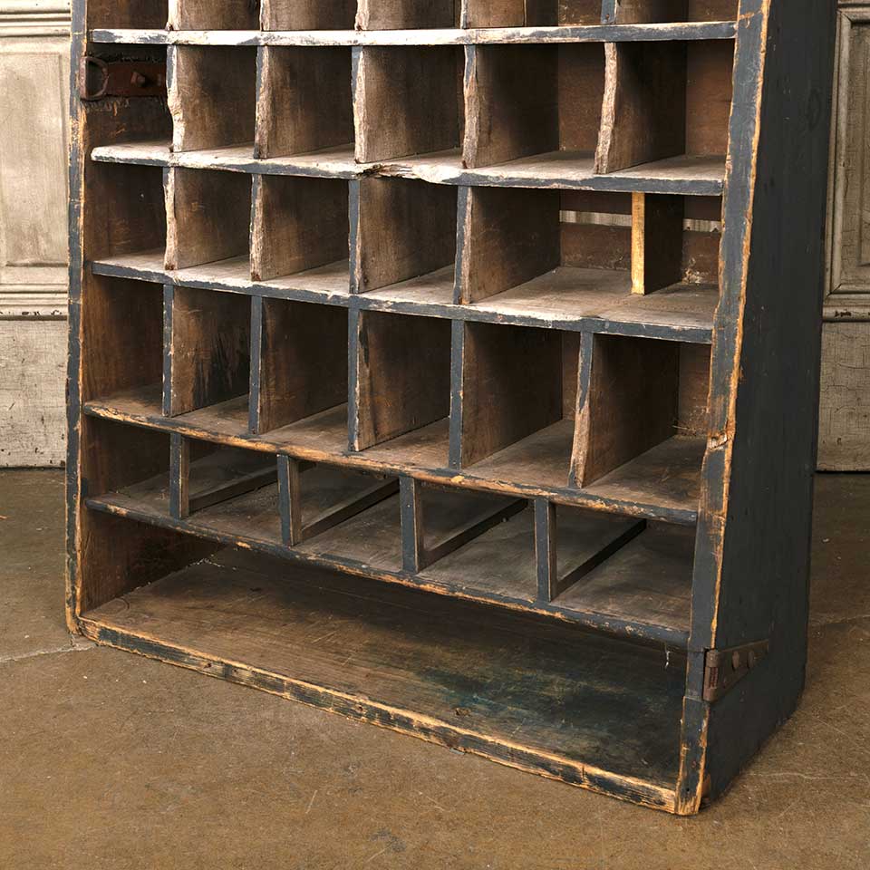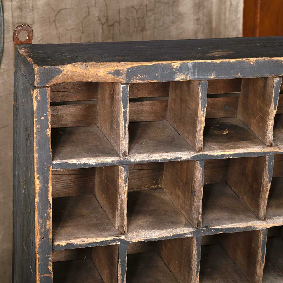 Antique primitive painted wood wall hung wood cubby cabinet unit measuring approx. 28 1/4" wide x 38 1/4" tall x 10 1/4" front to back. There's some missing and loose material. See photos to evaluate condition.