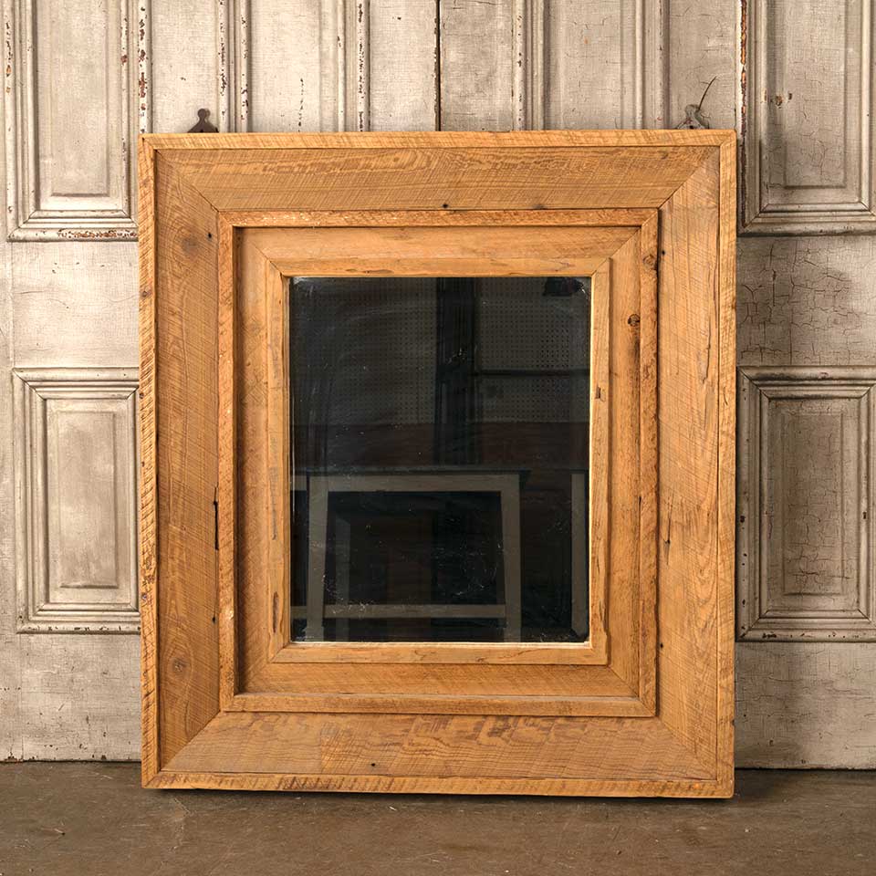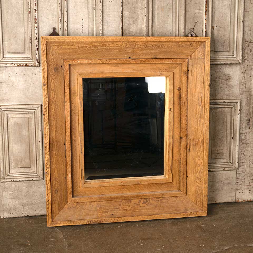 Salvaged rustic wood framed beveled glass wall mirror measuring approx. 36 7/8" wide x 41" tall x 5 3/8" front to back. There's some marks on the mirror. See photos to evaluate condition.