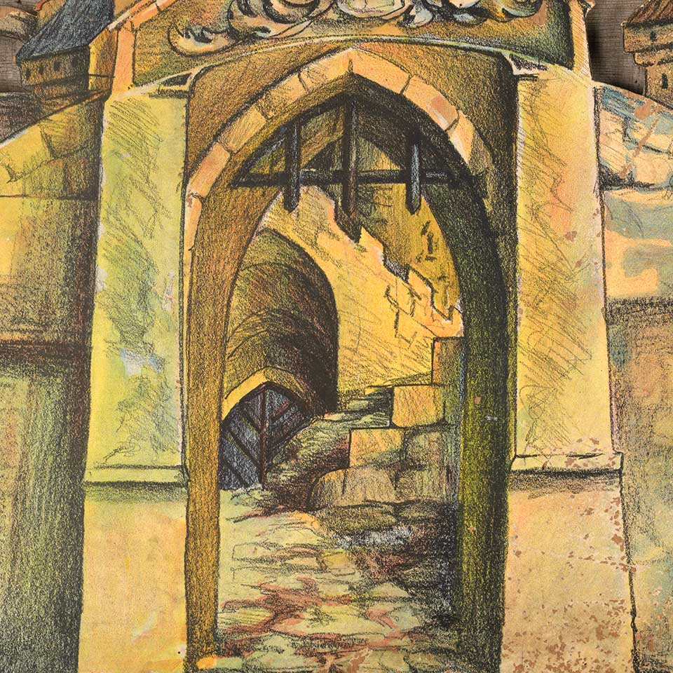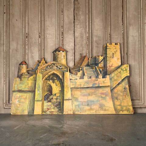 Antique castle scene stage prop painted on wood measuring approx. 47 1/2" wide x 28" tall x 1/8" front to back. See photos to evaluate condition.